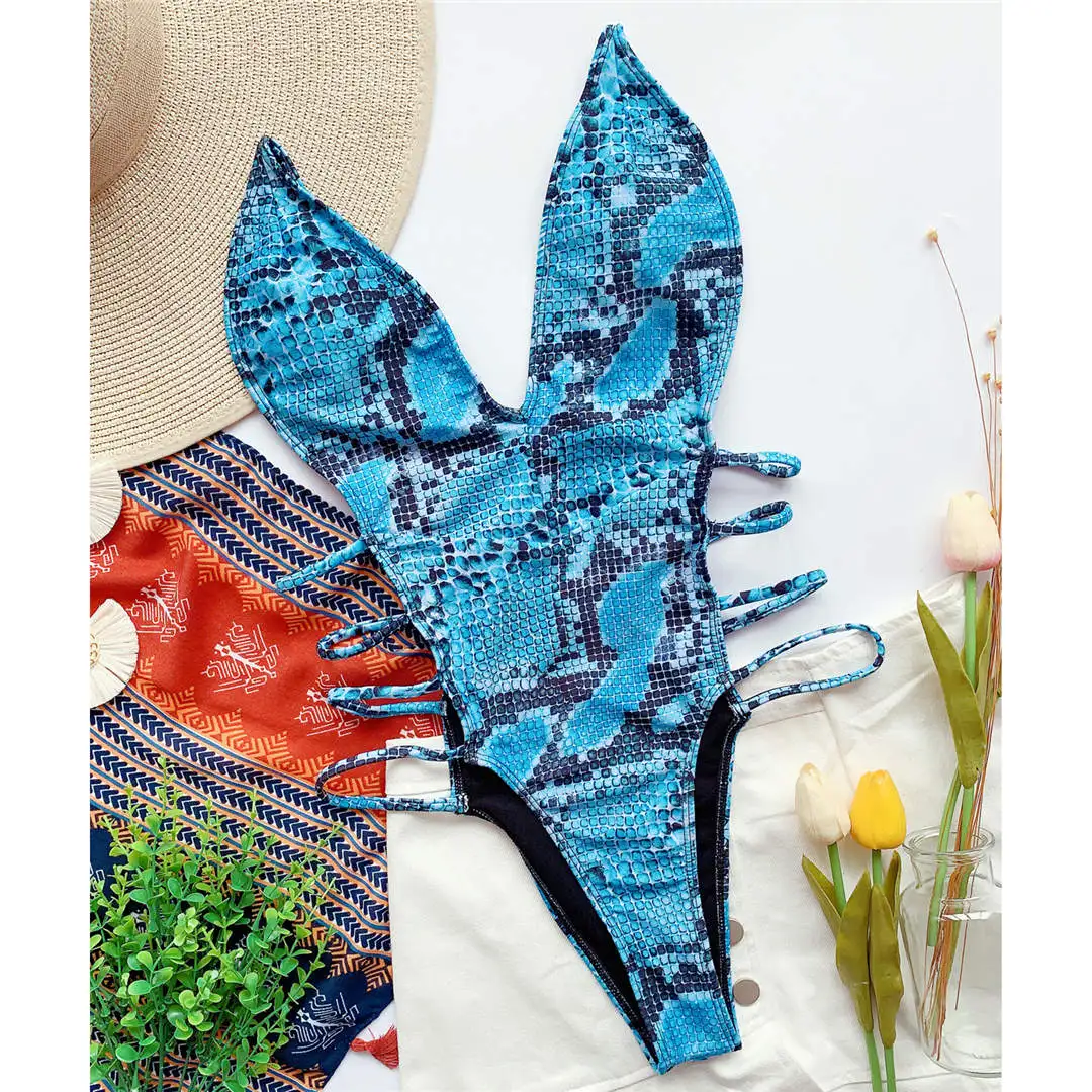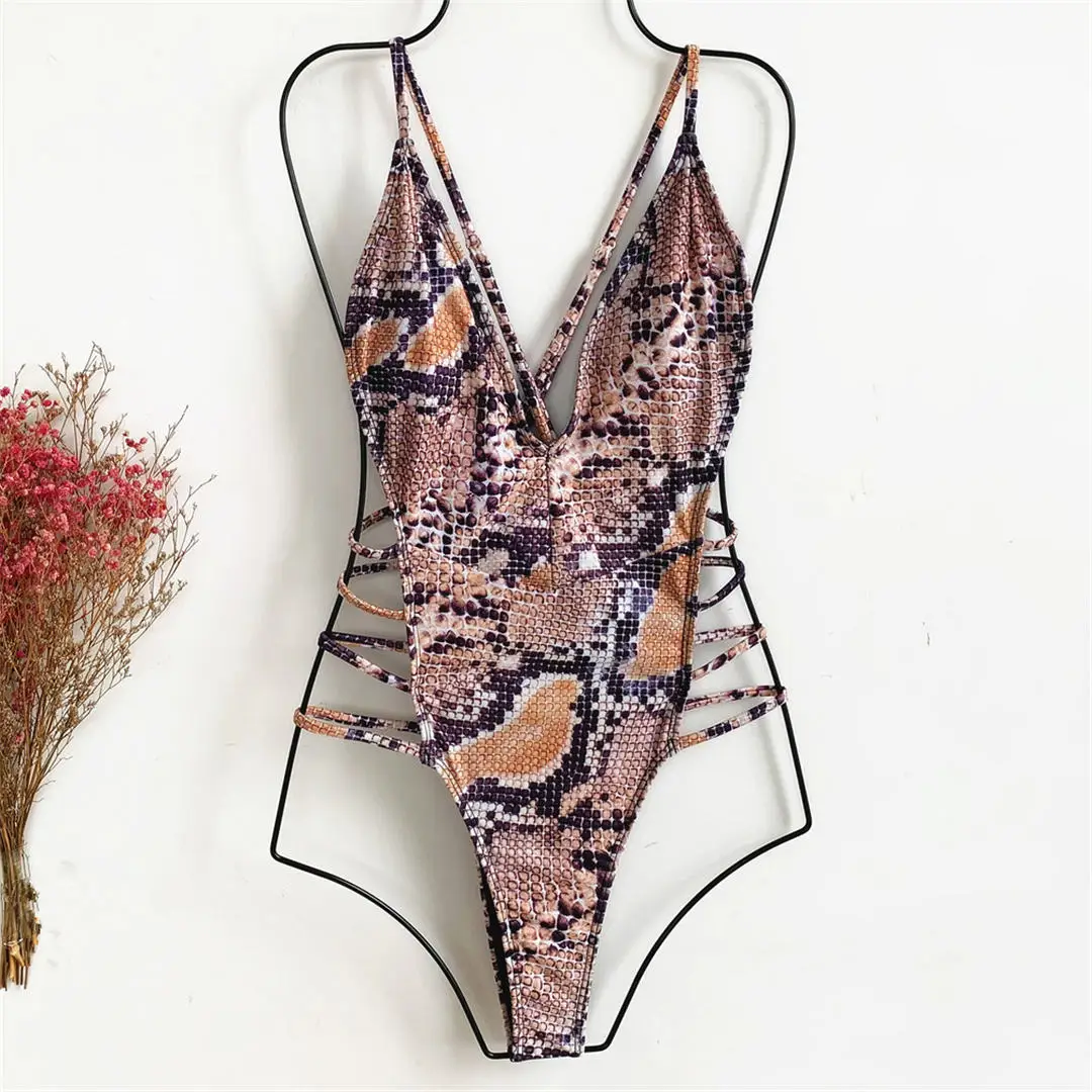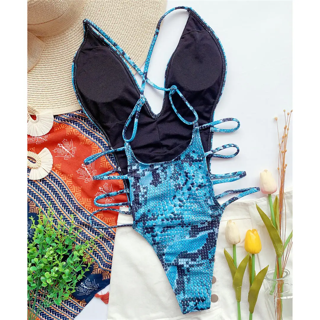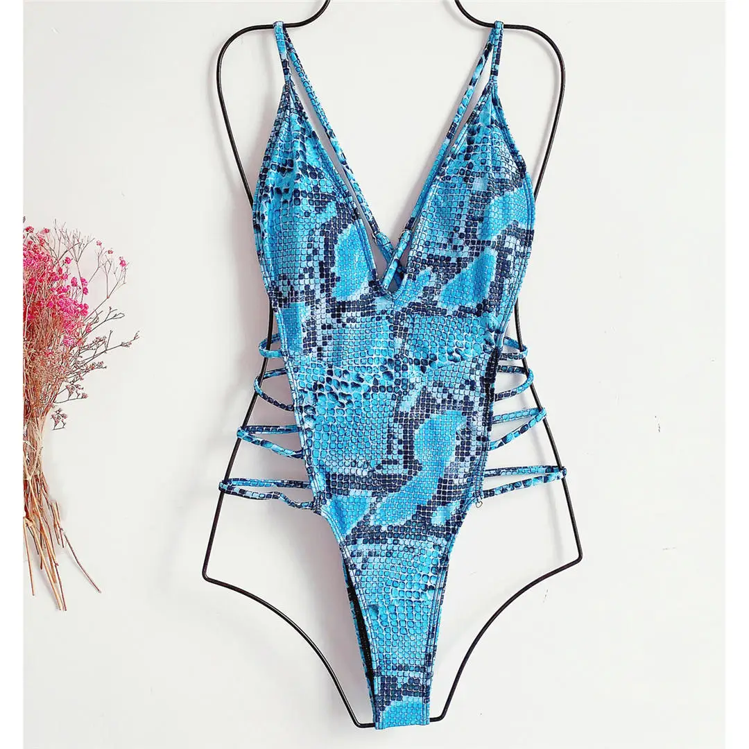 New Sexy 2025 Snake Skin Monokini Women Swimwear One Piece Swimsuit Female High Cut Deep V Bather Bathing Suit Swim Lady V2344