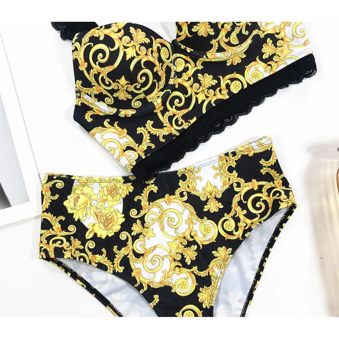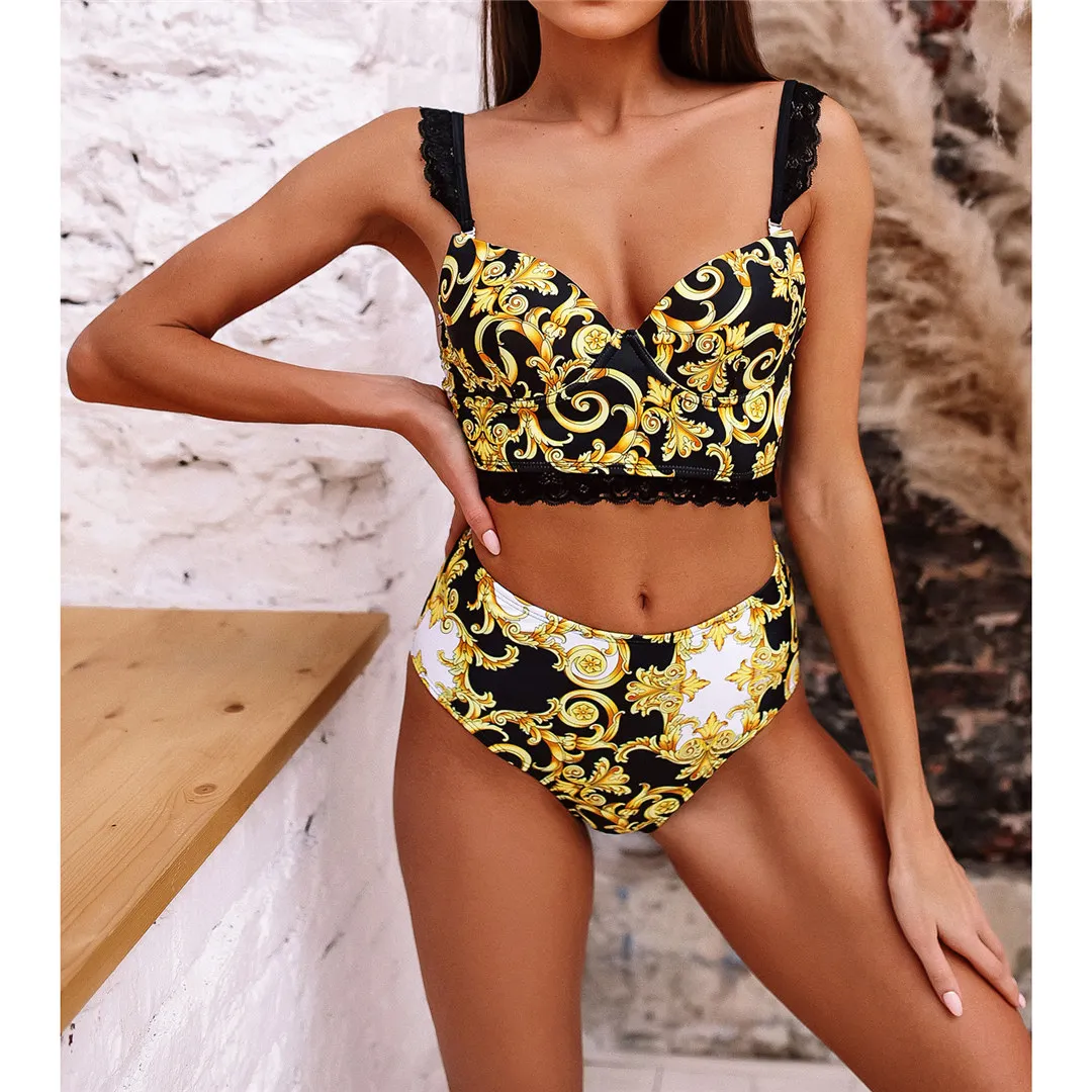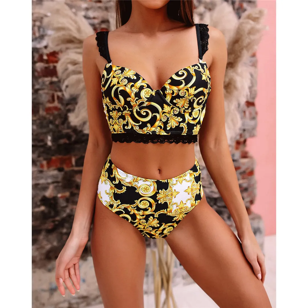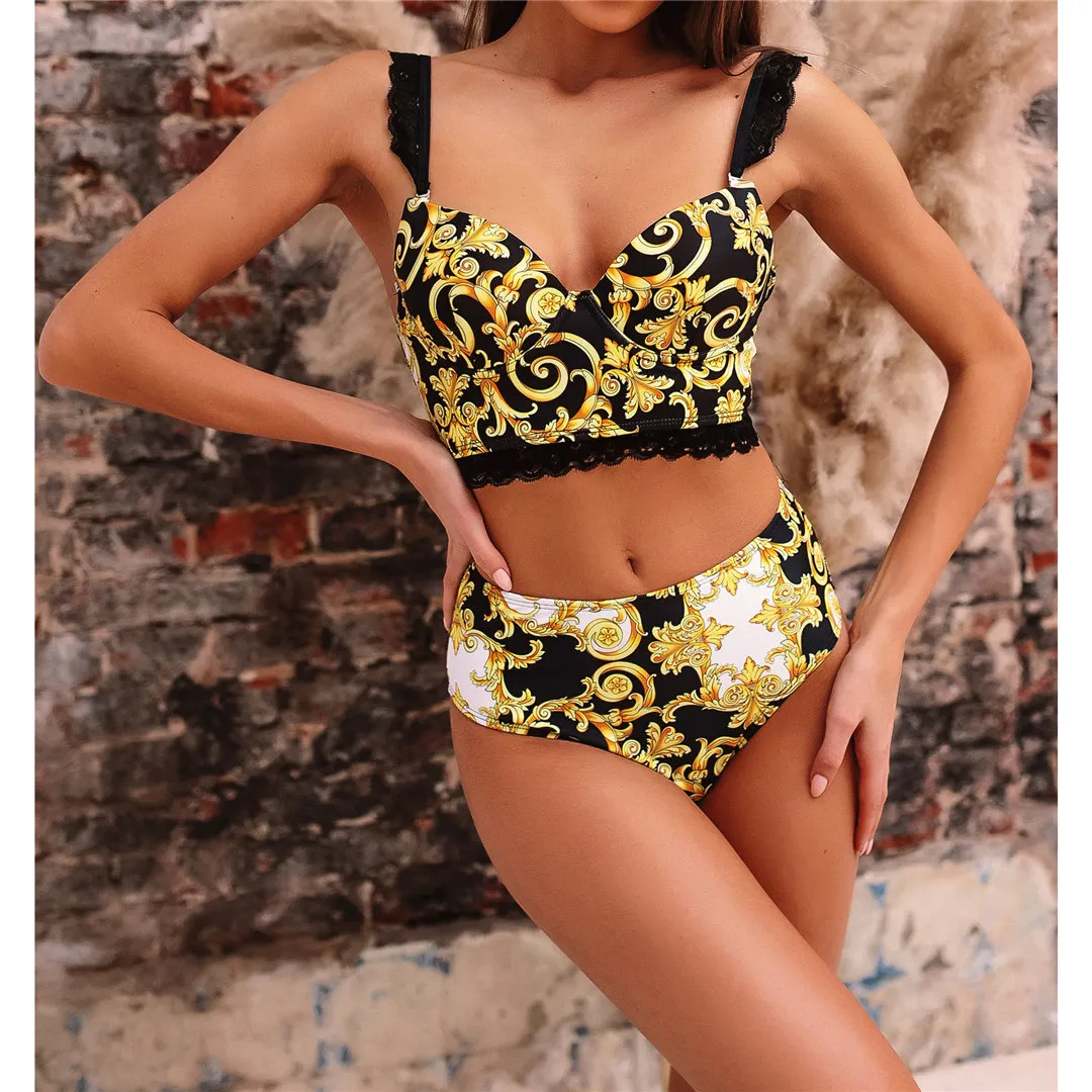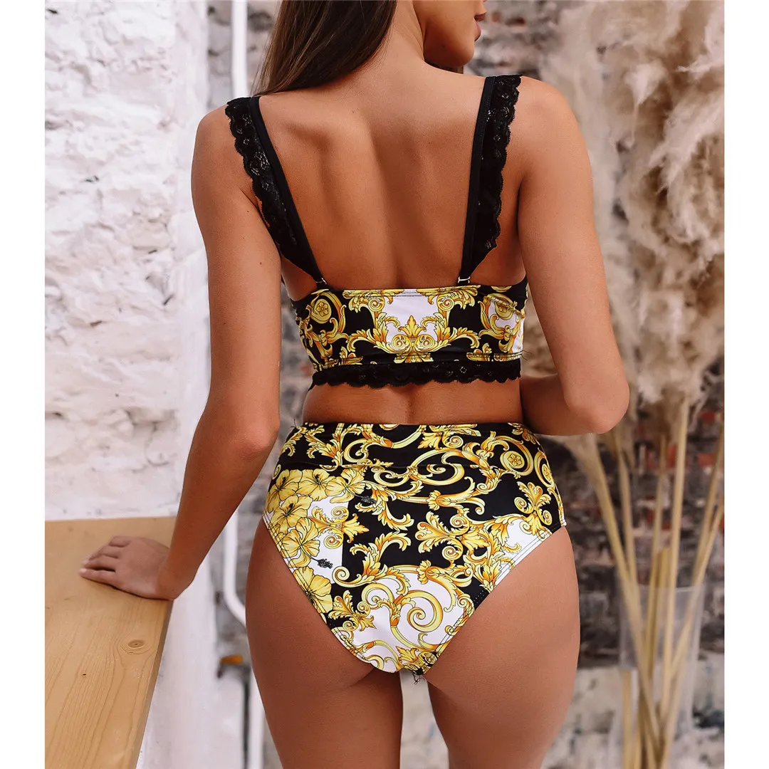 New Sexy High Waist Bikini Female Swimsuit Women Swimwear Two-pieces Bikini set With Lace Straps Bather Bathing Suit V2282