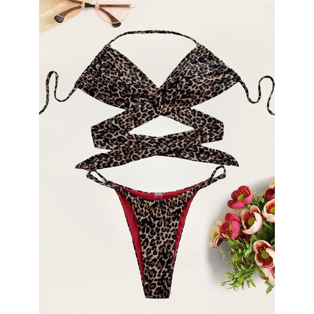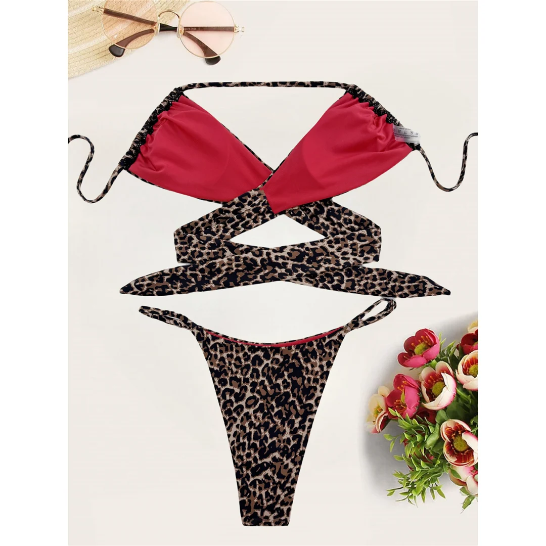 New Sexy Leopard Halter High Leg Cut Bikini Female Swimsuit Women Swimwear Two-pieces Bikini set Bather Bathing Suit Swim V5769