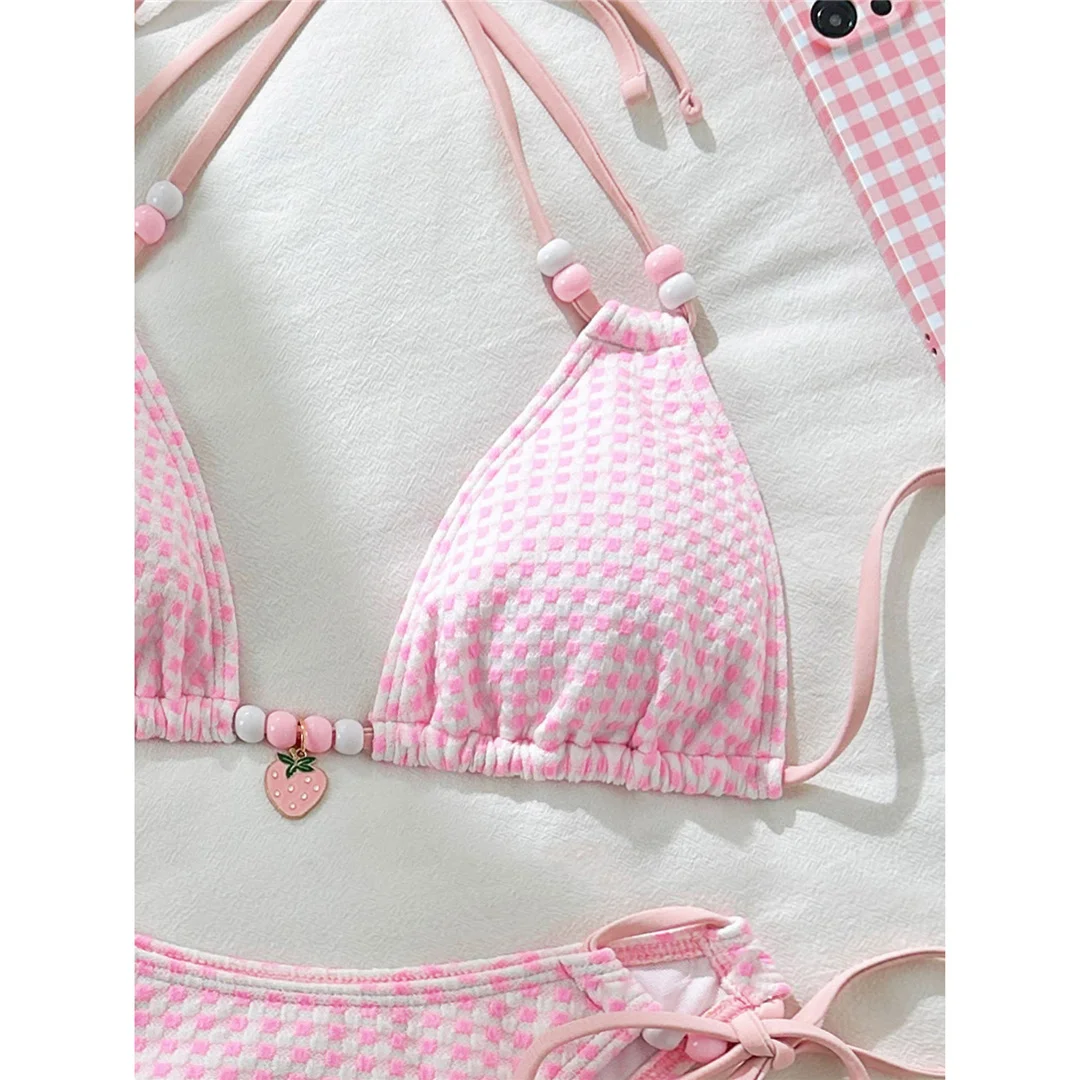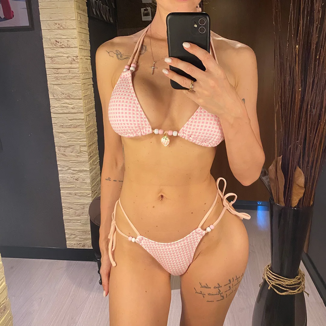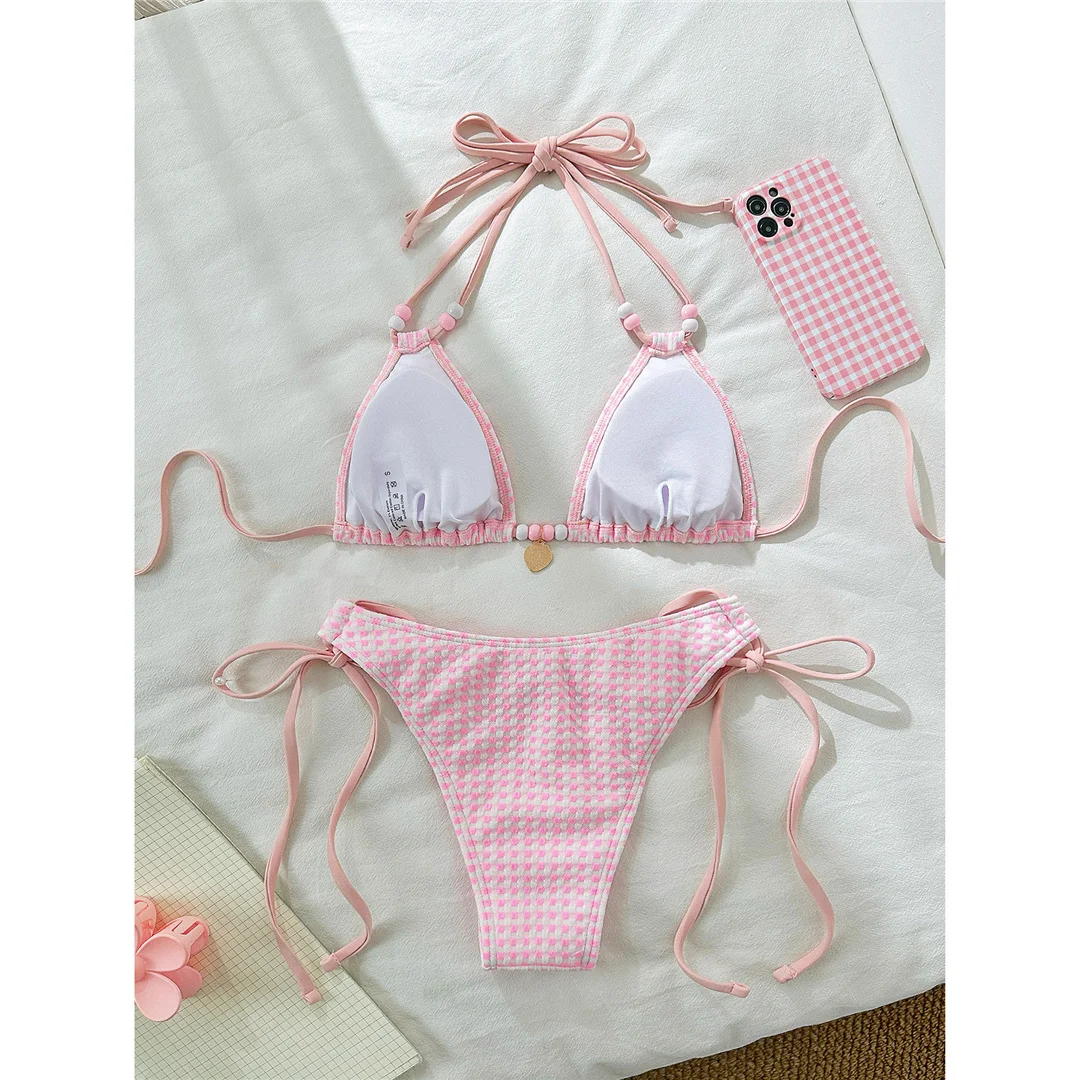 New Sexy Plaid Halter High Cut Leg Bikini Female Swimsuit Women Swimwear Two-pieces Bikini set Bather Bathing Suit Swim V6543