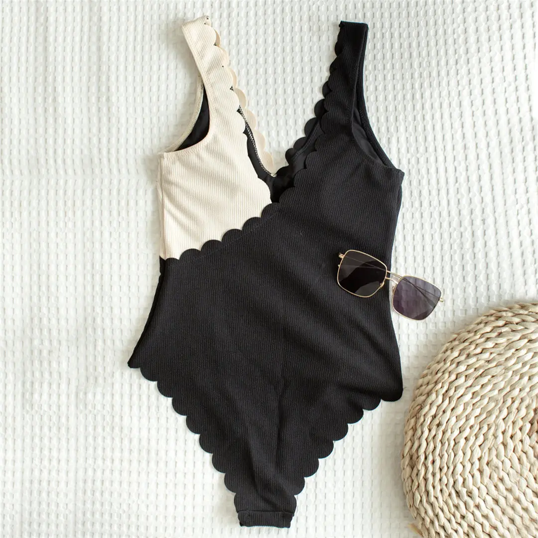 New Sexy Scalloped Splicing High Cut One Piece Swimsuit Women Swimwear Female Ribbed Bather Bathing Suit Swim Lady V2425