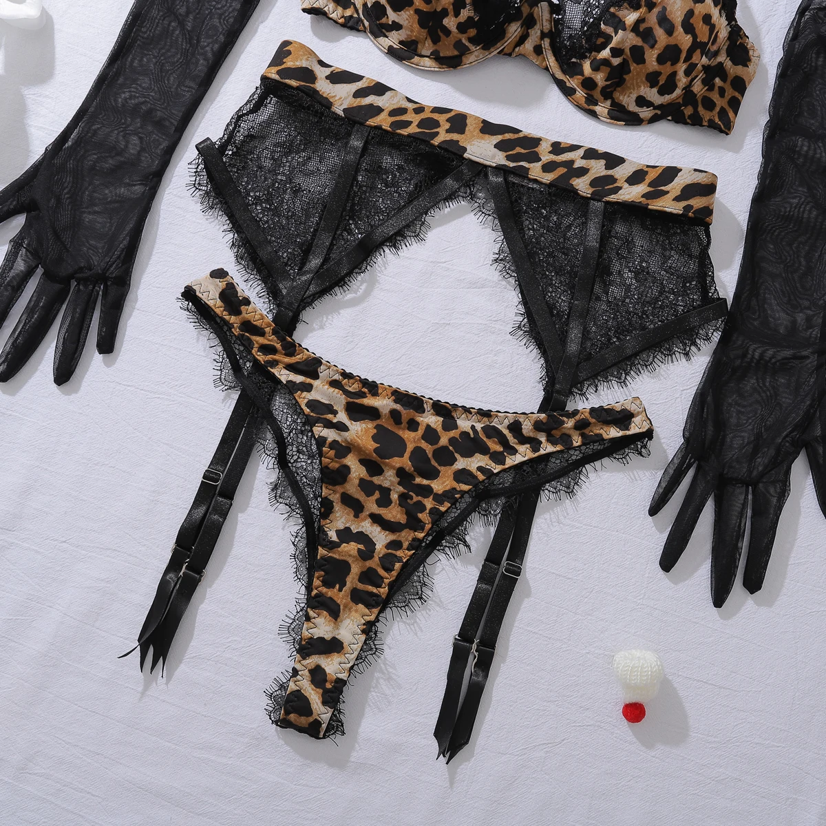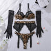 New Sexy Temptation Personalized Bra Set with Patchwork Leopard Pattern Hollow Out Nightclub Fun Four Piece Set with Steel Rim