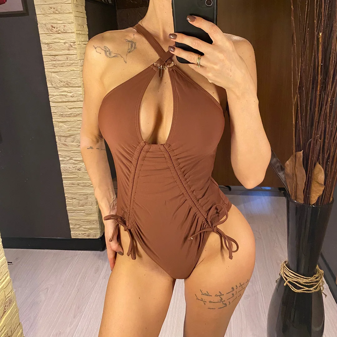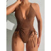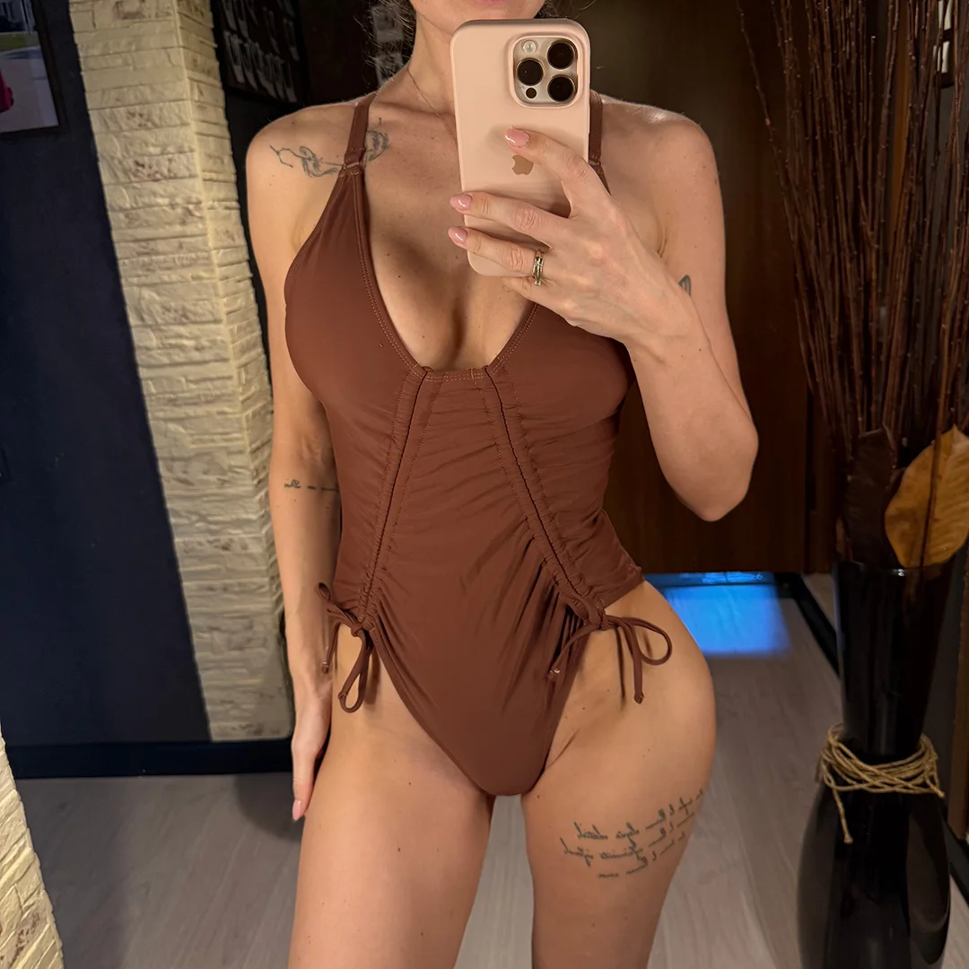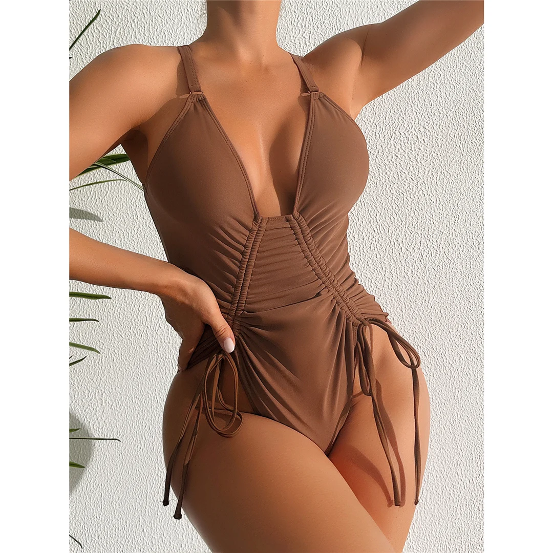 New V Neck Lace Up Cross Back Women Swimwear One Piece Swimsuit Female Wrinkled High Cut Monokini Bather Bathing Suit Swim V6367