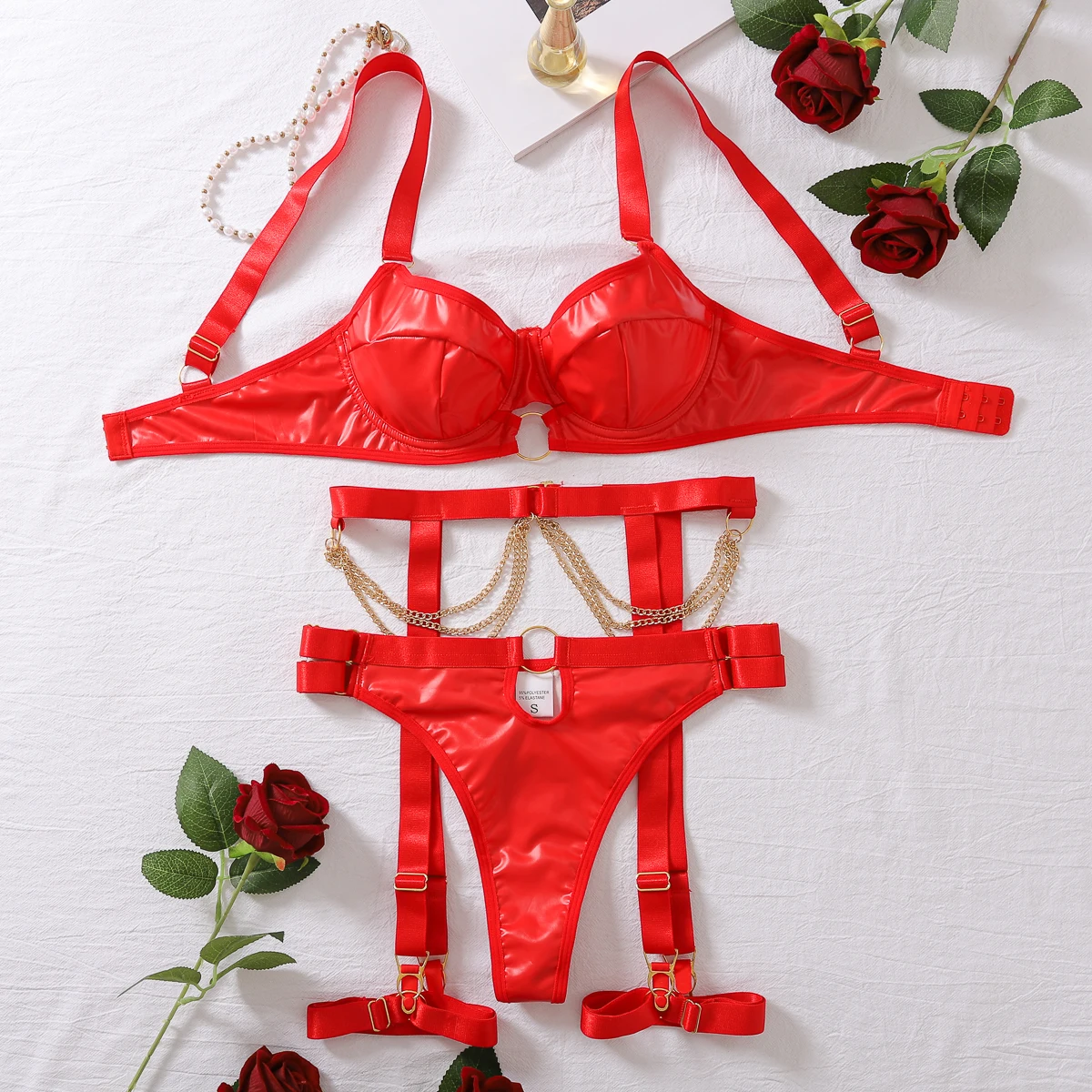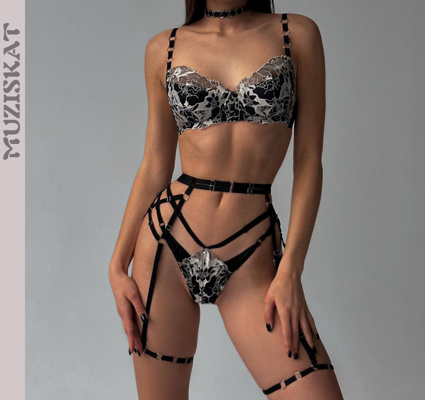 Nightclub Temptation Female Underwear Set with Belts and Straps Metal Chain Sexy Lingerie 4 Piece Sets Porne Clothing for Women