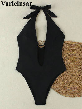 S – XL New Deep V Neck Halter Metal Ring Women Swimwear One Piece Swimsuit Female Monokini Padded Bather Bathing Suit Swim V7075