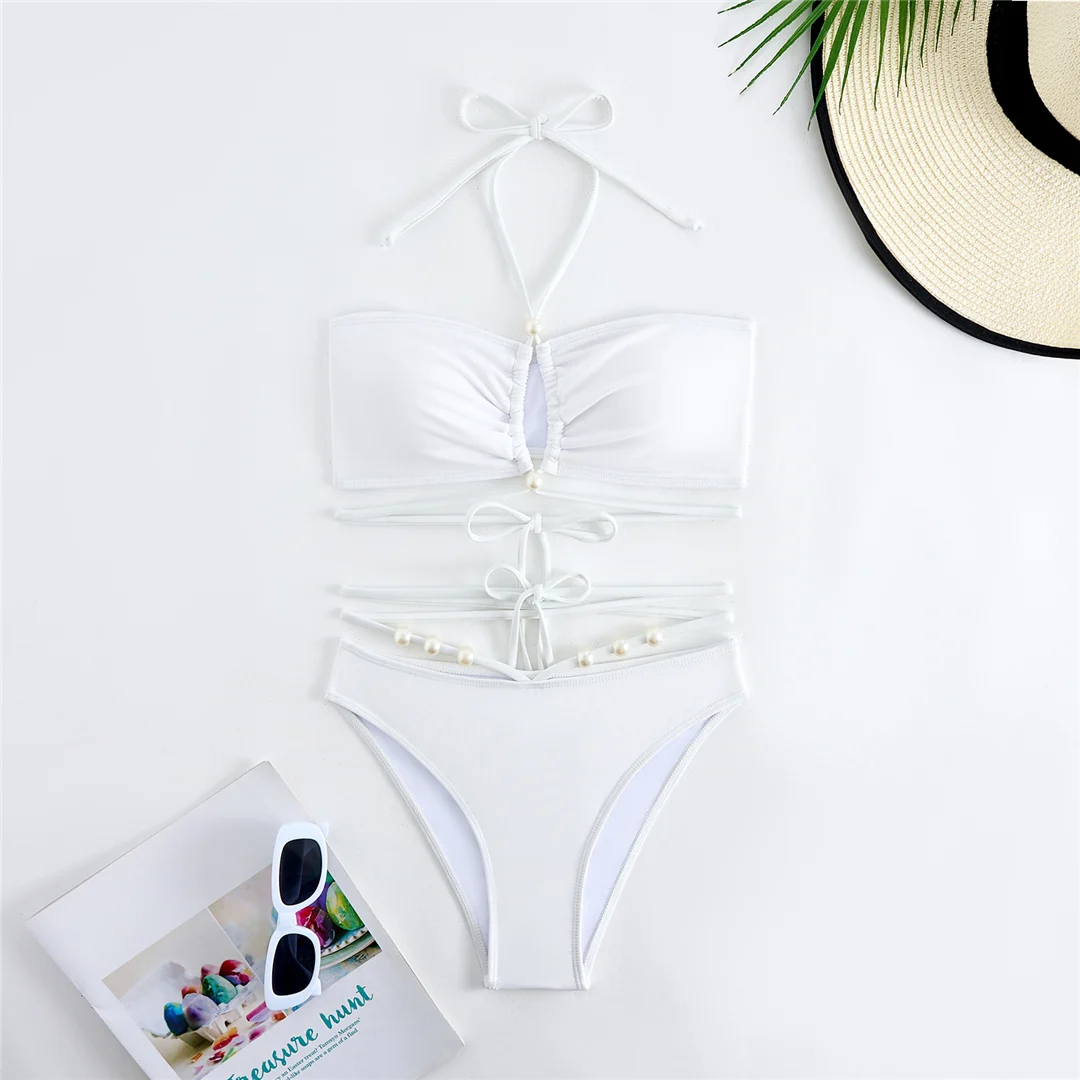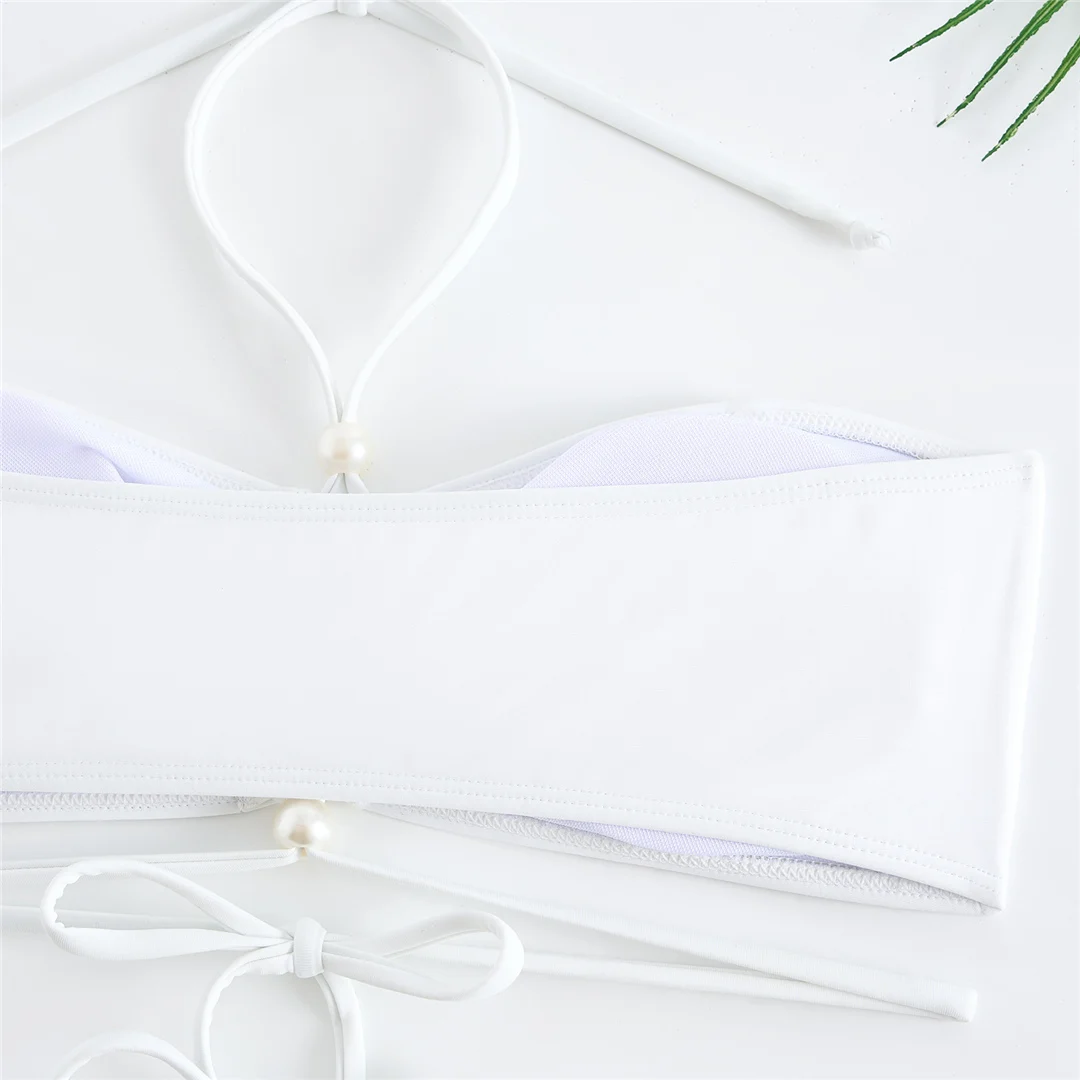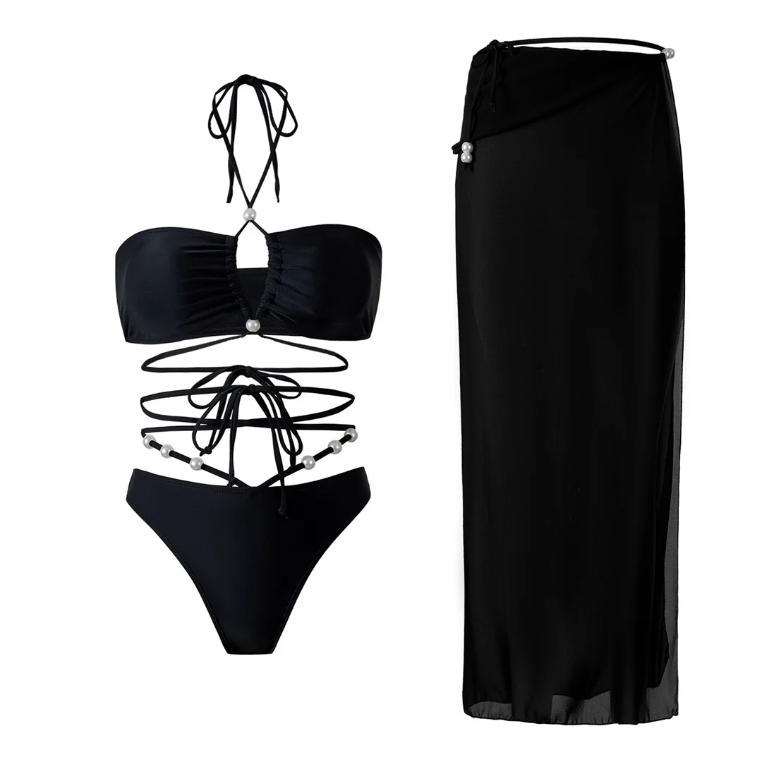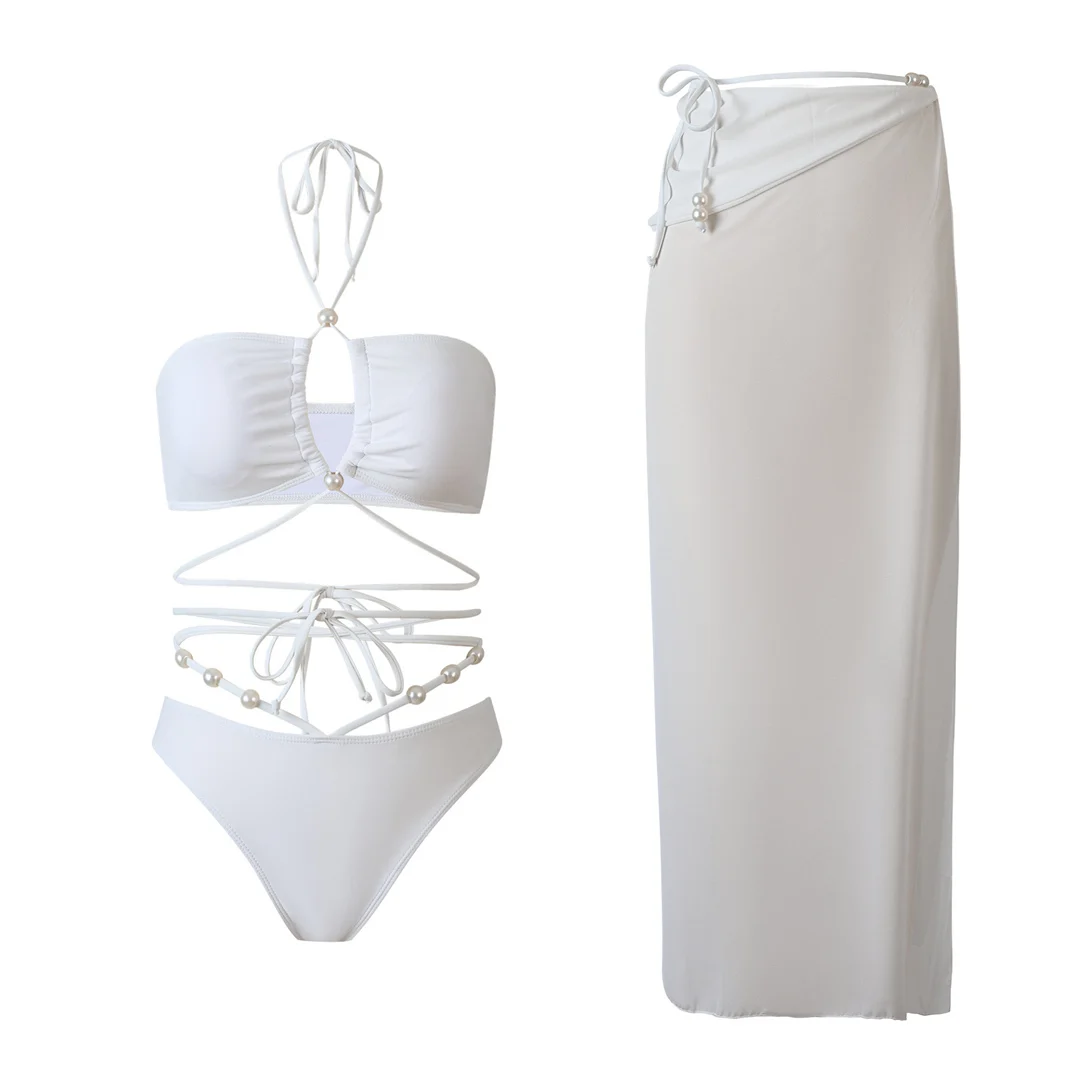 Pearl Wrap Around Halter With Skirt Bikini Women Swimwear Female Swimsuit Three-pieces Bikini set Bather Bathing Suit Swim V6098