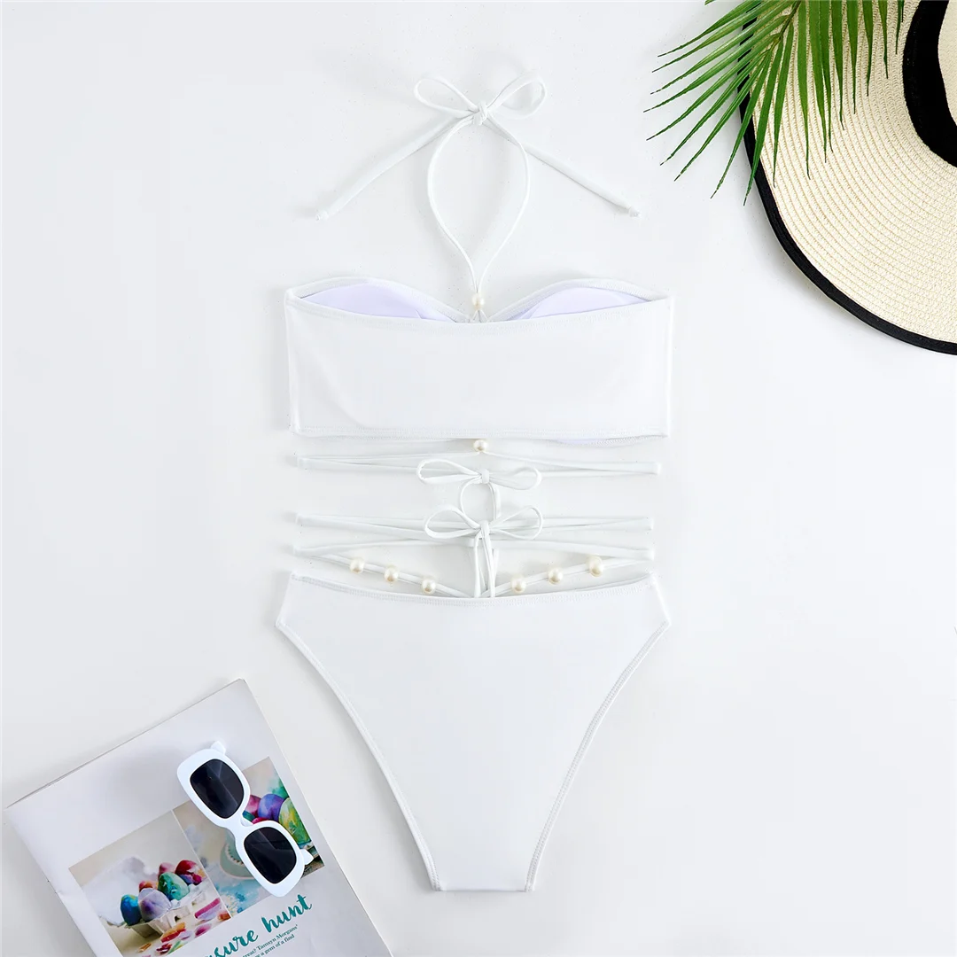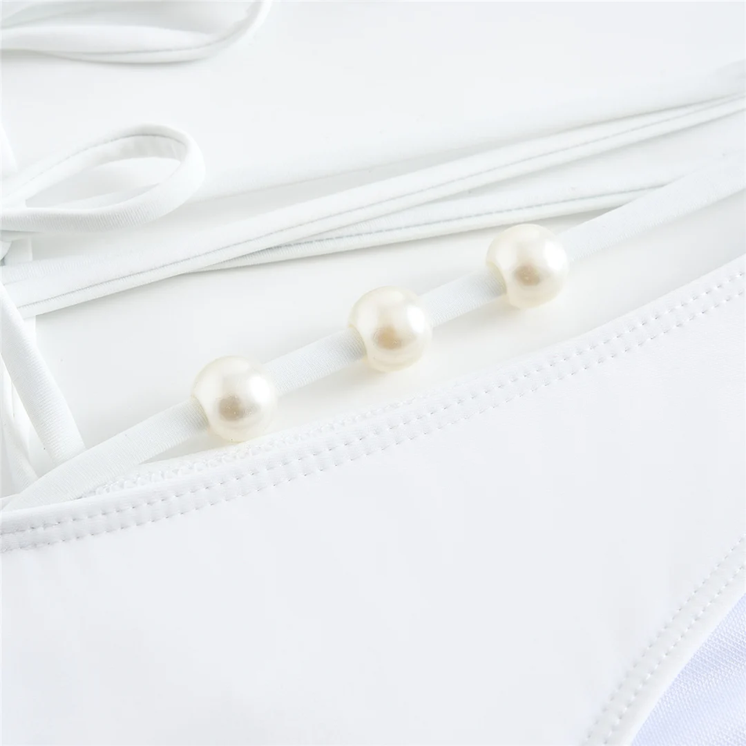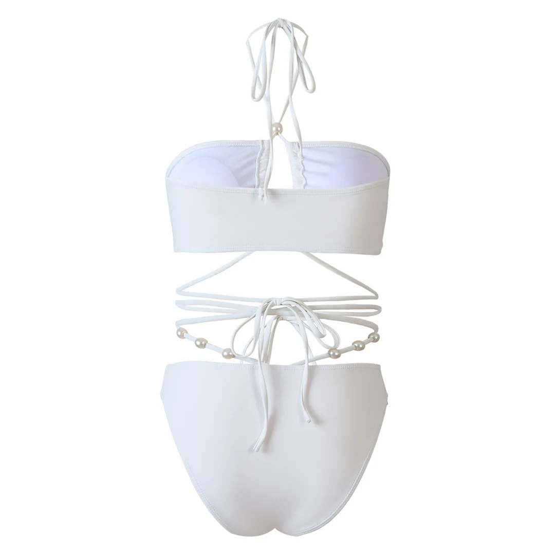 Pearl Wrap Around Halter With Skirt Bikini Women Swimwear Female Swimsuit Three-pieces Bikini set Bather Bathing Suit Swim V6098