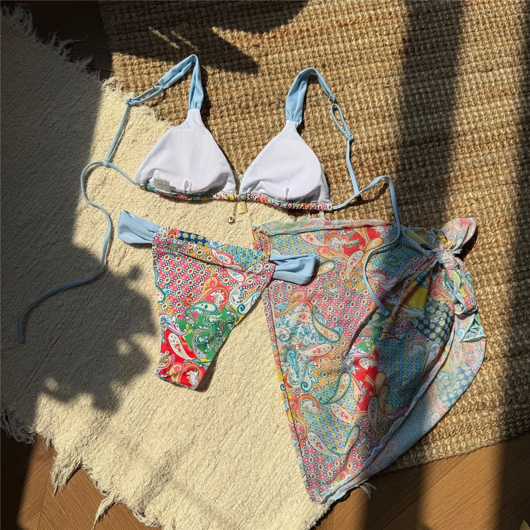 Printed With Sarong High Cut Leg Bikini Women Swimwear Female Swimsuit Three-pieces Bikini set Bather Bathing Suit Swim V7031