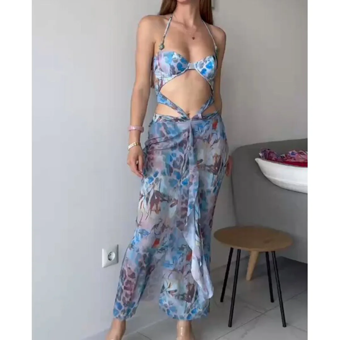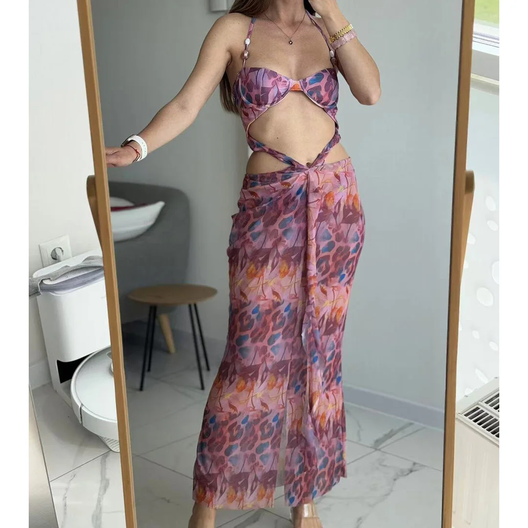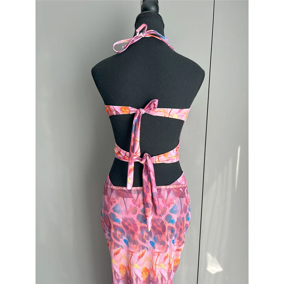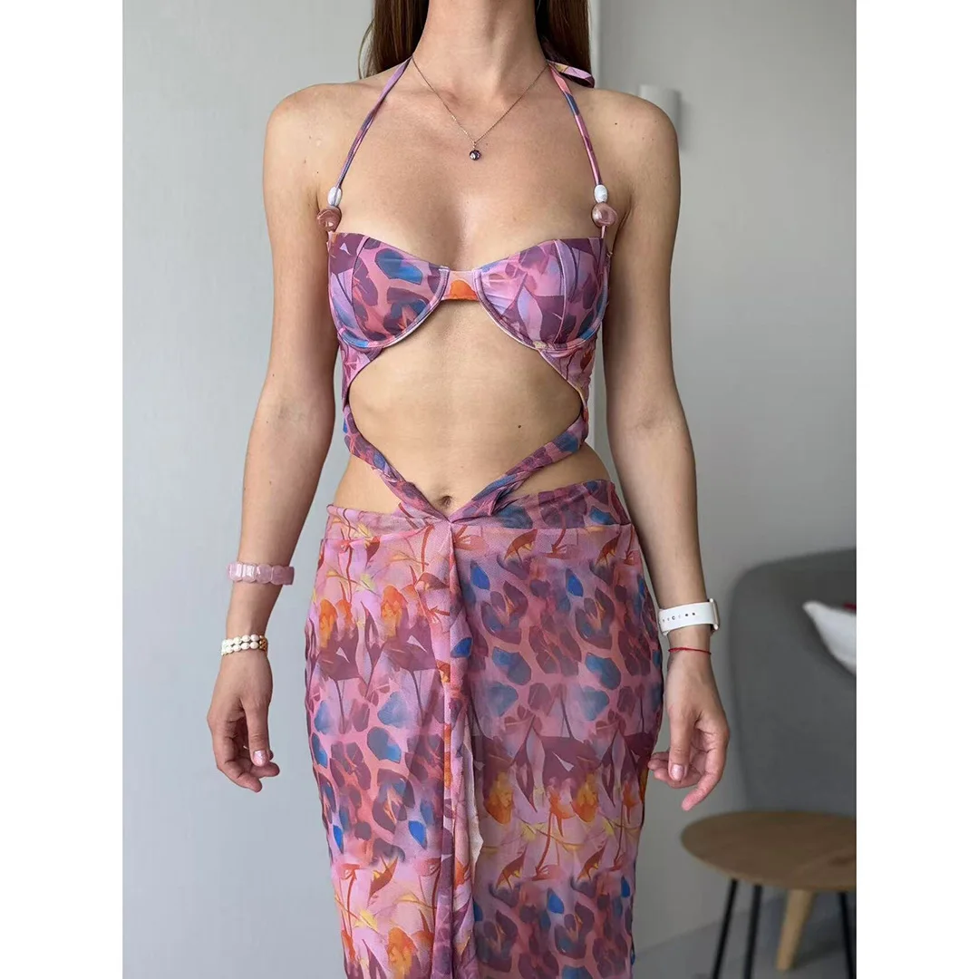 Printed With Skirt Halter Bikini Female Swimsuit Women Swimwear Two-pieces Bikini set Underwired Bather Bathing Suit Swim V6585