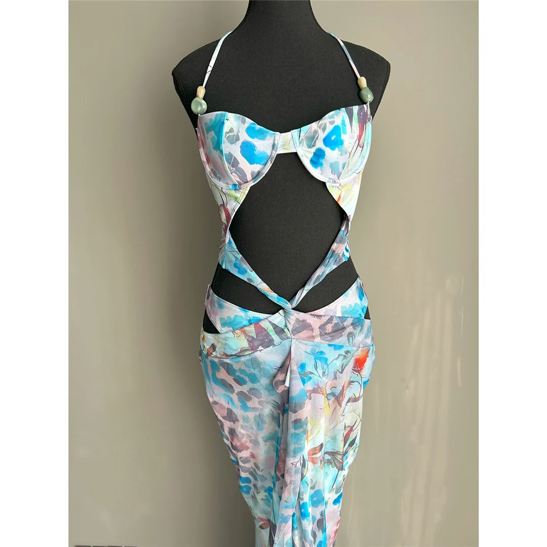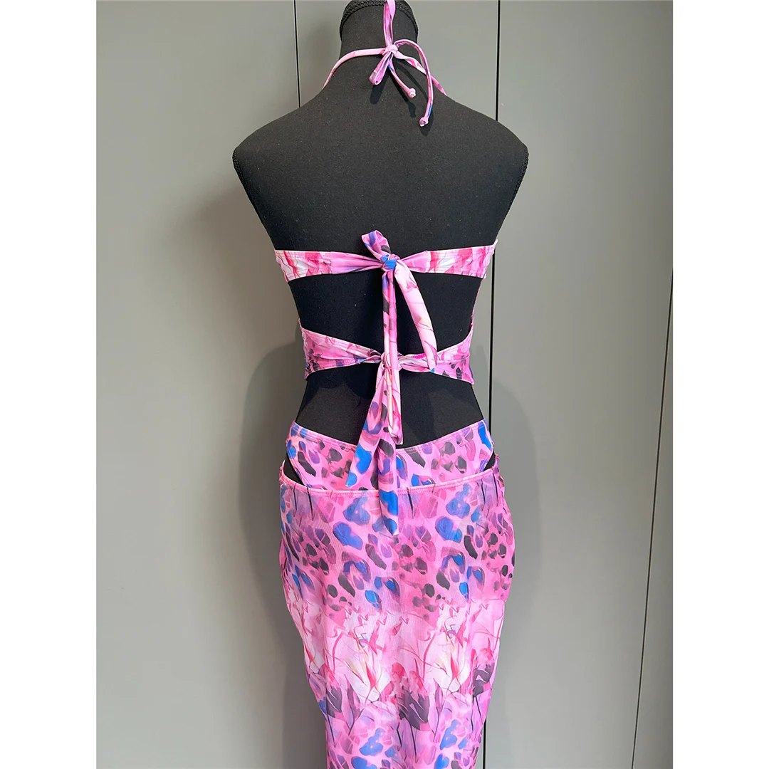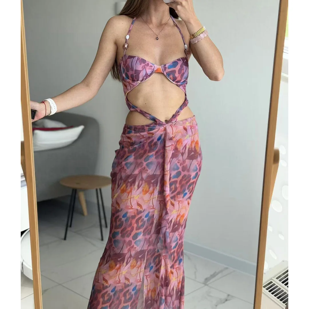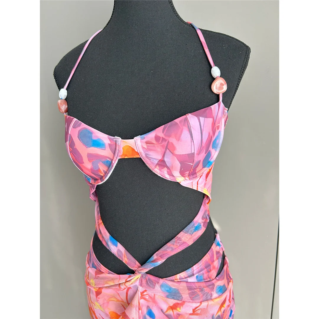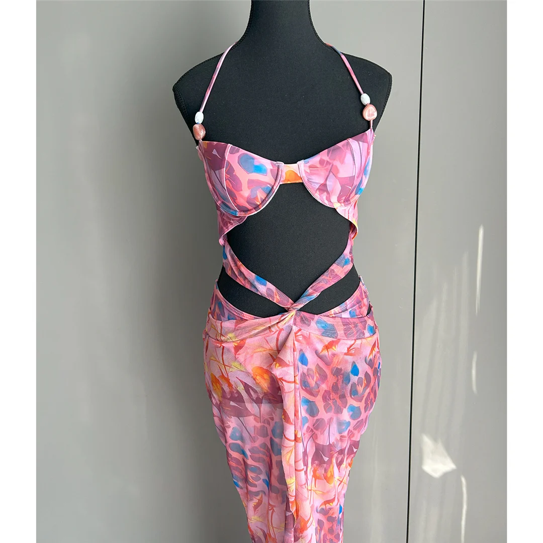 Printed With Skirt Halter Bikini Female Swimsuit Women Swimwear Two-pieces Bikini set Underwired Bather Bathing Suit Swim V6585