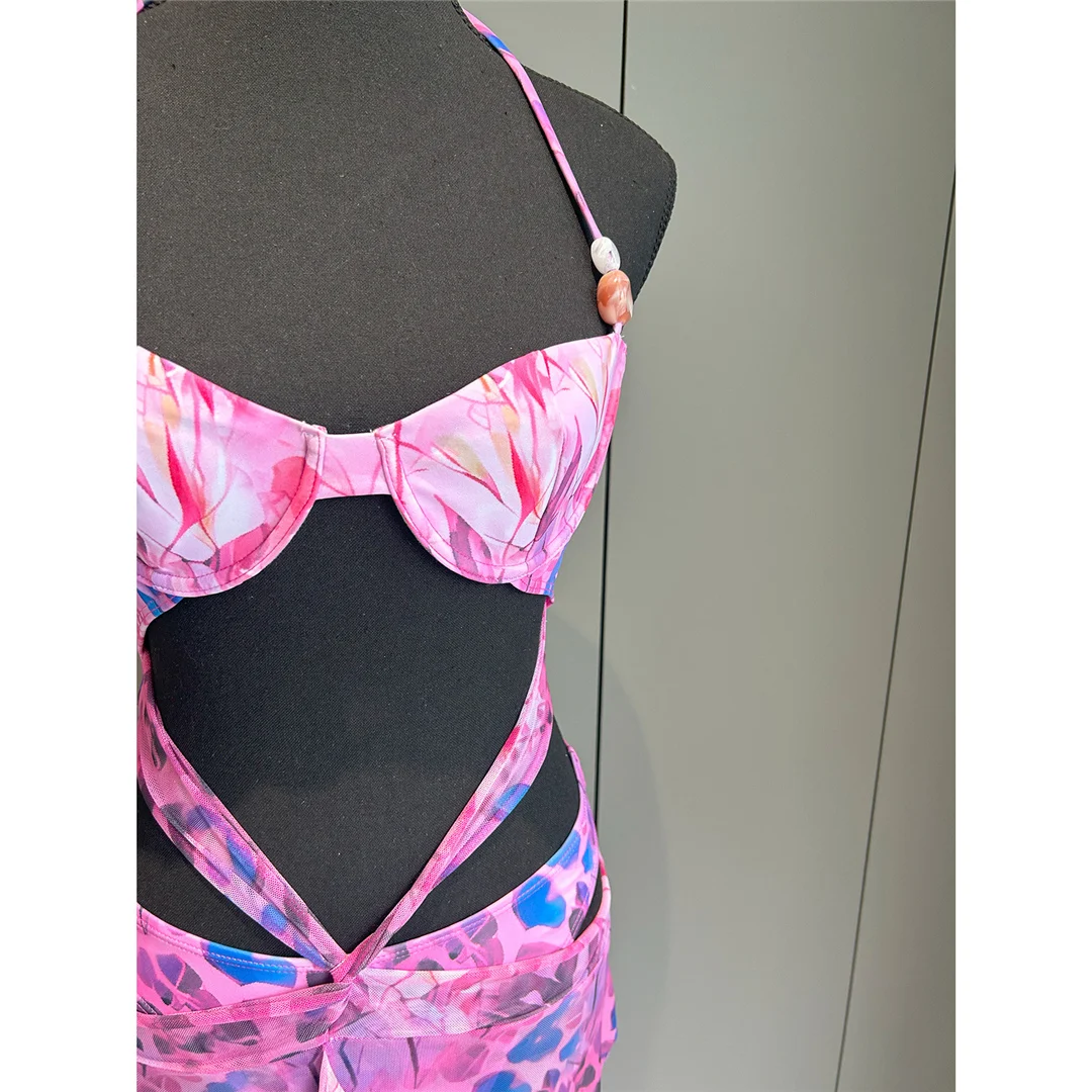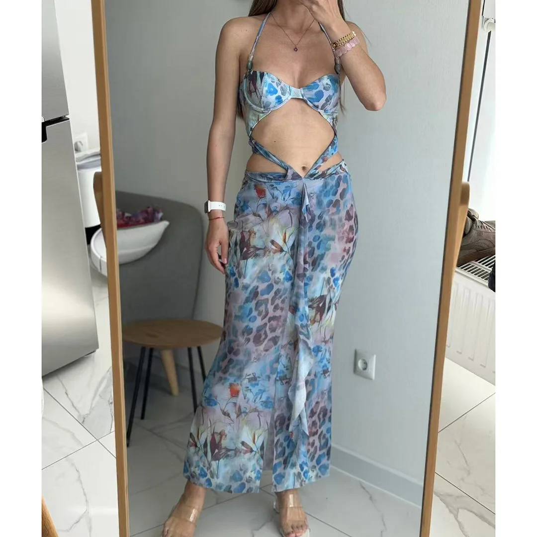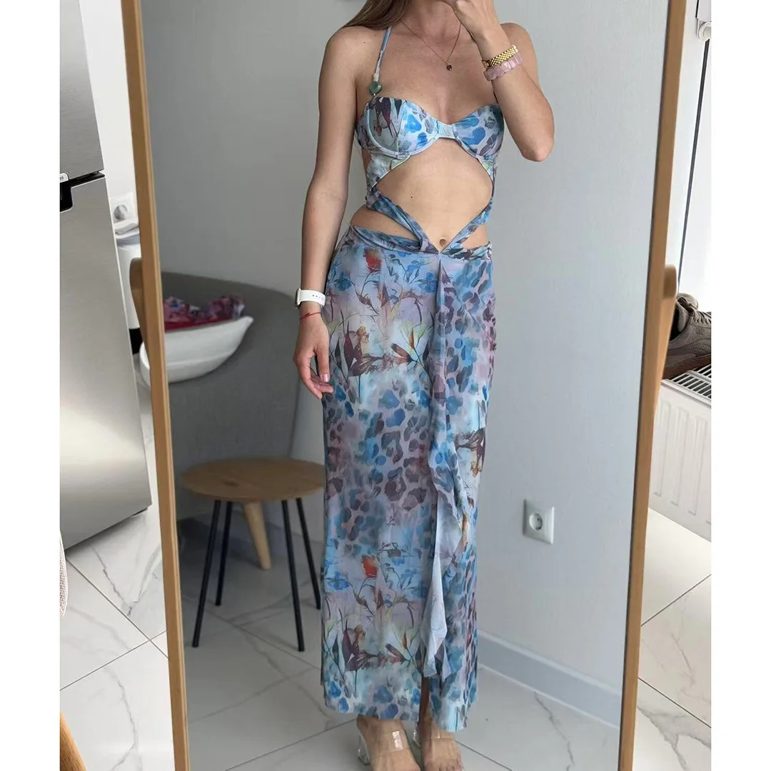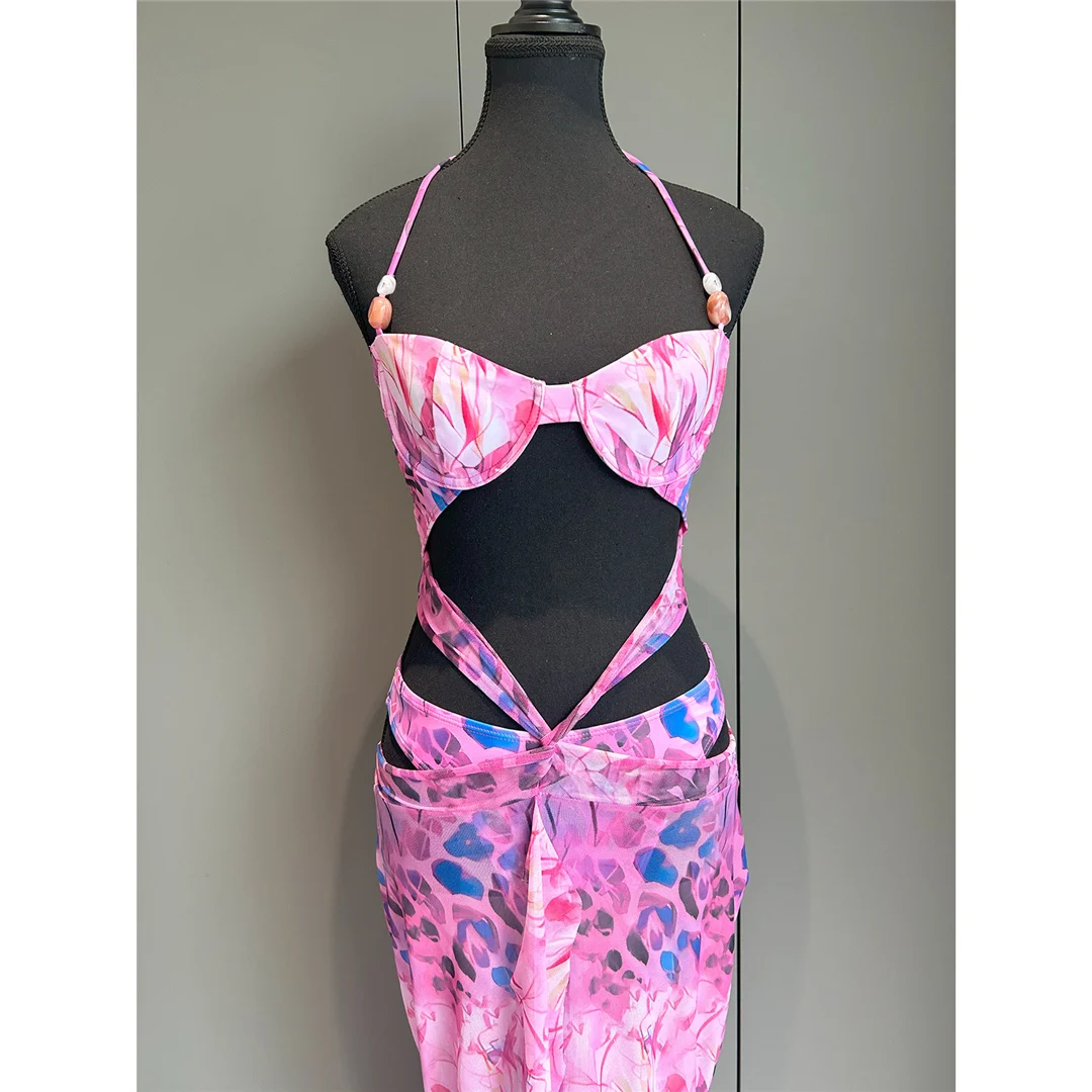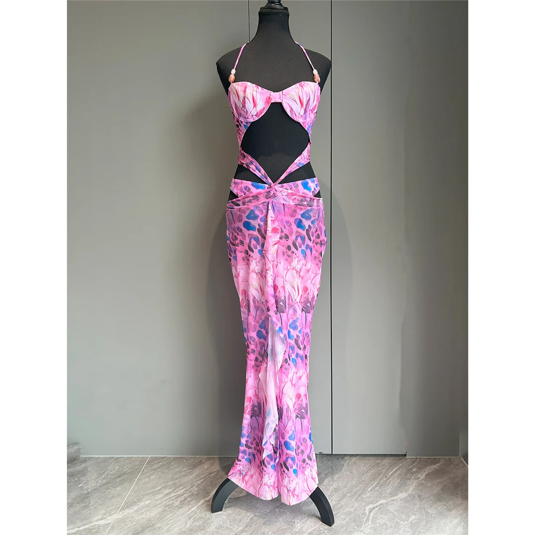 Printed With Skirt Halter Bikini Female Swimsuit Women Swimwear Two-pieces Bikini set Underwired Bather Bathing Suit Swim V6585