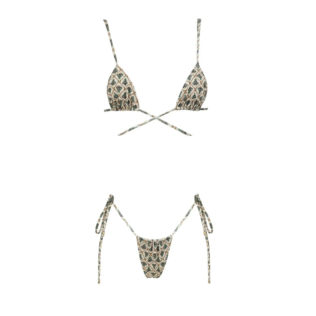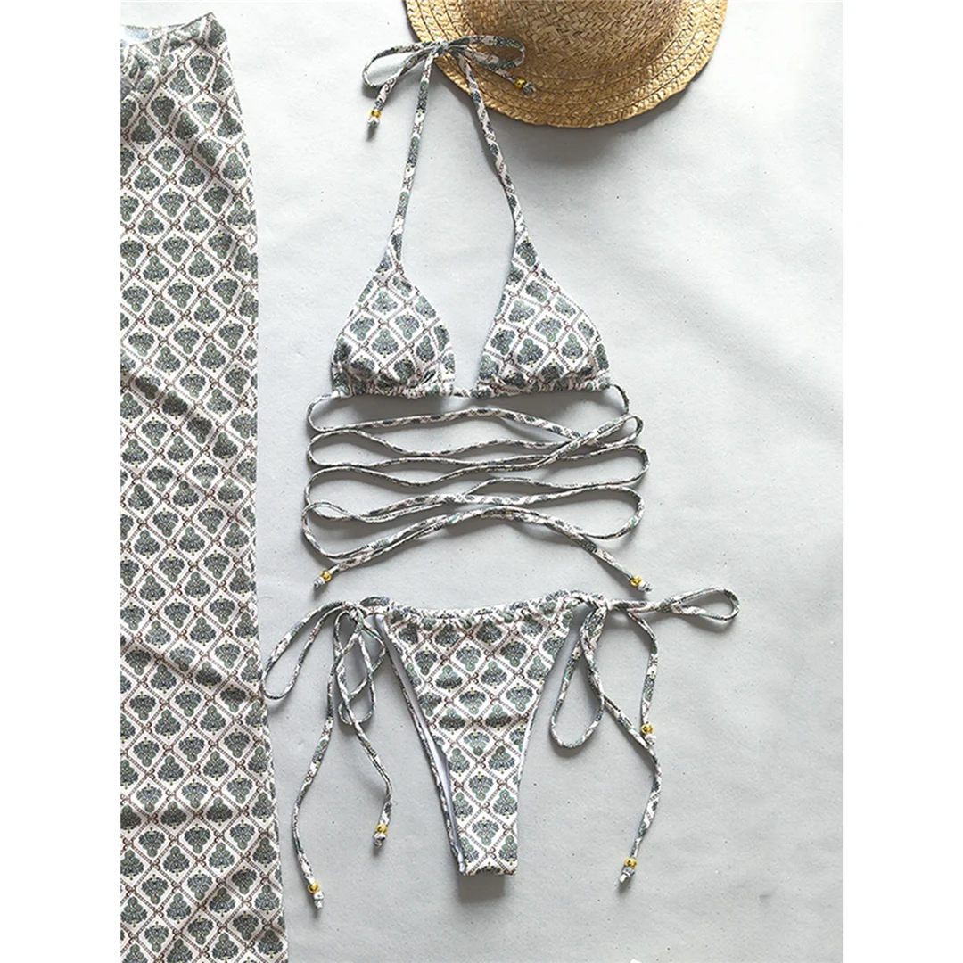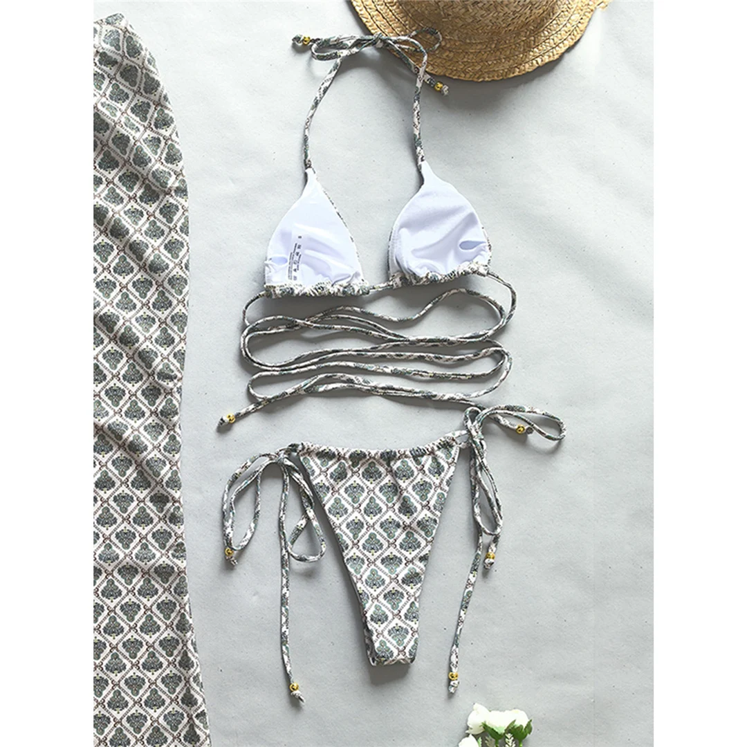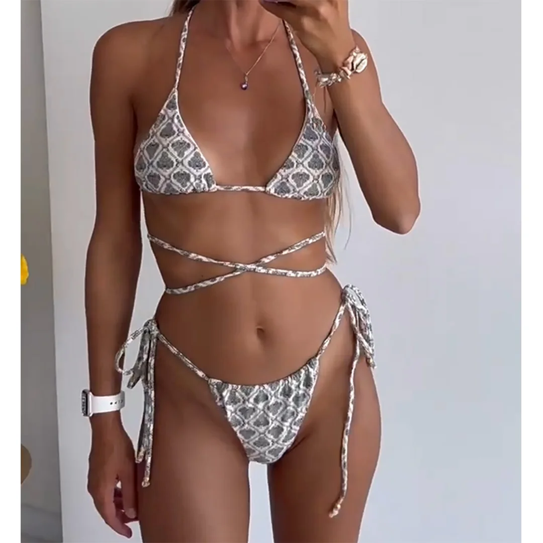 Printed Wrap Around Halter High Cut Bikini Female Swimsuit Women Swimwear Two-pieces Bikini set Bather Bathing Suit Swim V5914
