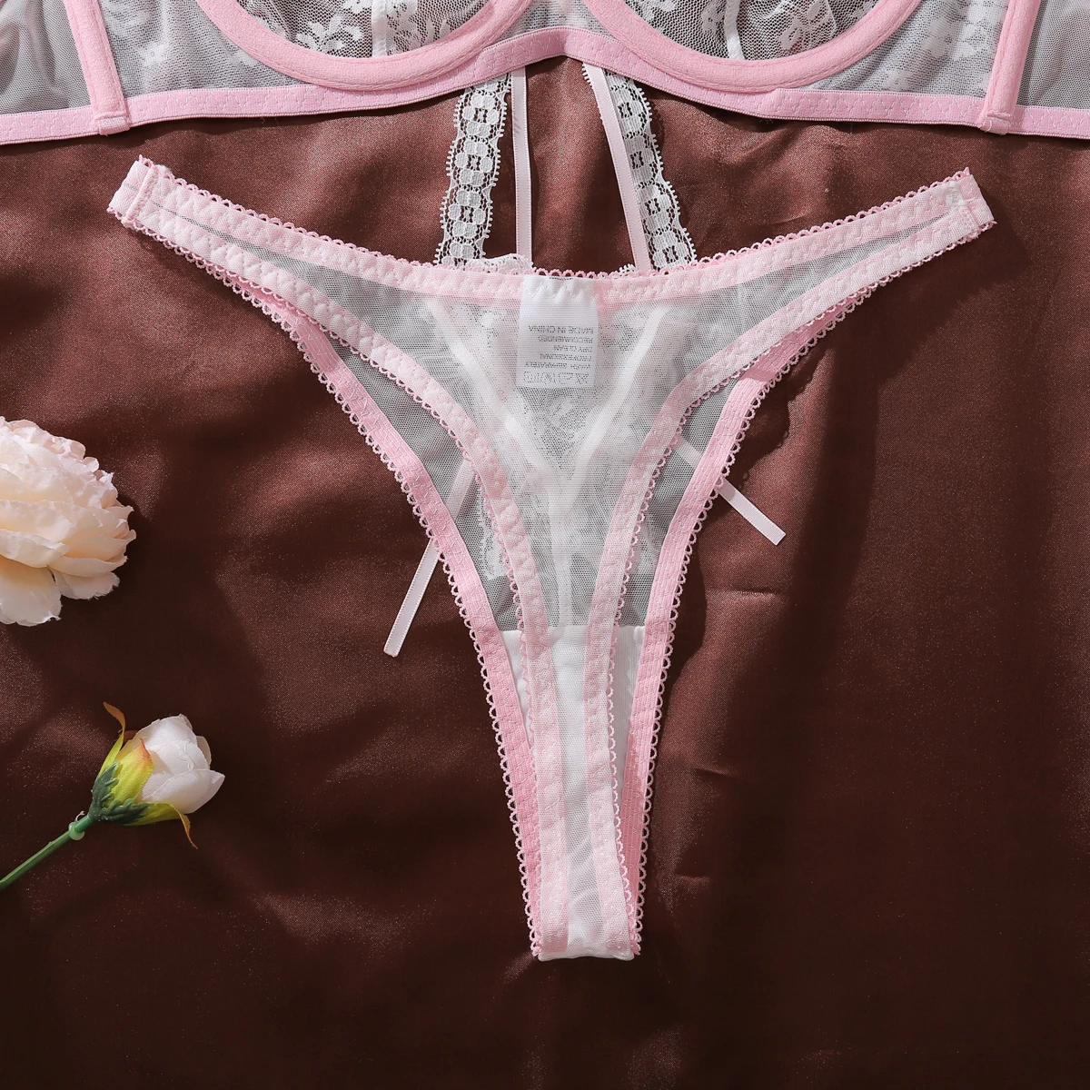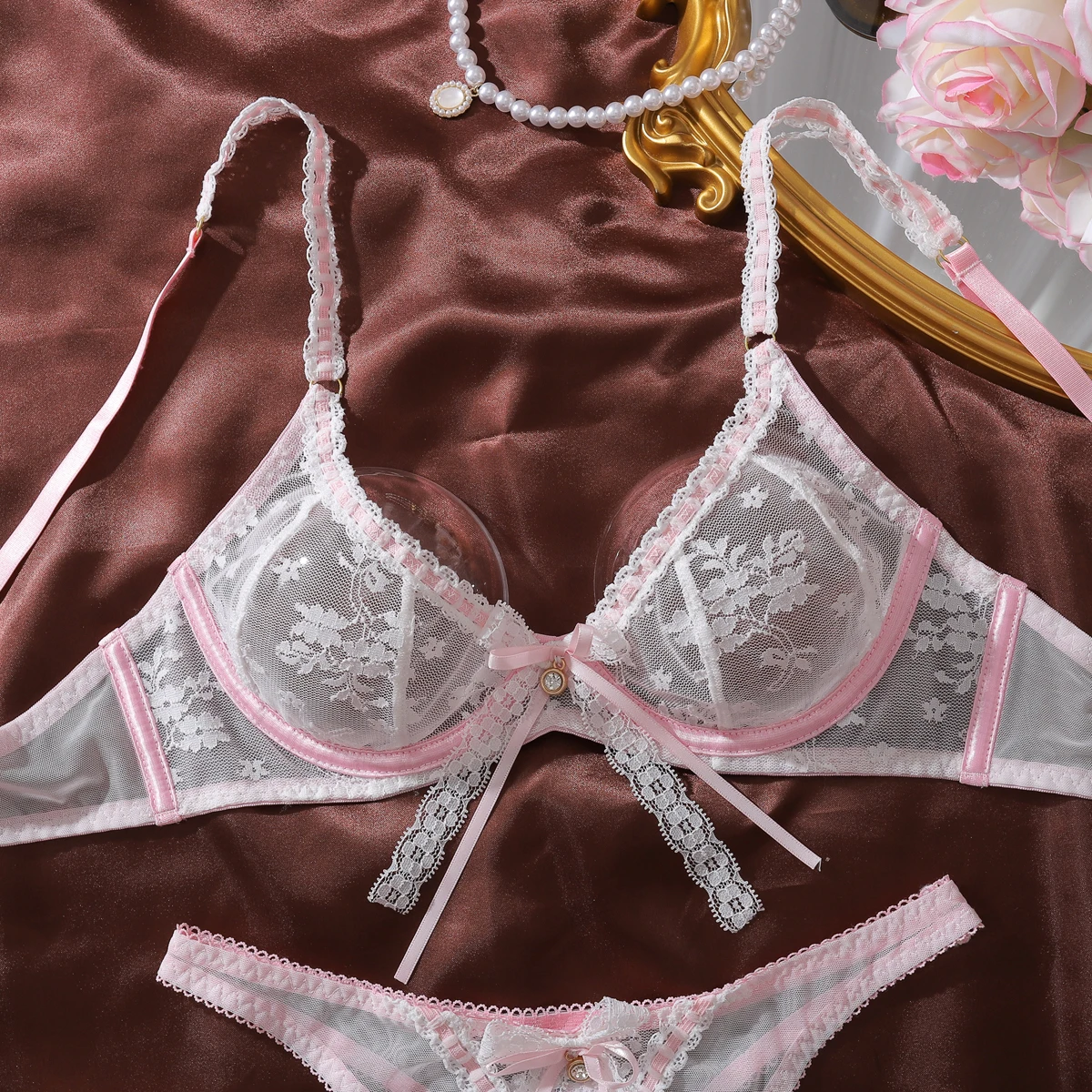 Pure color collision flower bud shoulder strap sweet and translucent lace shaping sexy lingerie two-piece set