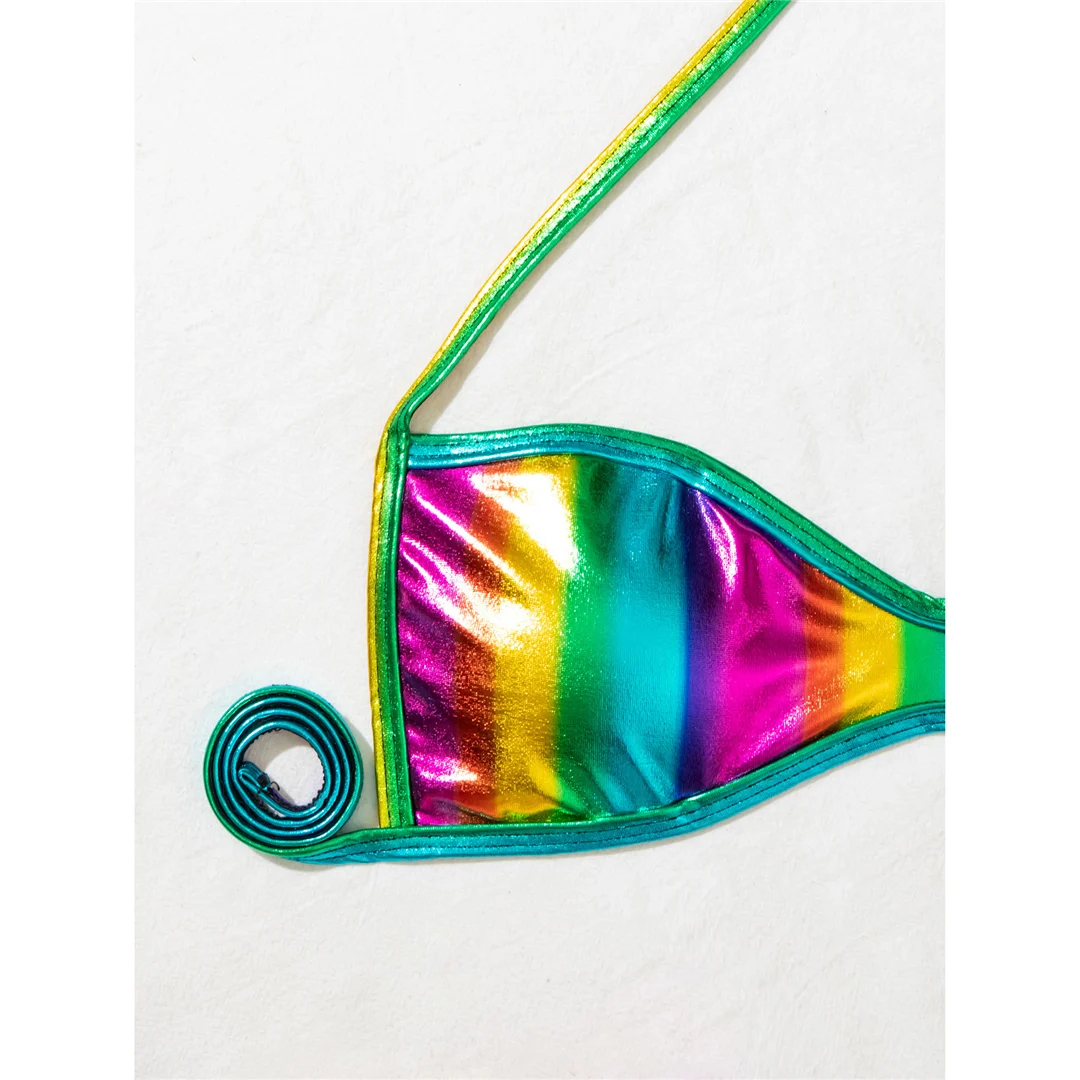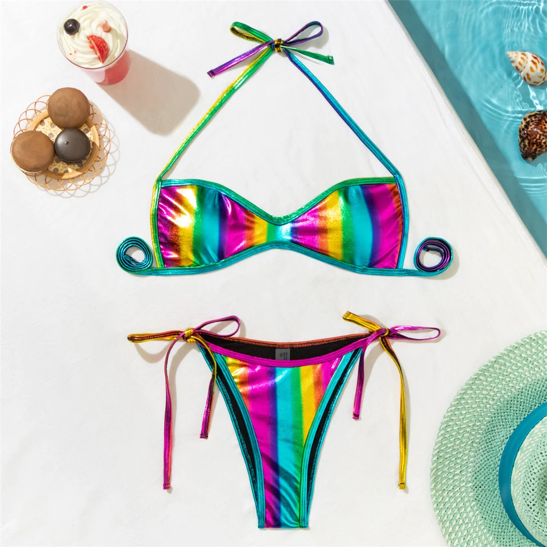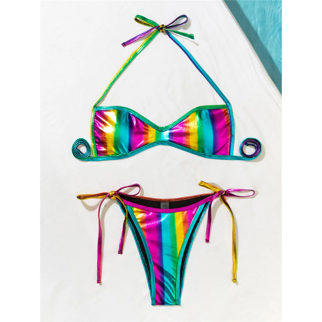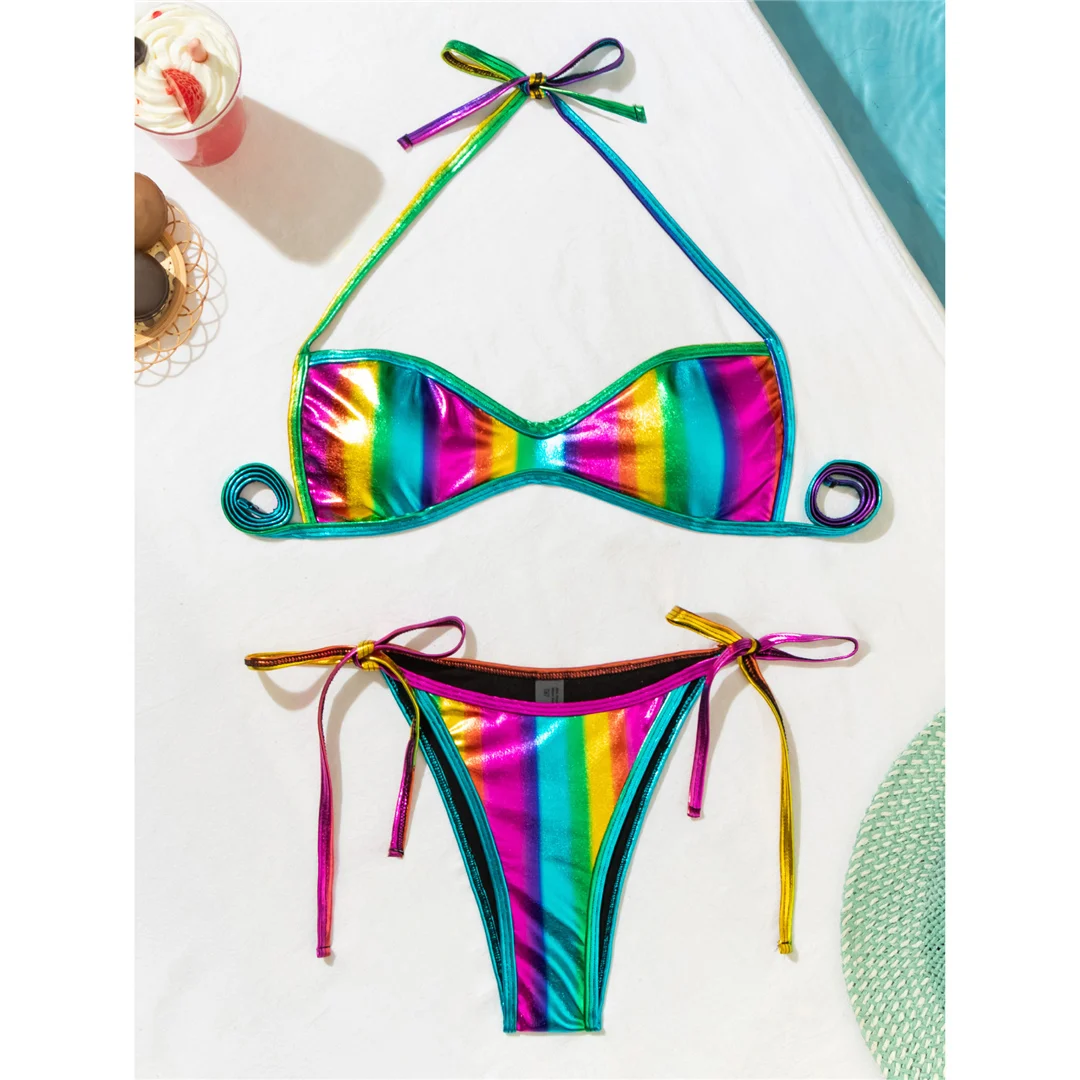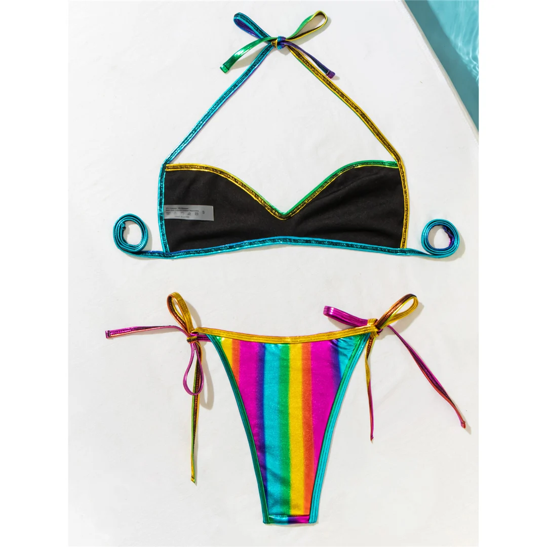 Rainbow Halter Strappy High Leg Cut Bikini Female Swimsuit Women Swimwear Two-pieces Bikini set Bather Bathing Suit Swim V5959