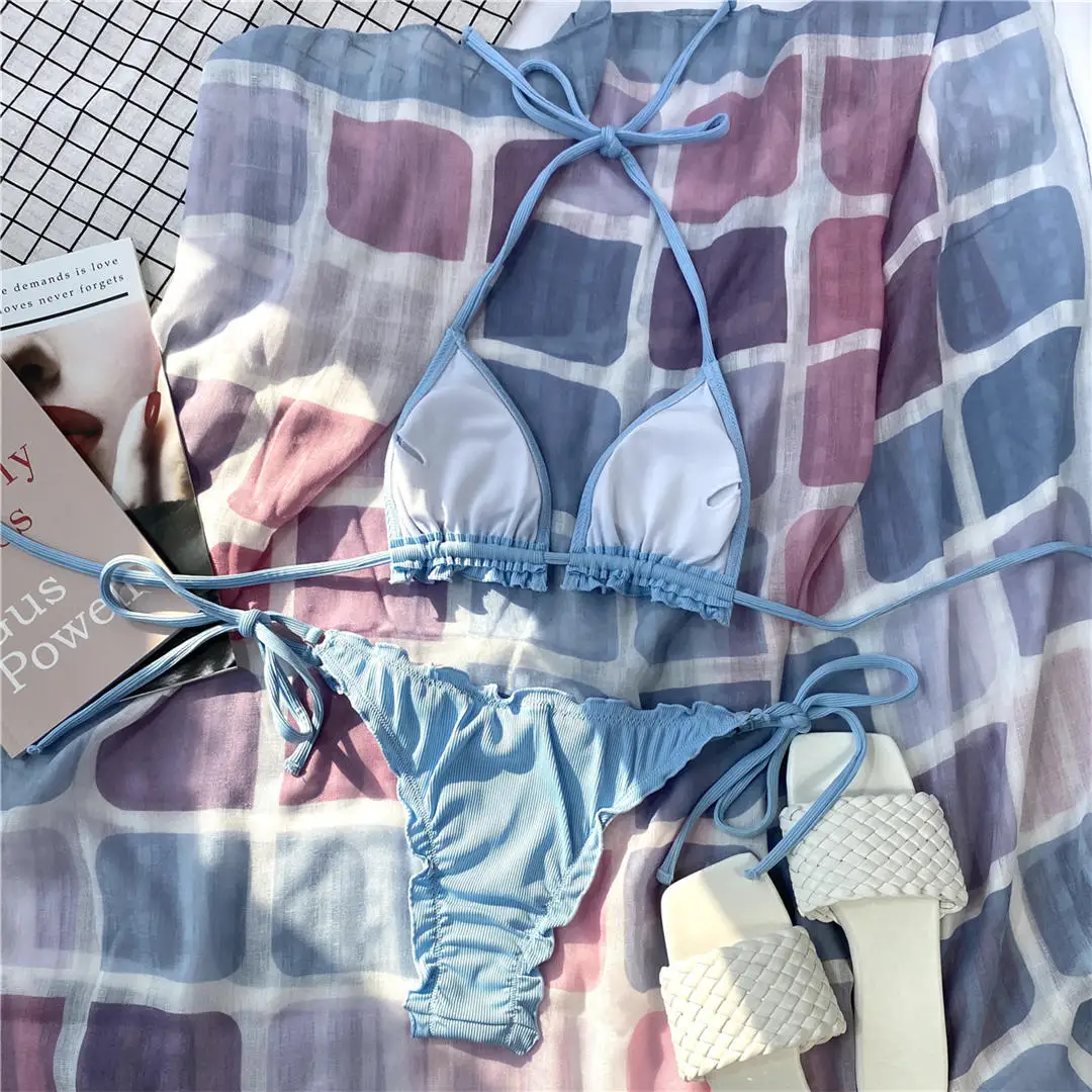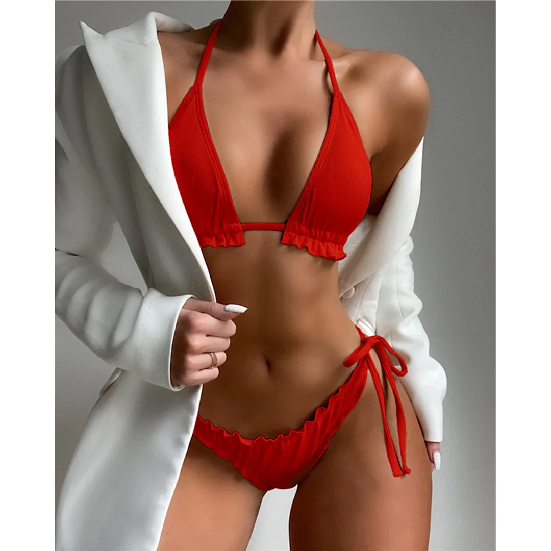 Ruffled Frilled Brazilian Bikini Women Swimwear Female Swimsuit Two-pieces Bikini set Halter Bather Bathing Suit Swim Lady V2817