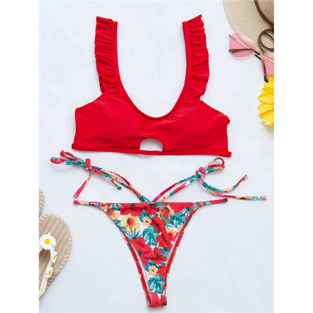 Ruffled Frilled Floral Bikini Women Swimwear Female Swimsuit Two-pieces Bikini set Padded Bather Bathing Suit Swim Lady V3055