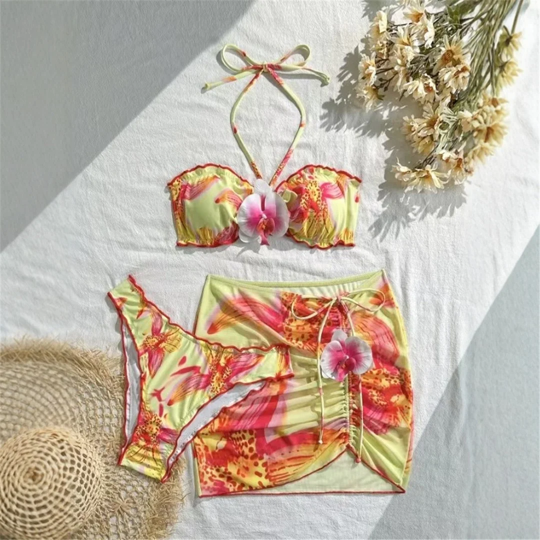 S – XL 3D Flowers With Skirt Halter Bikini Female Swimsuit Women Swimwear Three-pieces Bikini set Bather Bathing Suit Swim V7324