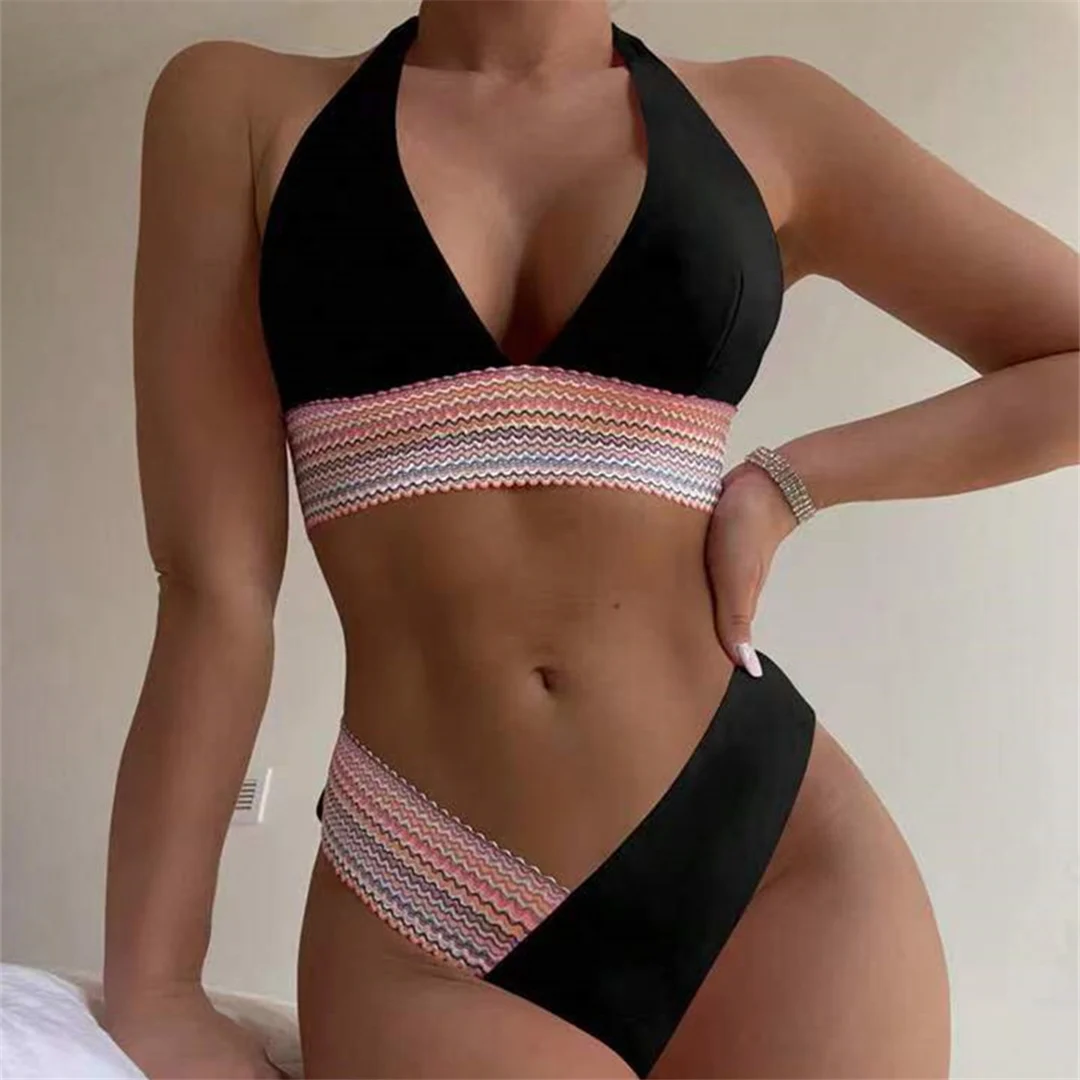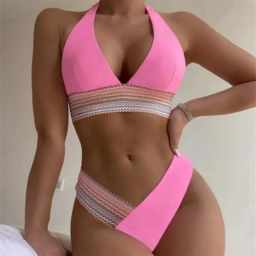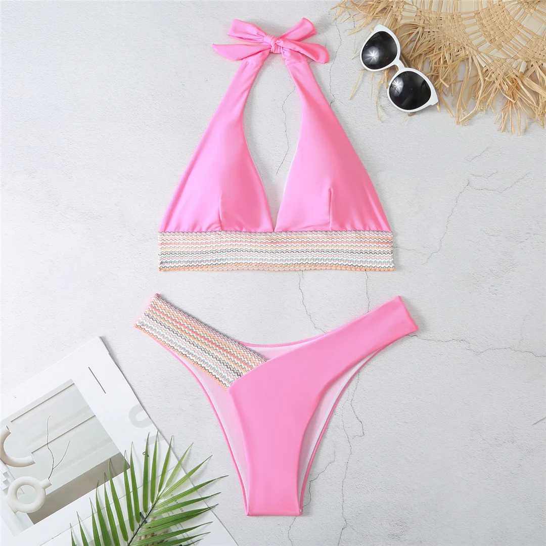 S – XL 5 Color Splicing Halter V Neck Bikini Female Swimsuit Women Swimwear Two-pieces Bikini set Bather Bathing Suit Swim V5142