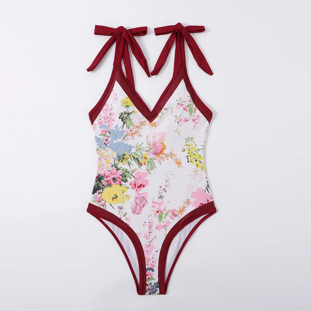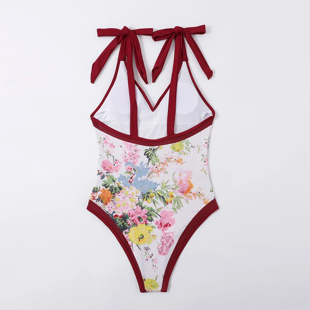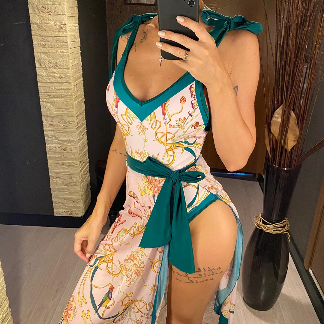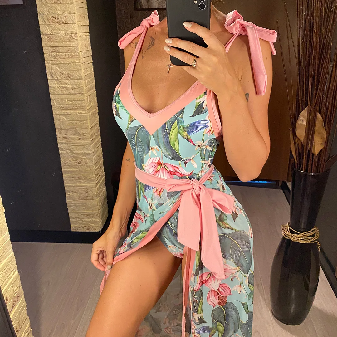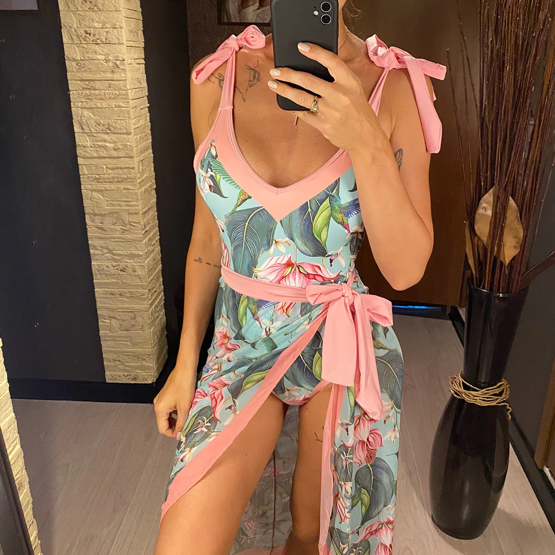 S – XL Flower Printed With Knotted Skirt One Piece Swimsuit Women Swimwear Female Floral V Neck Bather Bathing Suit Swim V3965
