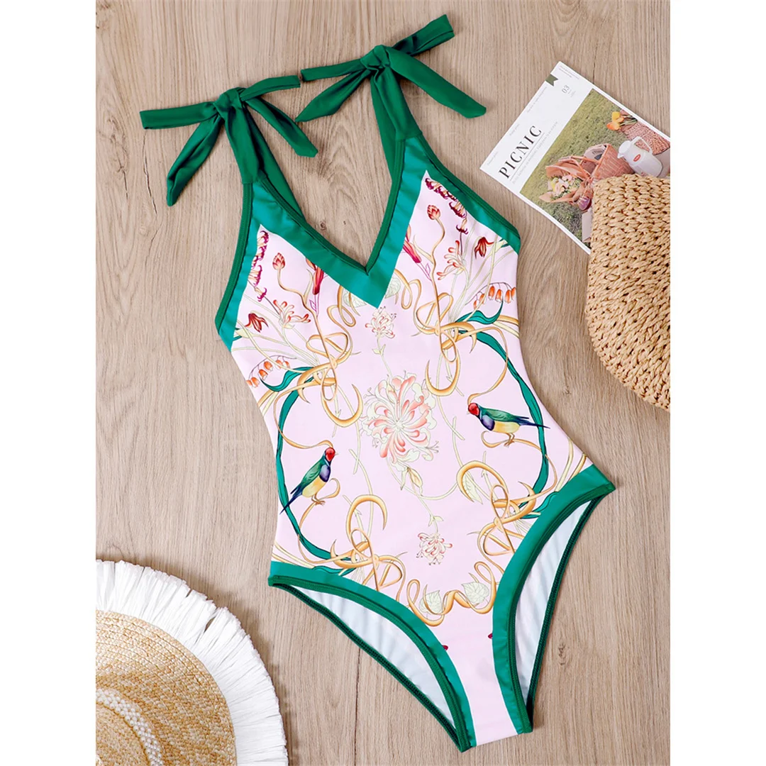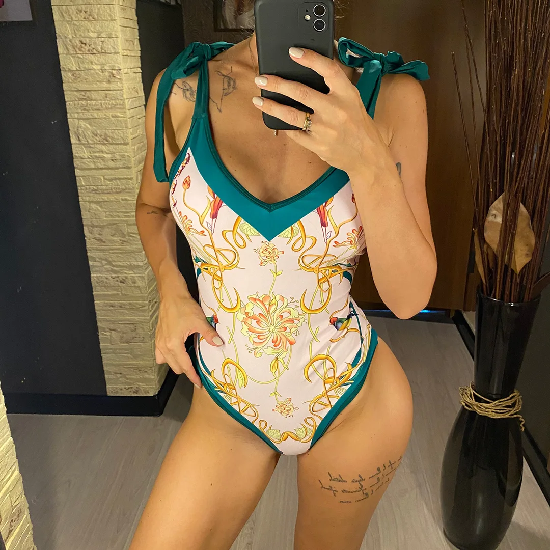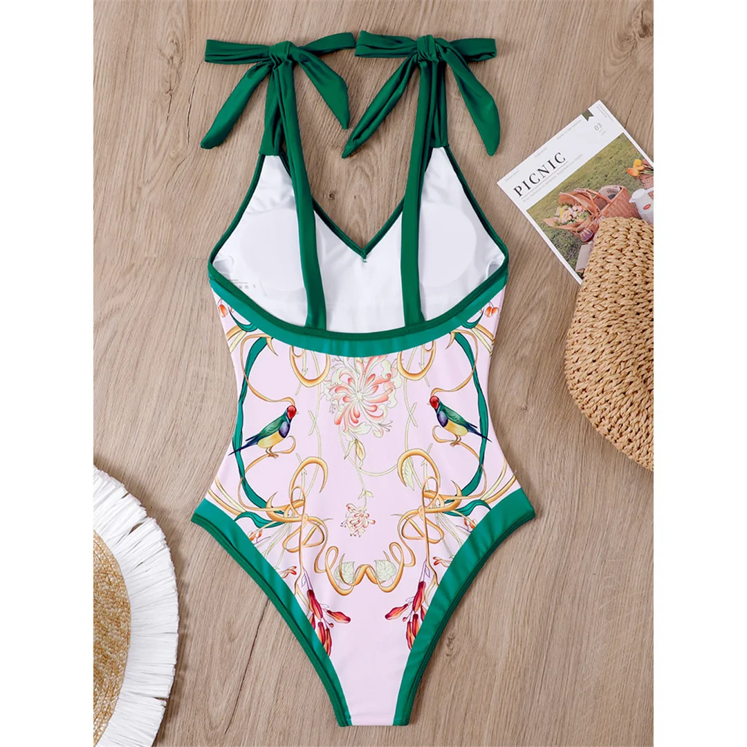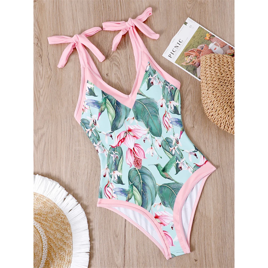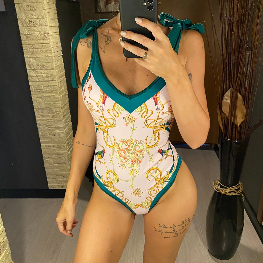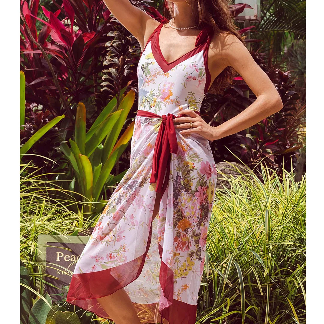 S – XL Flower Printed With Knotted Skirt One Piece Swimsuit Women Swimwear Female Floral V Neck Bather Bathing Suit Swim V3965