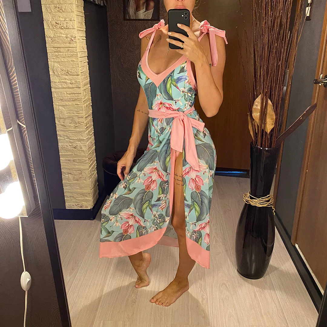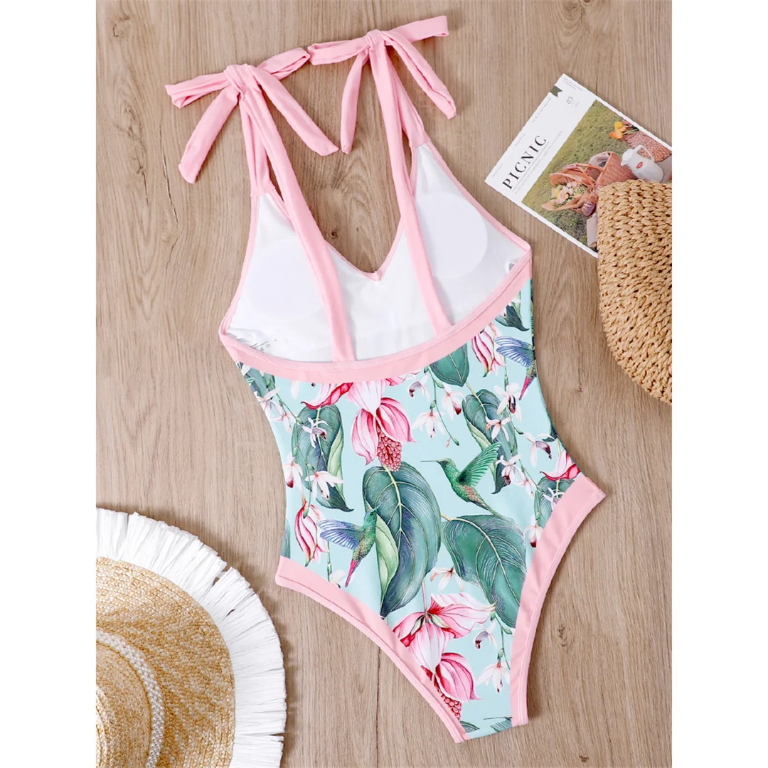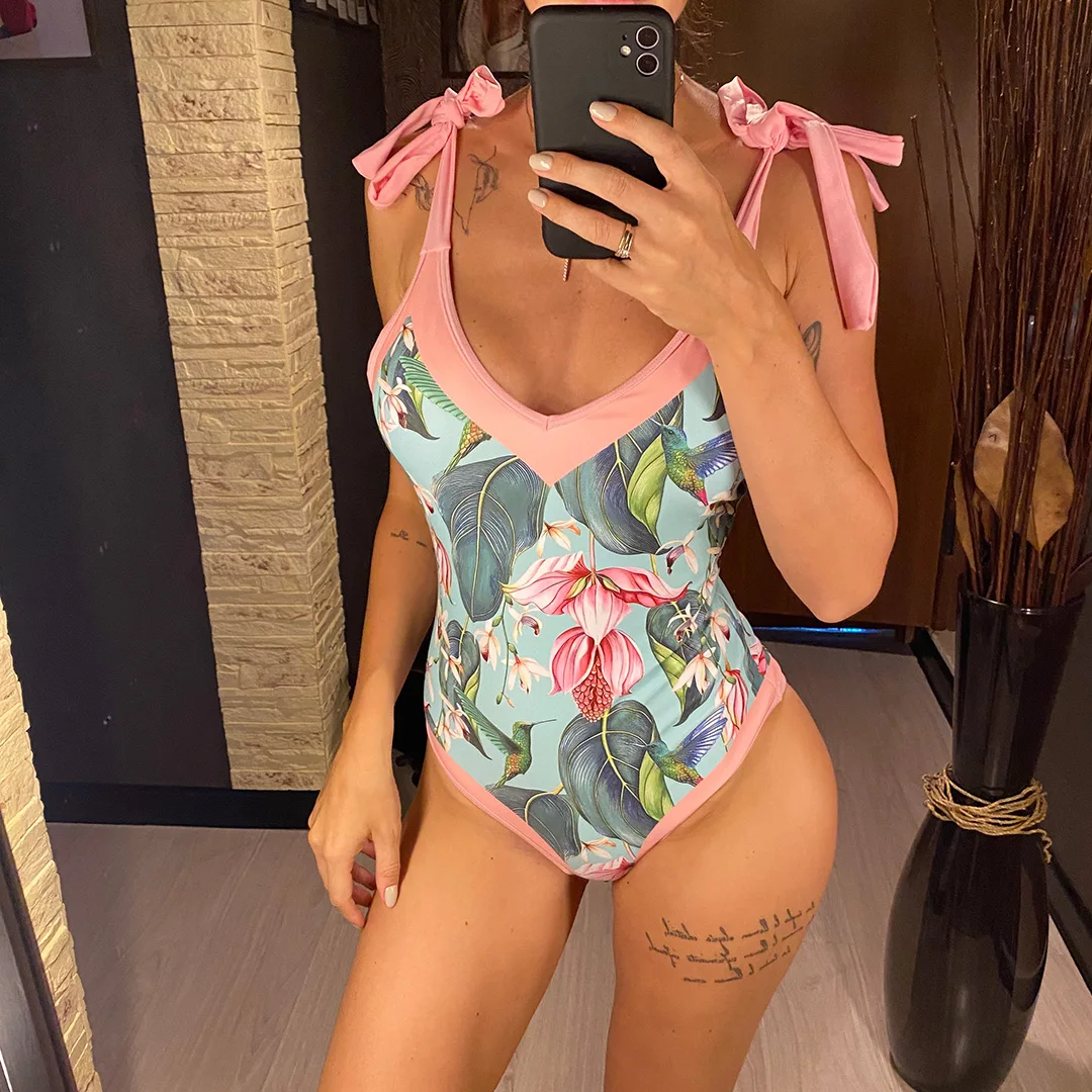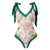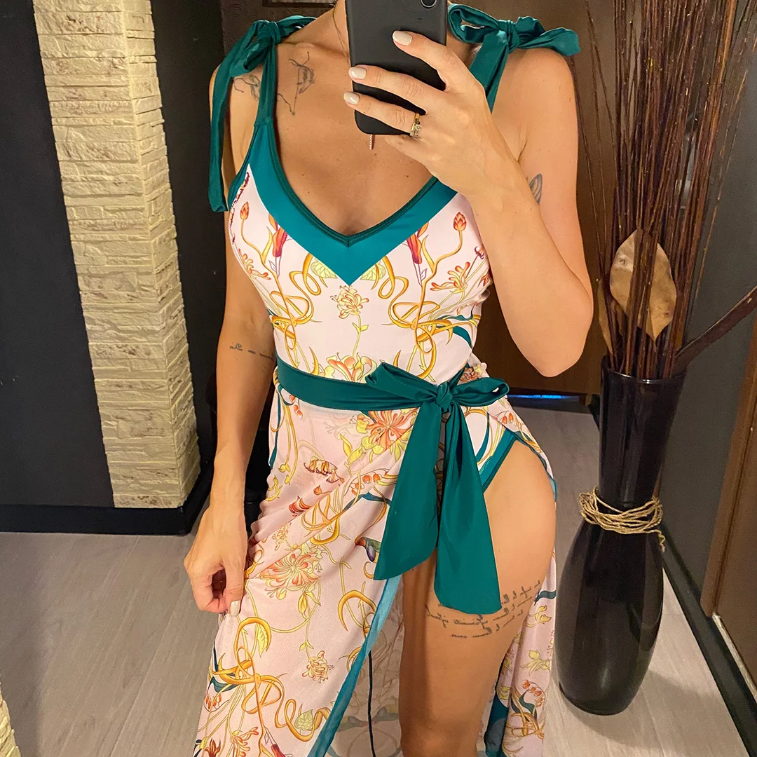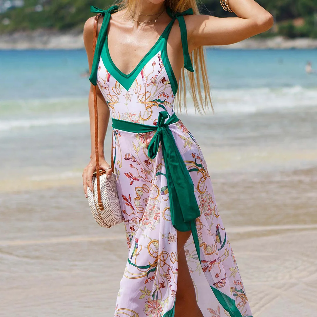 S – XL Flower Printed With Knotted Skirt One Piece Swimsuit Women Swimwear Female Floral V Neck Bather Bathing Suit Swim V3965