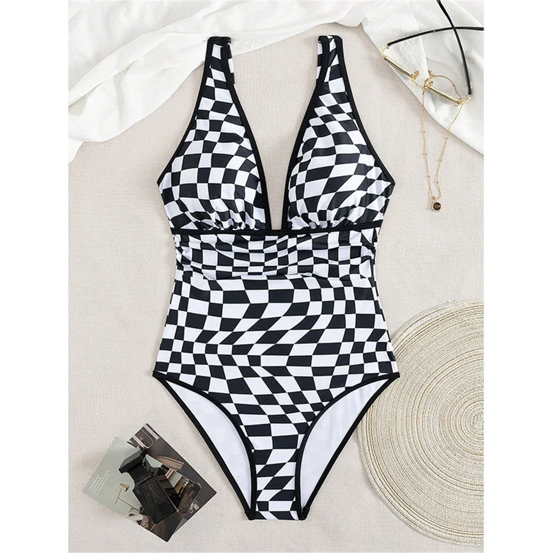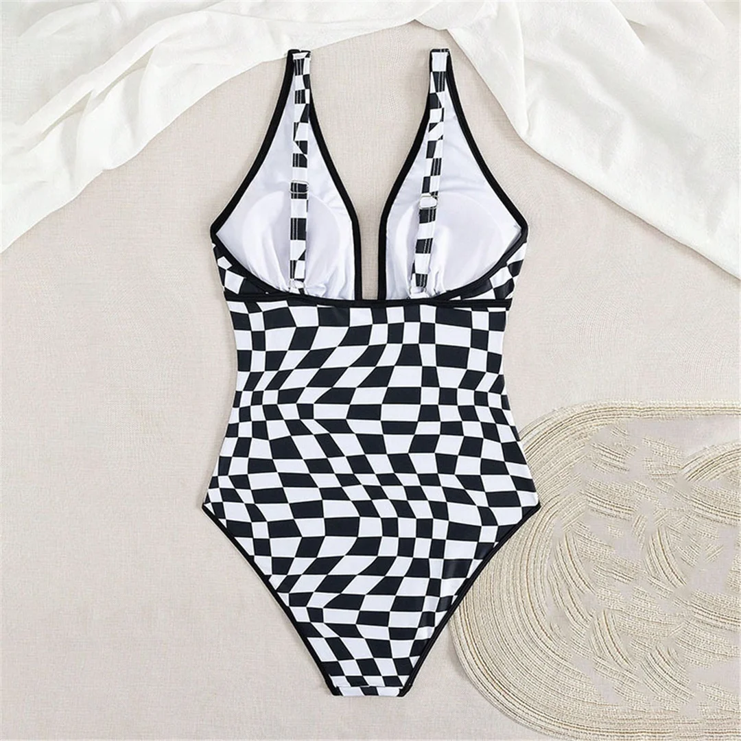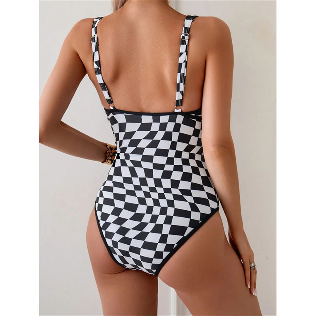 S – XL Sexy Plaid V Neck Monokini Women Swimwear One Piece Swimsuit Female Backless High Leg Cut Bather Bathing Suit Swim V7291