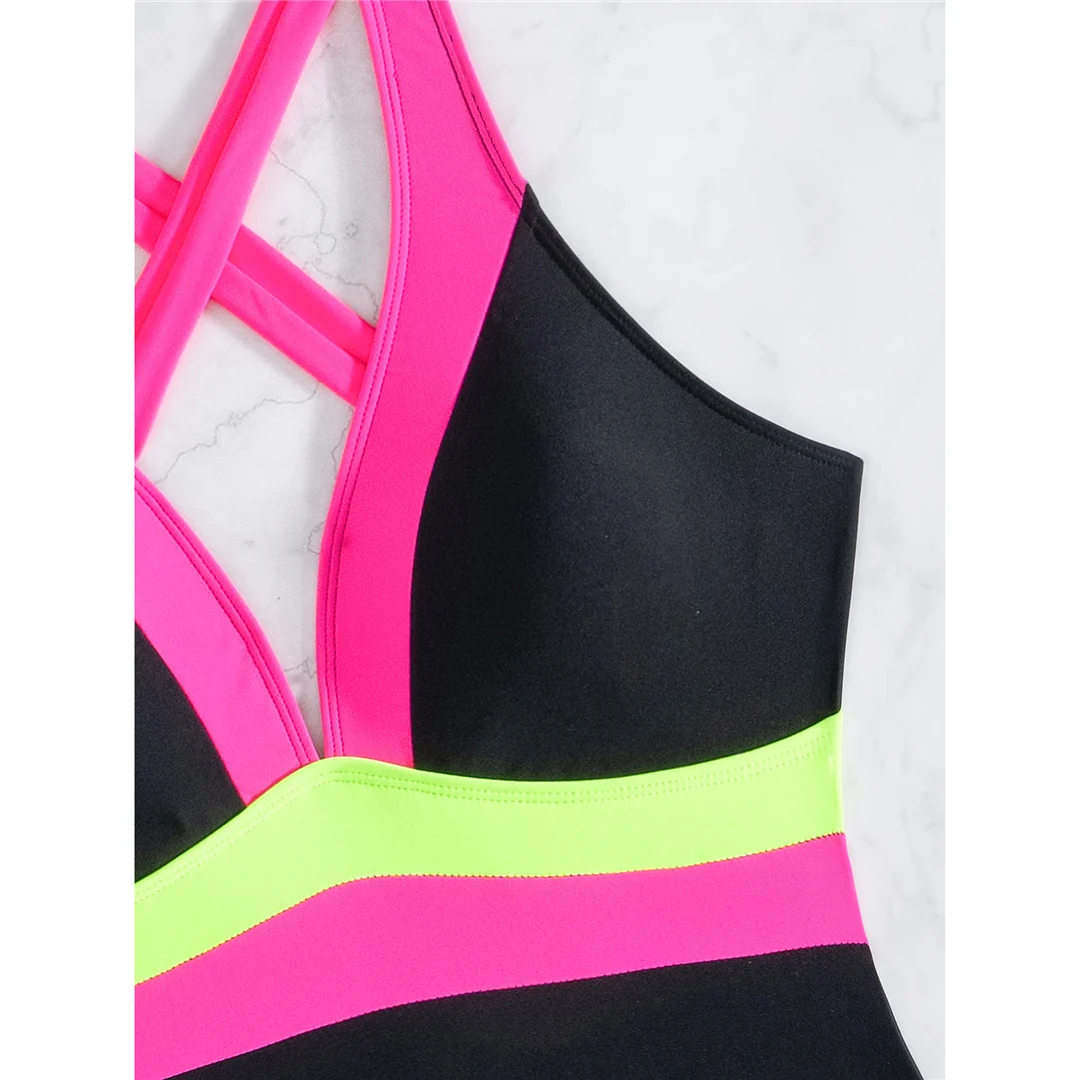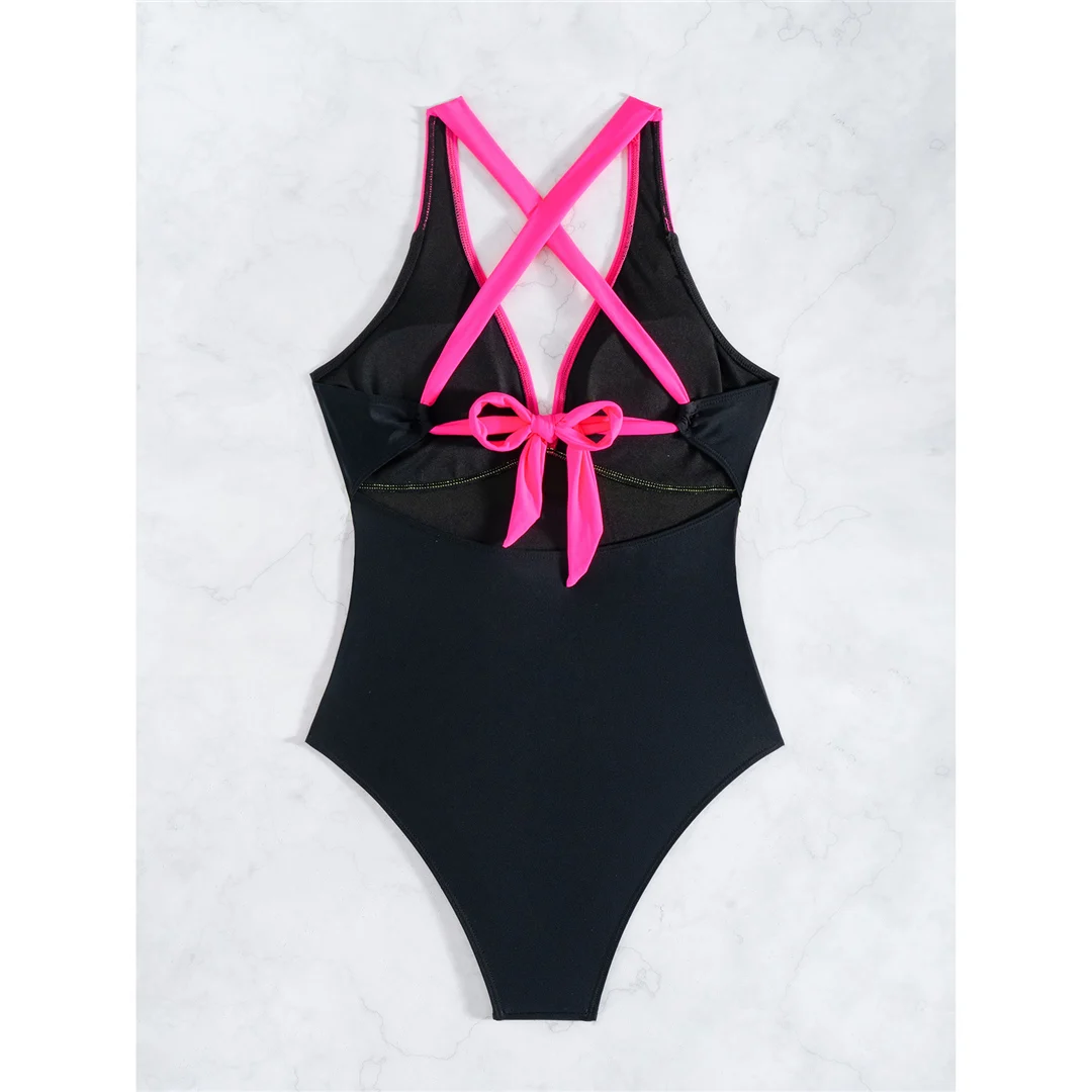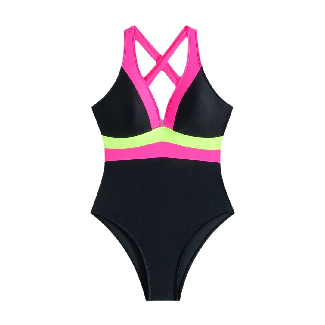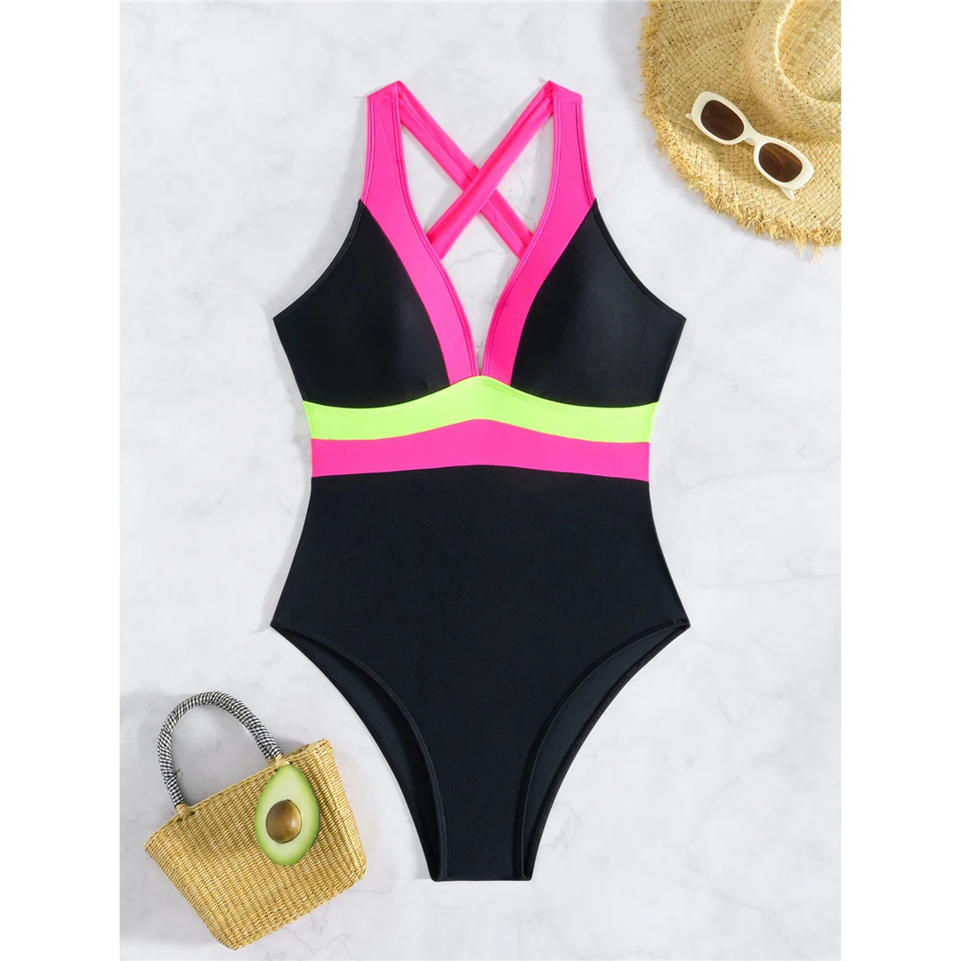 S – XL Splicing V Neck Cross Back Women Swimwear One Piece Swimsuit Female High Cut Leg Padded Bather Bathing Suit Swim V6453