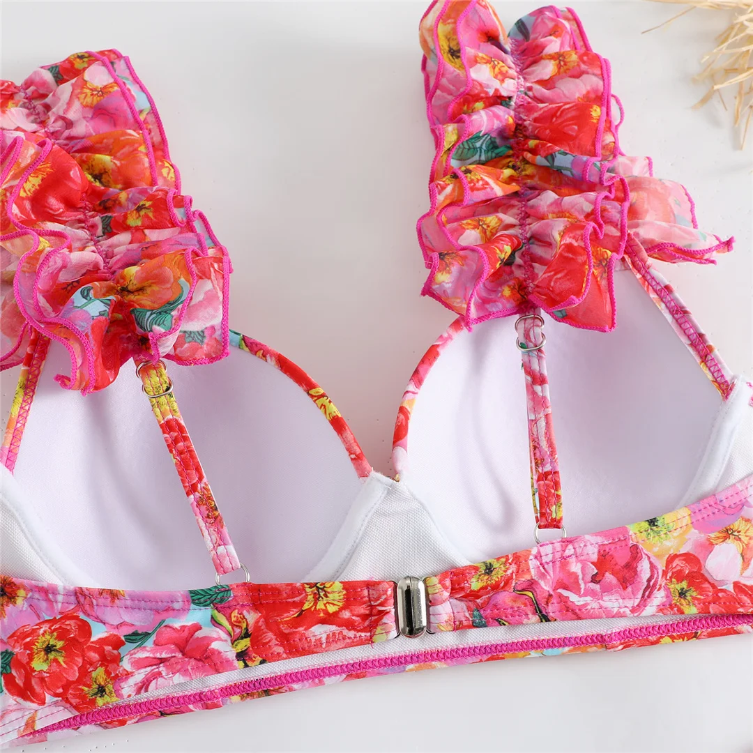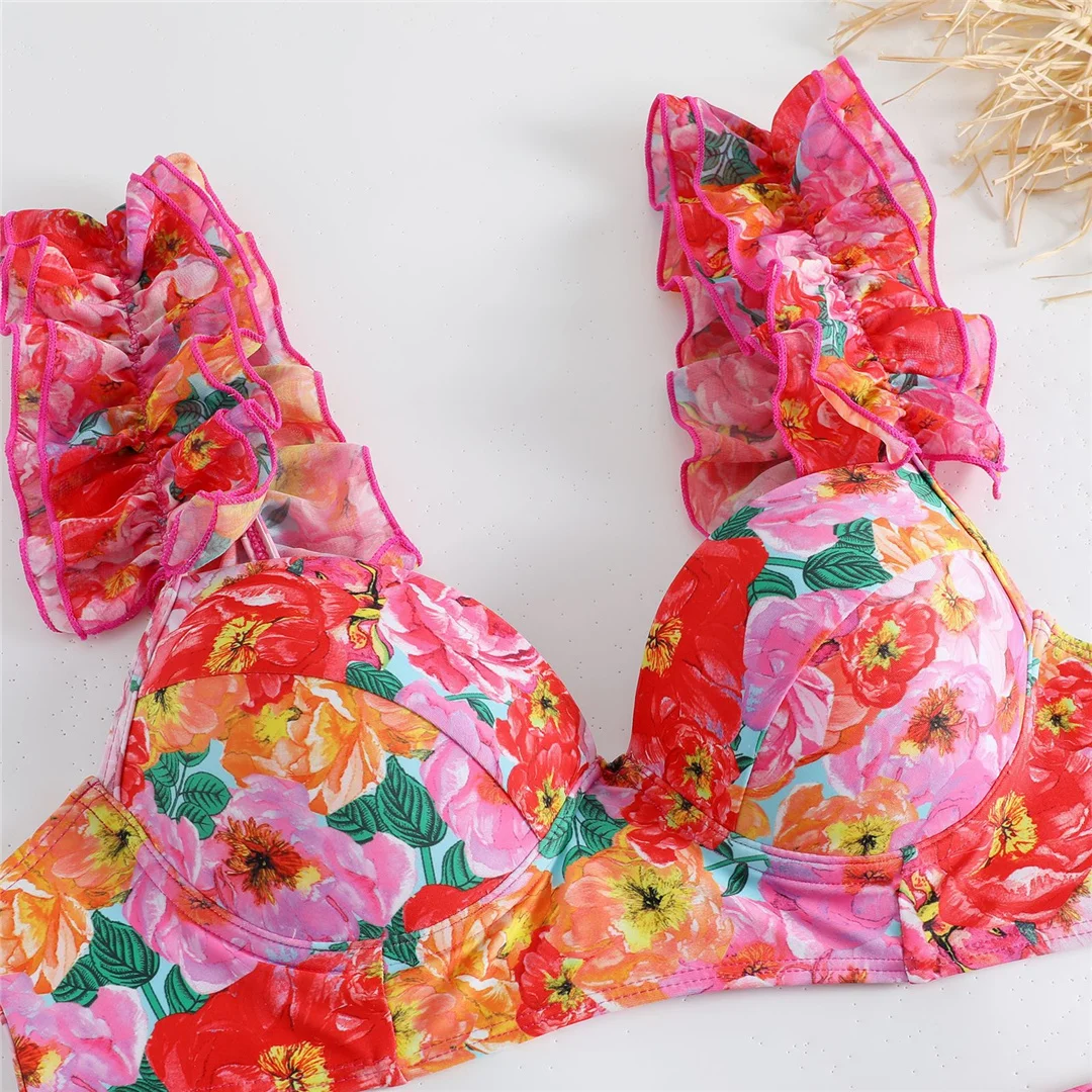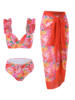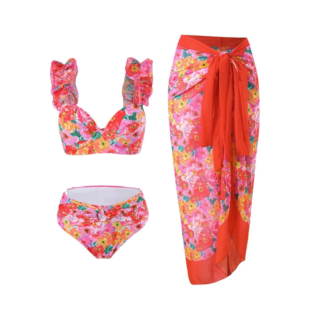 S – XL With Sarong Flower Printed Bikini Female Swimsuit Women Swimwear Three-pieces Bikini set Bather Bathing Suit Swim V7093