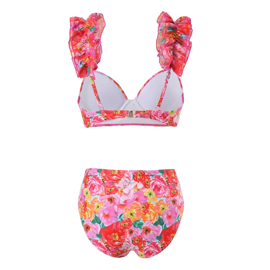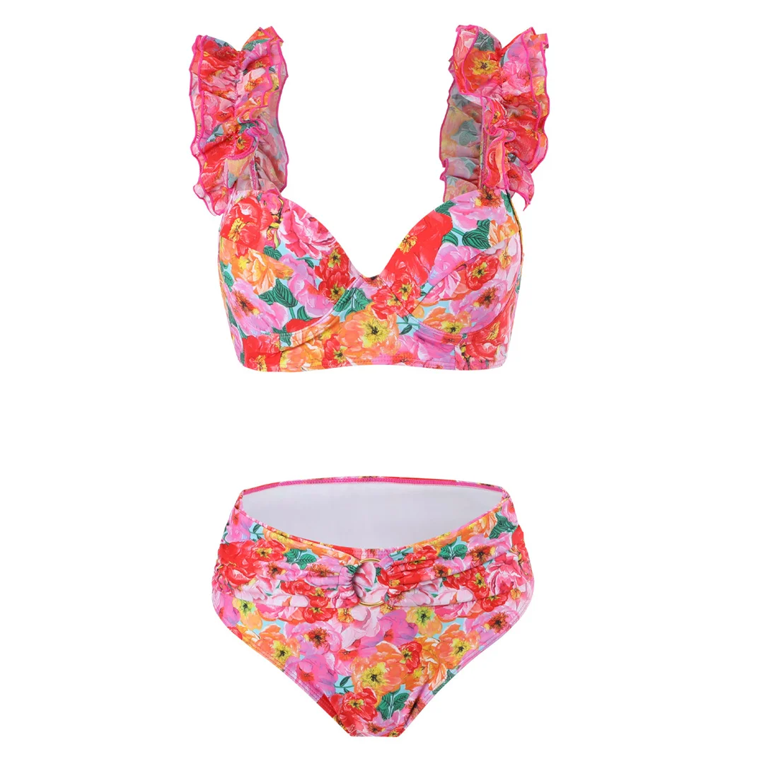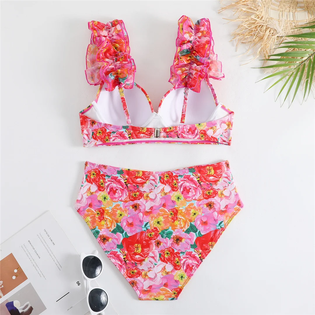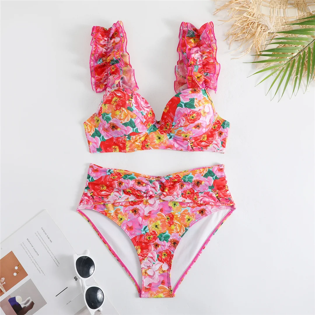 S – XL With Sarong Flower Printed Bikini Female Swimsuit Women Swimwear Three-pieces Bikini set Bather Bathing Suit Swim V7093