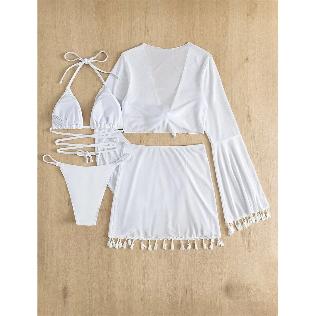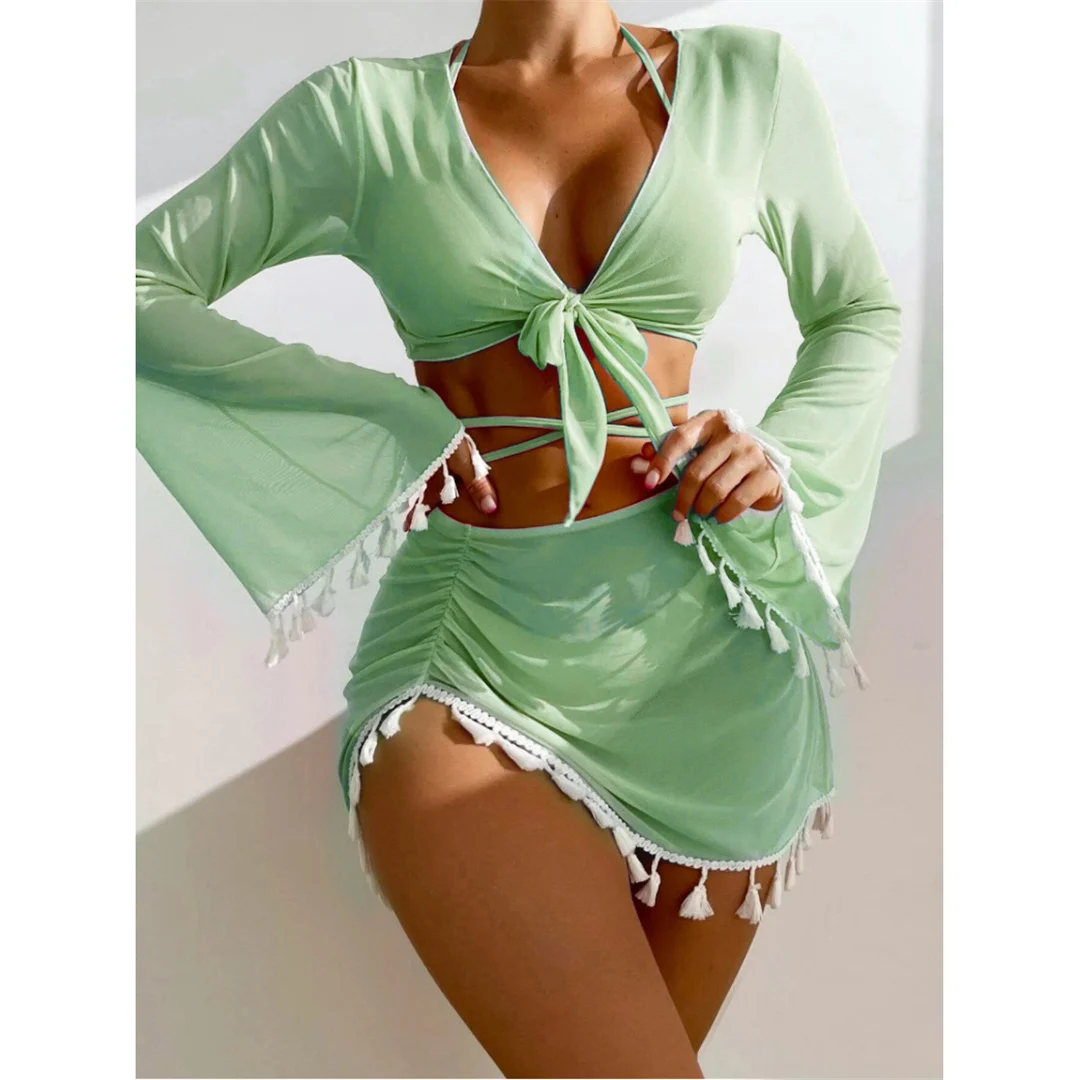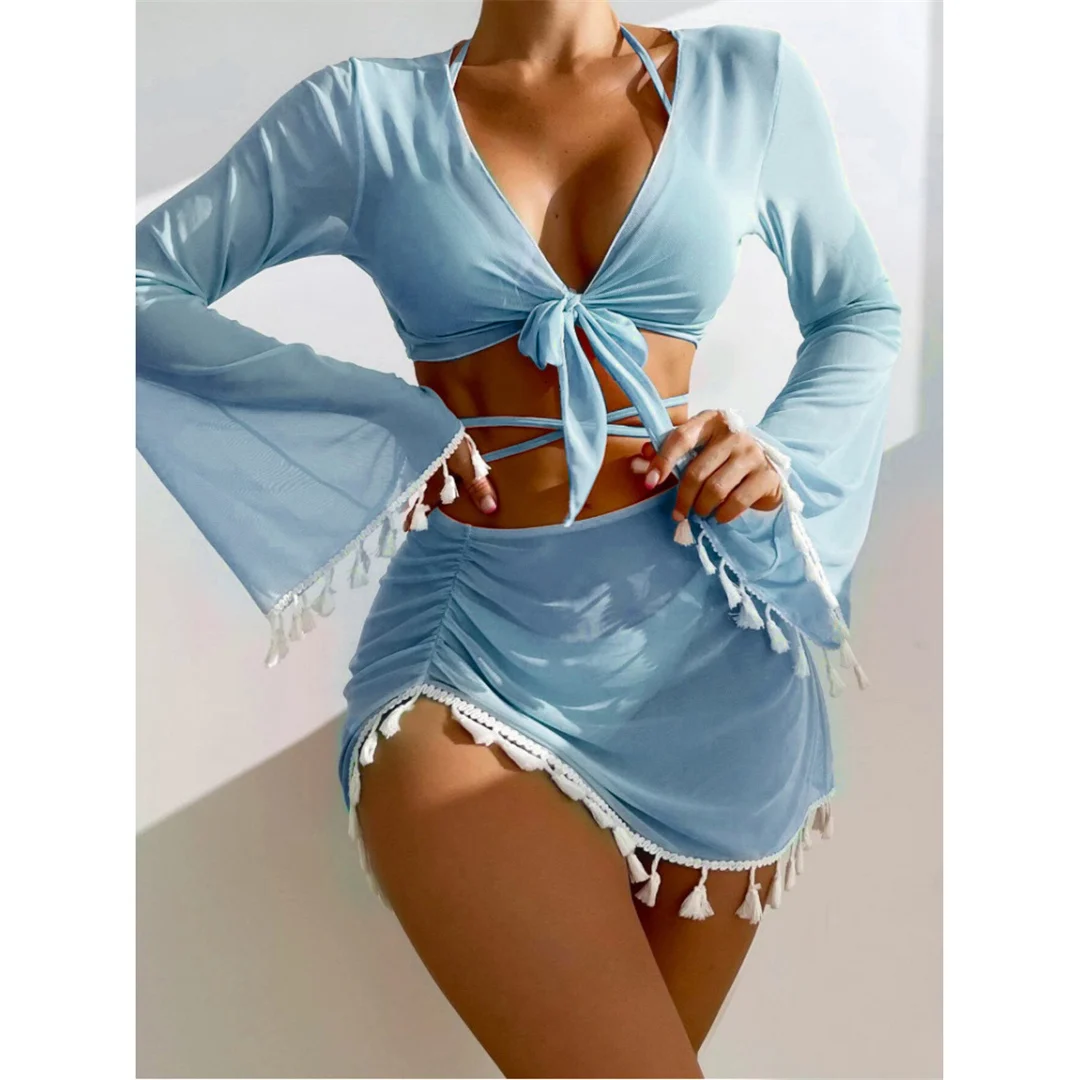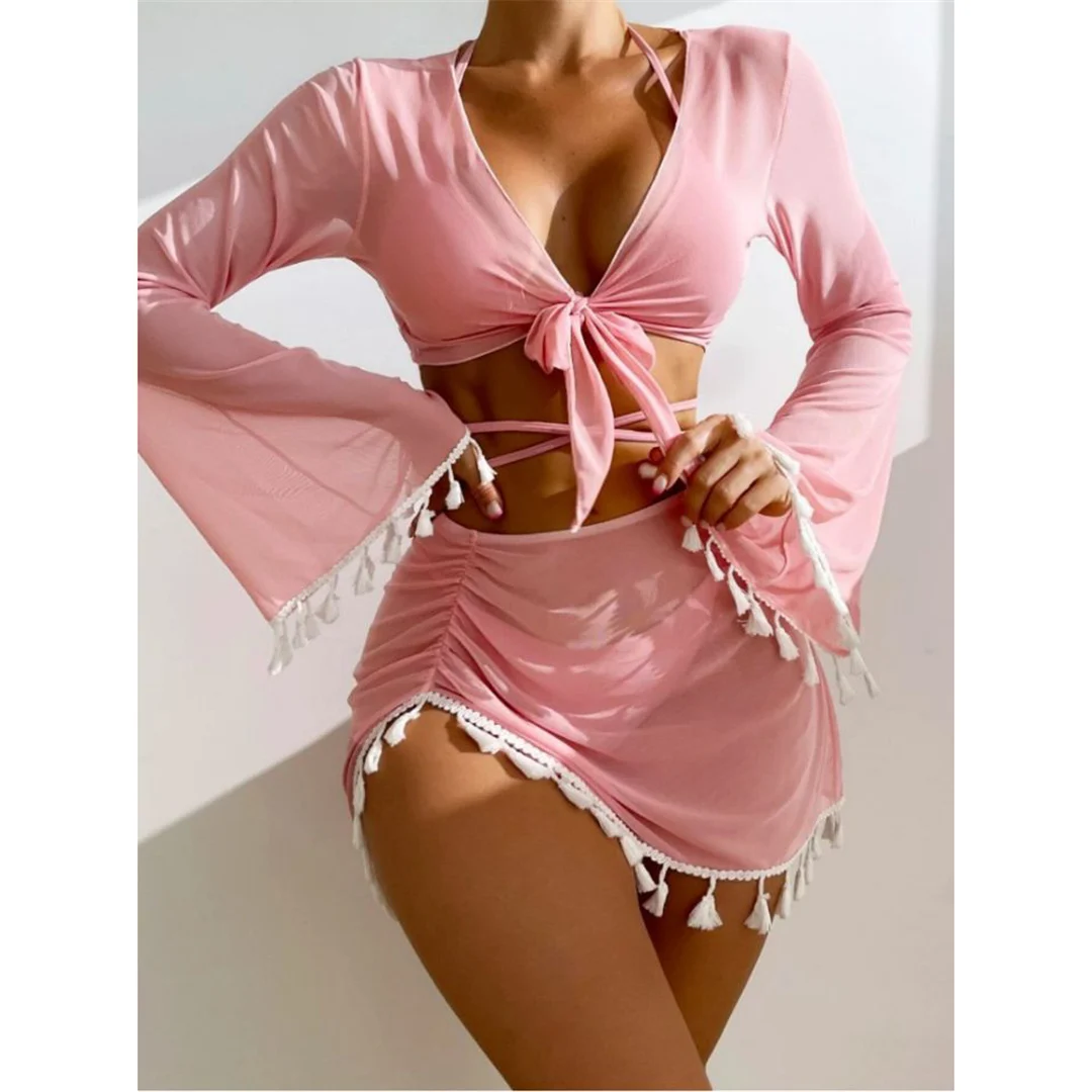 S – XL With Tassel Skirt Long Sleeve Bikini Women Swimwear Female Swimsuit Four-pieces Bikini set Bather Bathing Suit Swim V7060