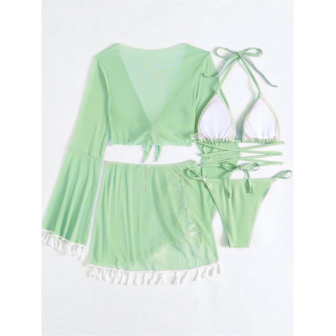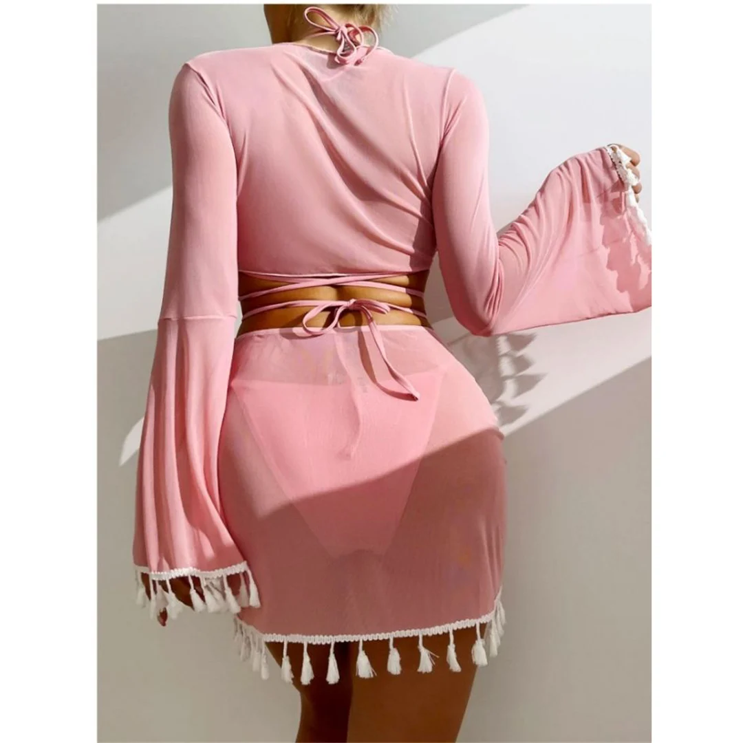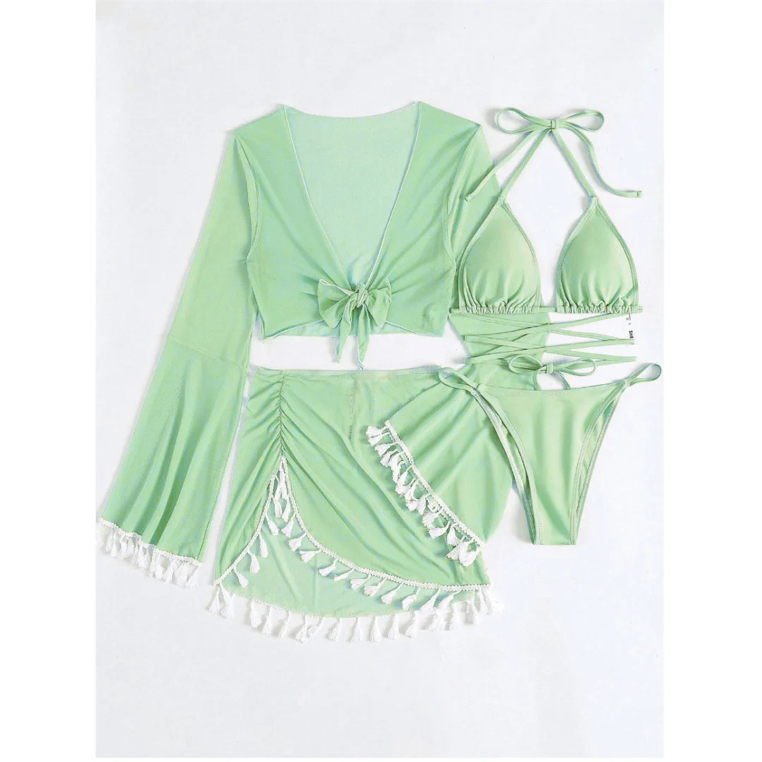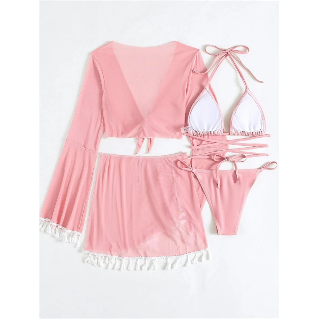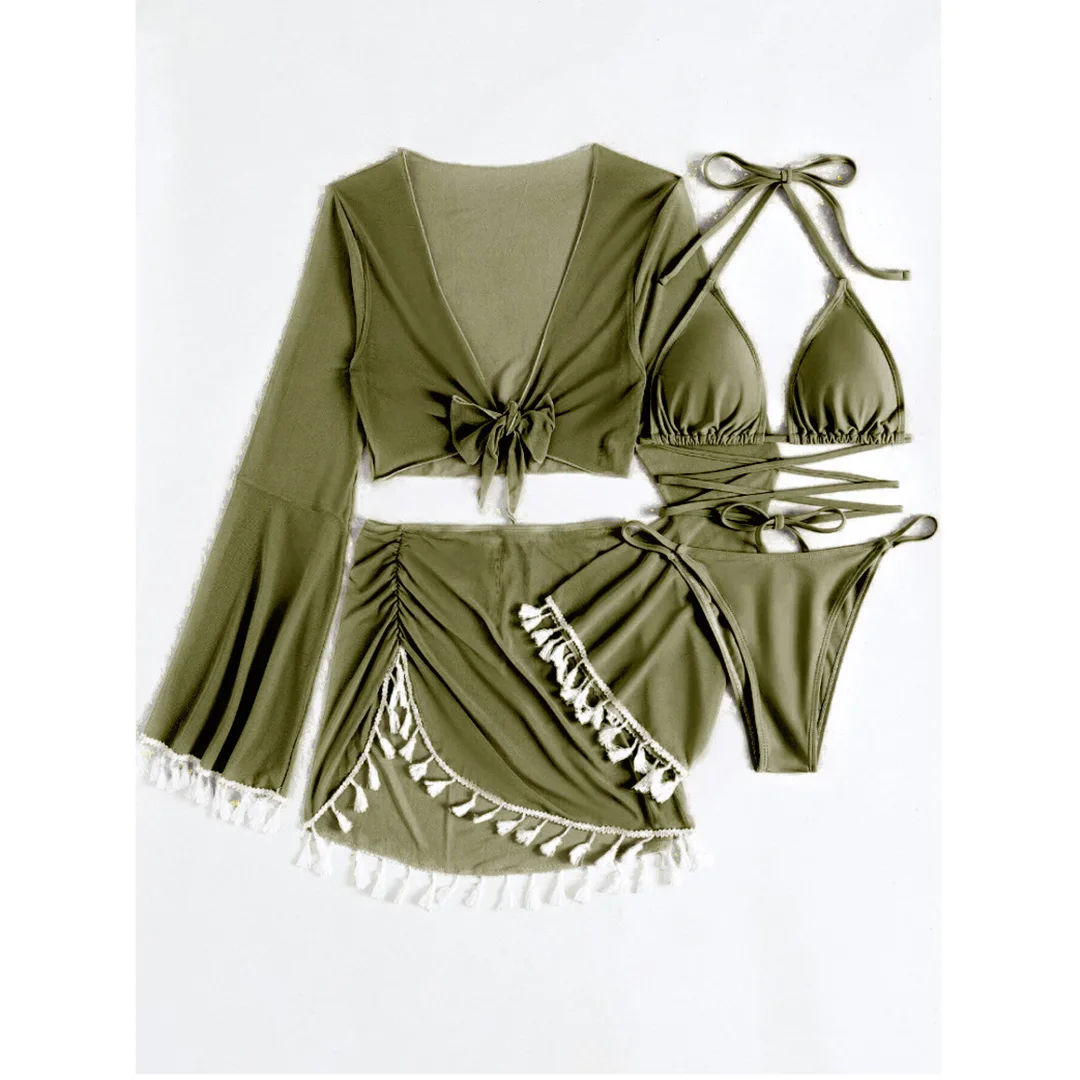 S – XL With Tassel Skirt Long Sleeve Bikini Women Swimwear Female Swimsuit Four-pieces Bikini set Bather Bathing Suit Swim V7060