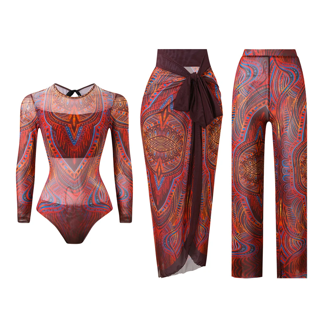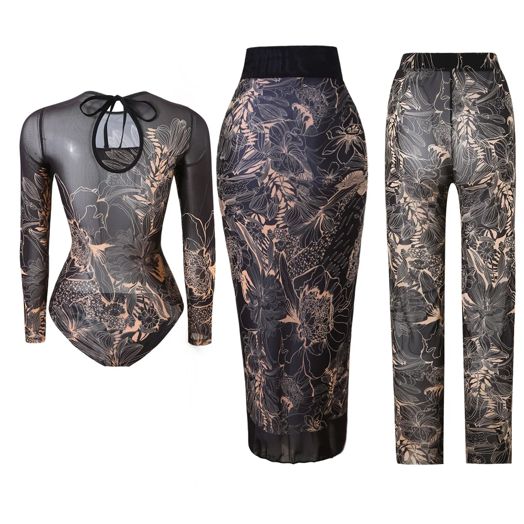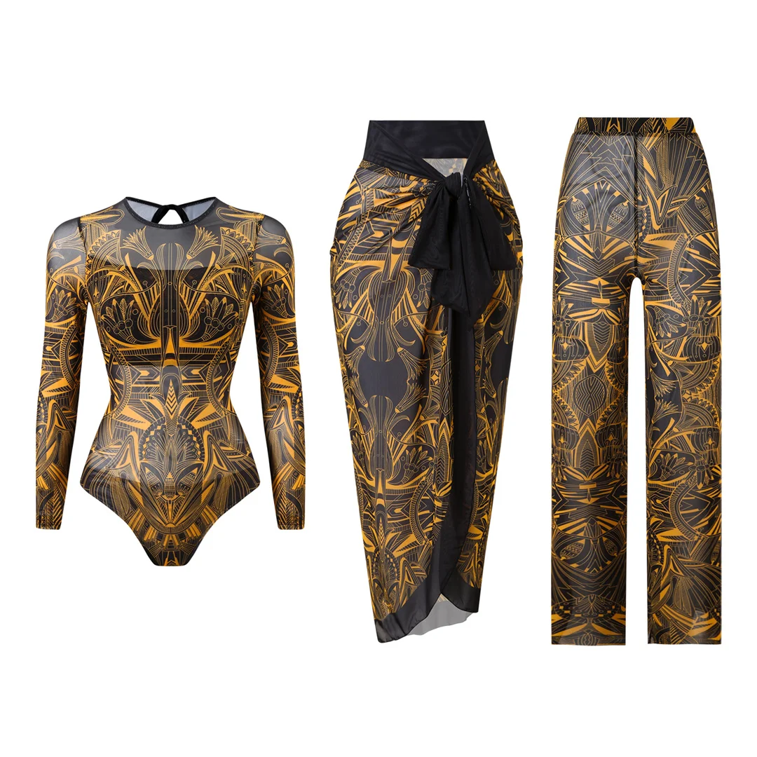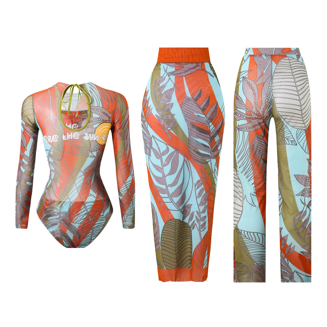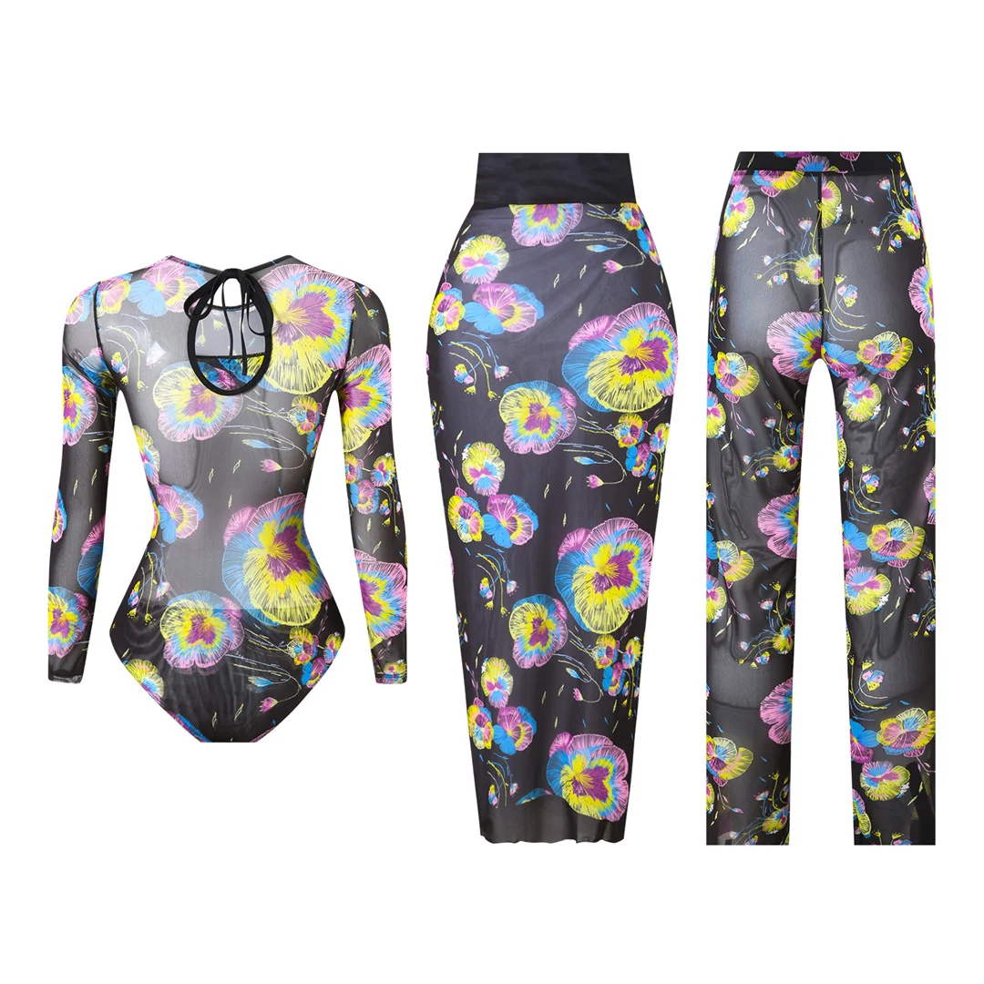 S – XXL 3PCS New Printed Long Sleeve With Pants Sarong Women Swimwear One Piece Swimsuit Female Bather Bathing Suit Swim V7180