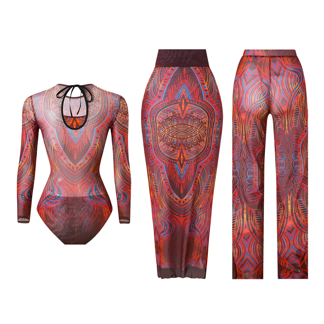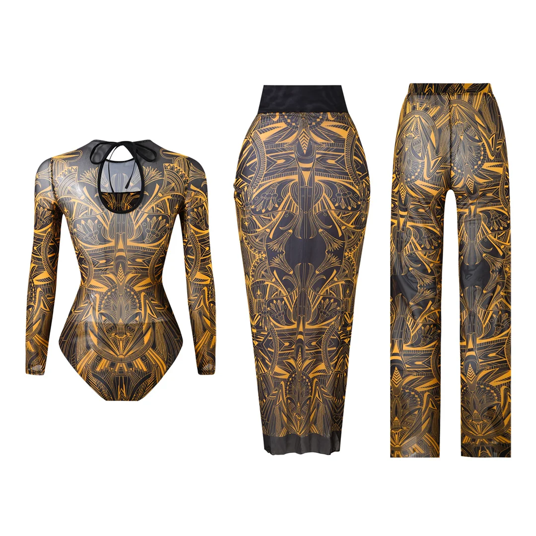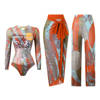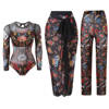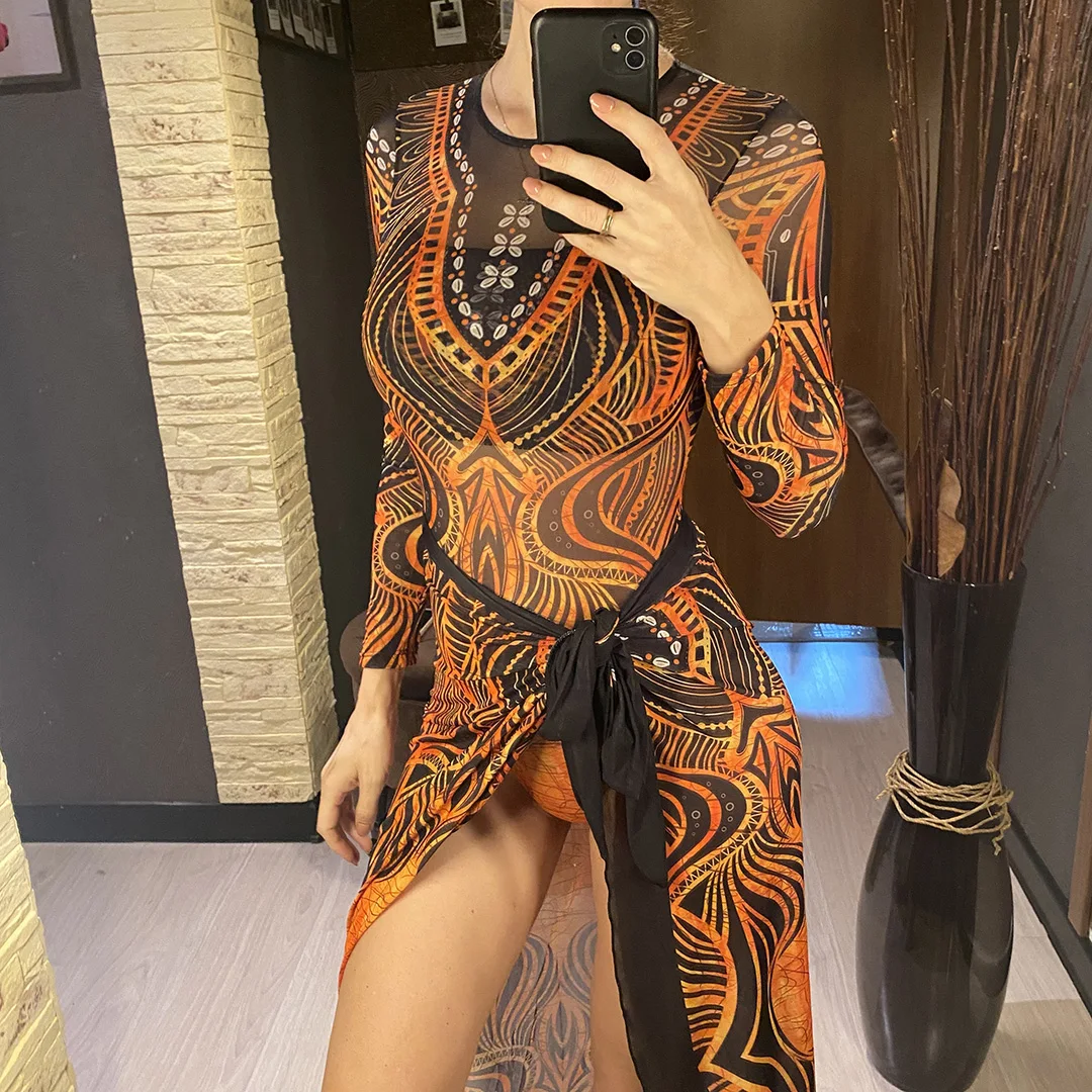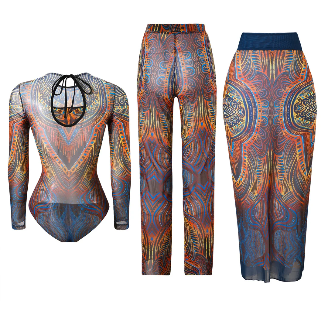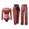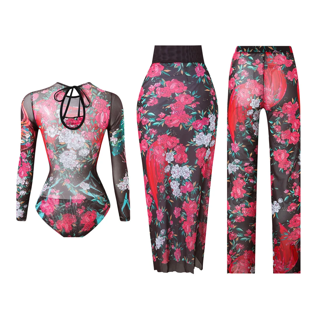S – XXL 3PCS New Printed Long Sleeve With Pants Sarong Women Swimwear One Piece Swimsuit Female Bather Bathing Suit Swim V7180