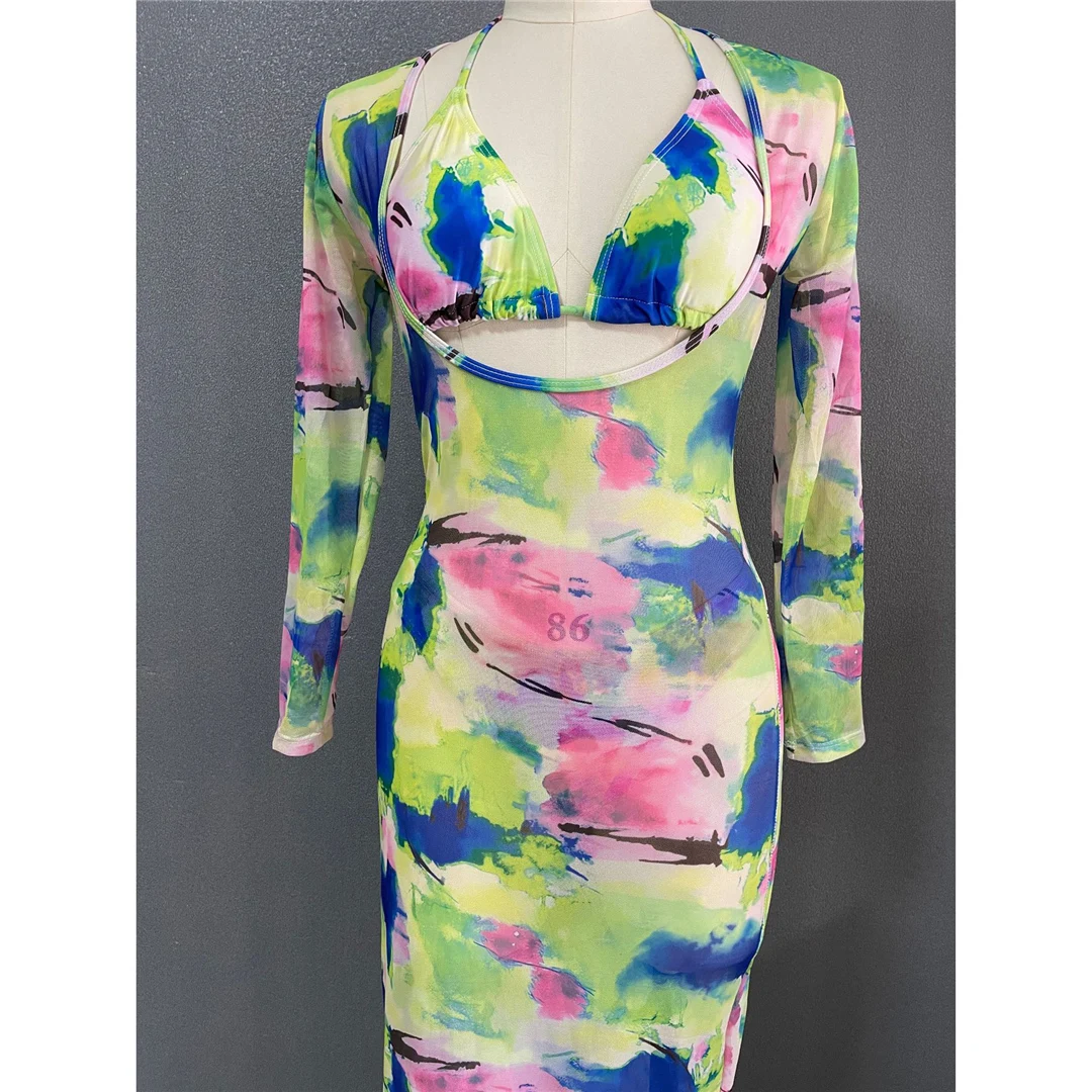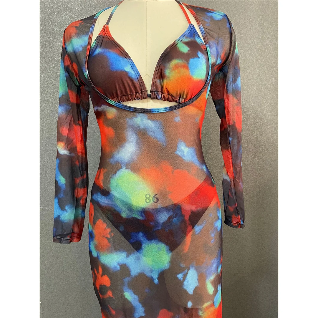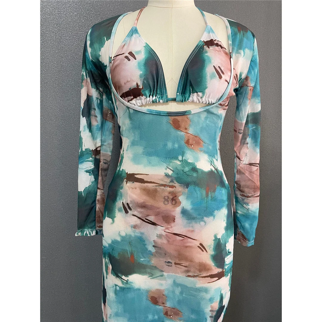 S- XXL Printed Long Sleeve Cover Up Bikini Female Swimsuit Women Swimwear Three-pieces Bikini set Bather Bathing Suit Swim V6337
