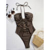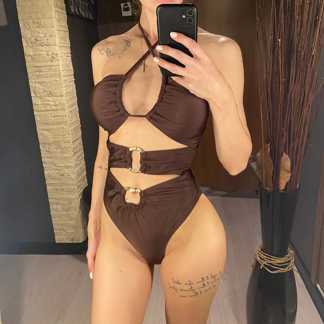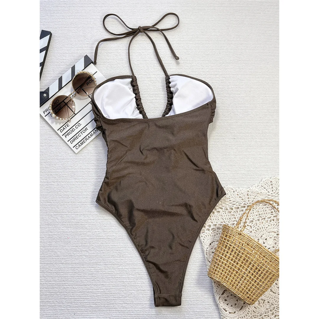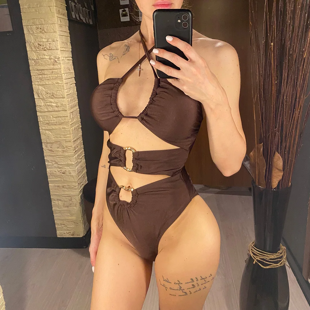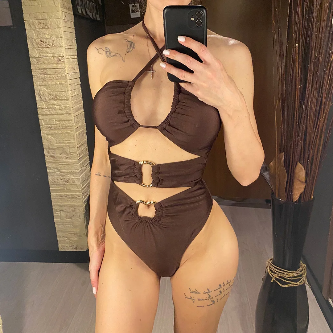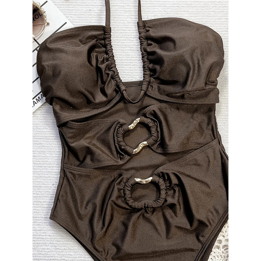 Sexy Cut Out Halter Wrinkled Metal Ring One Piece Swimsuit Women Swimwear Female Monokini Padded Bather Bathing Suit Swim V6707