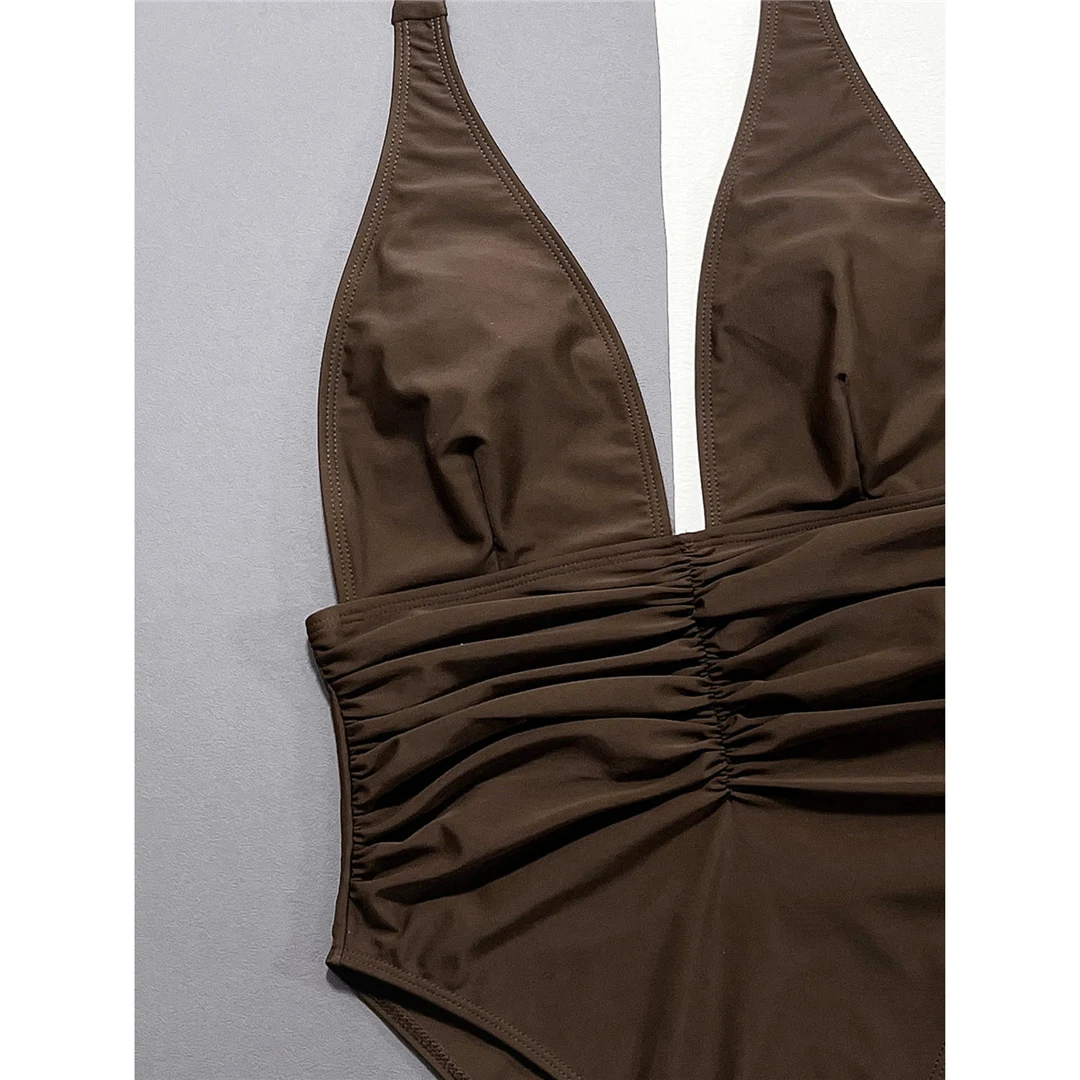 Sexy Deep V Neck Halter Wrinkled One Piece Swimsuit Women Swimwear Female Monokini High Leg Cut Bather Bathing Suit Swim V5538