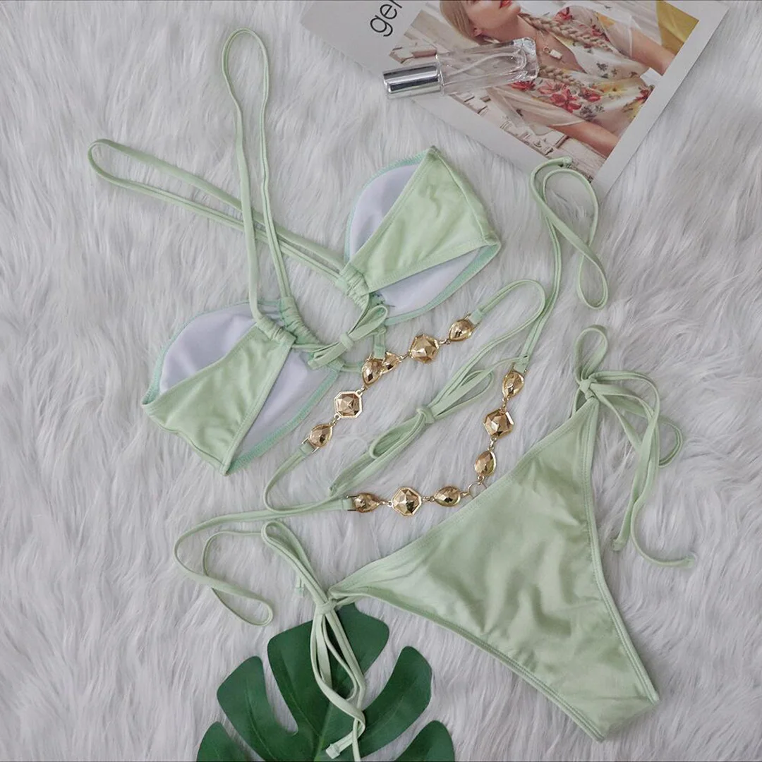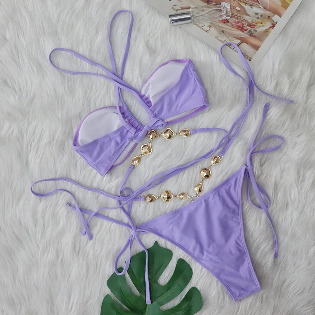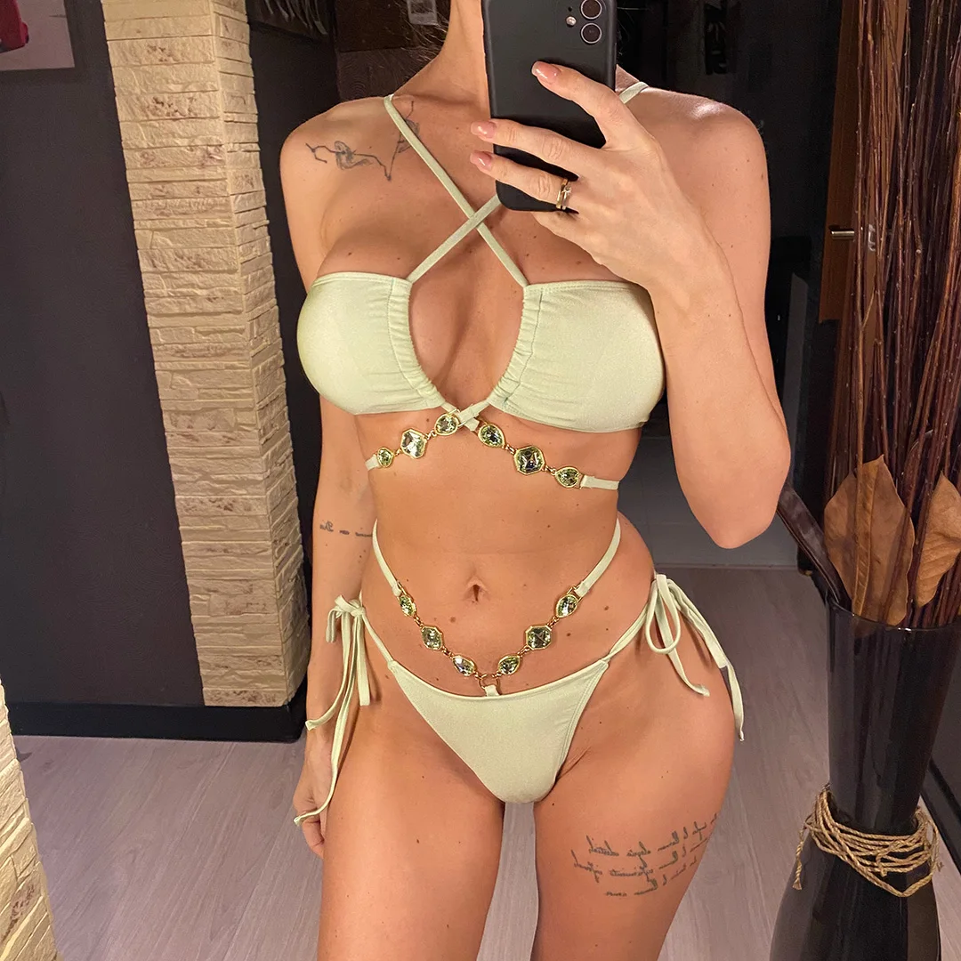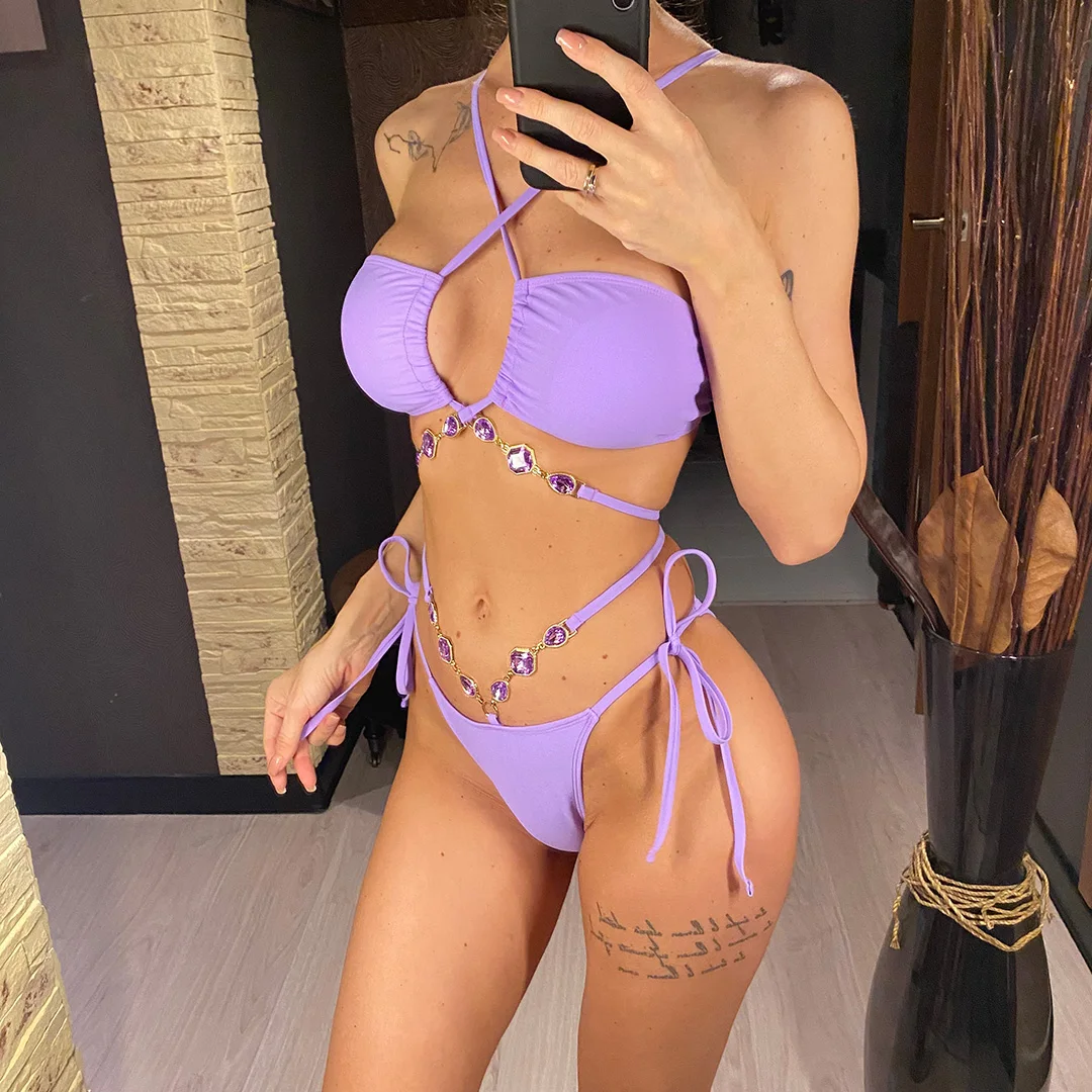 Sexy Diamond Rhinestones Wrap Around Bikini Female Swimsuit Women Swimwear Two-pieces Bikini set Bather Bathing Suit Swim V5167