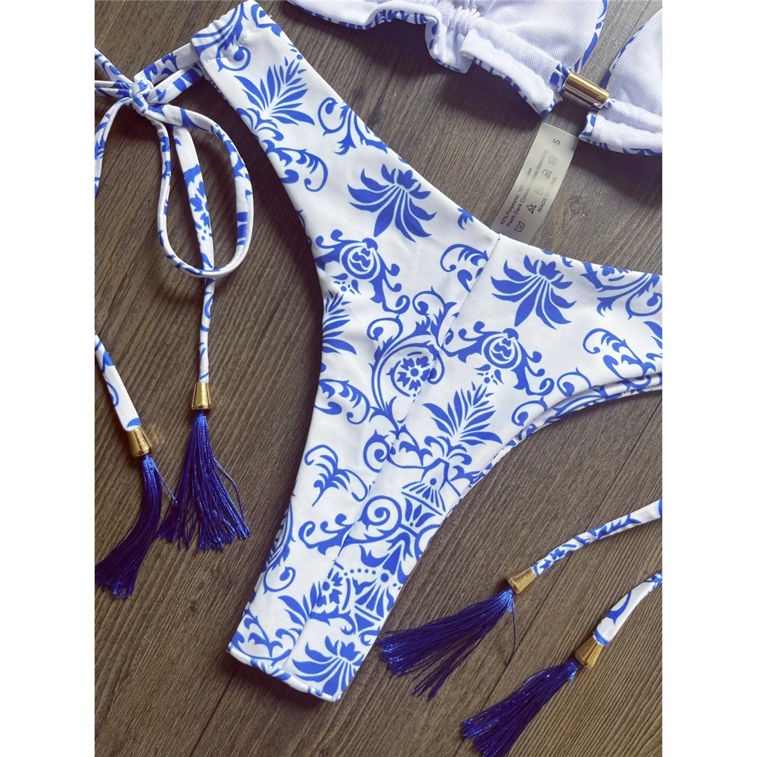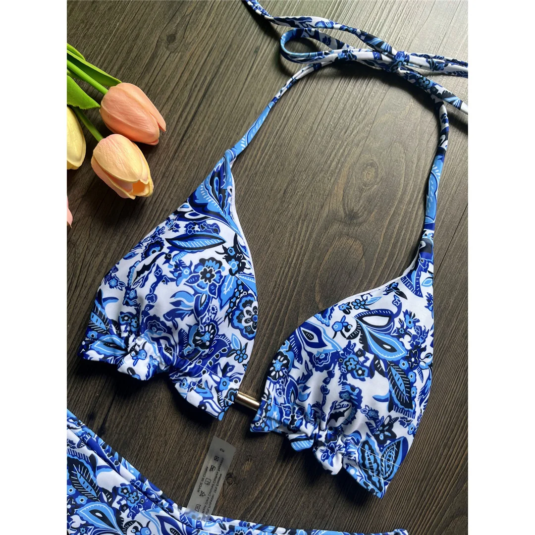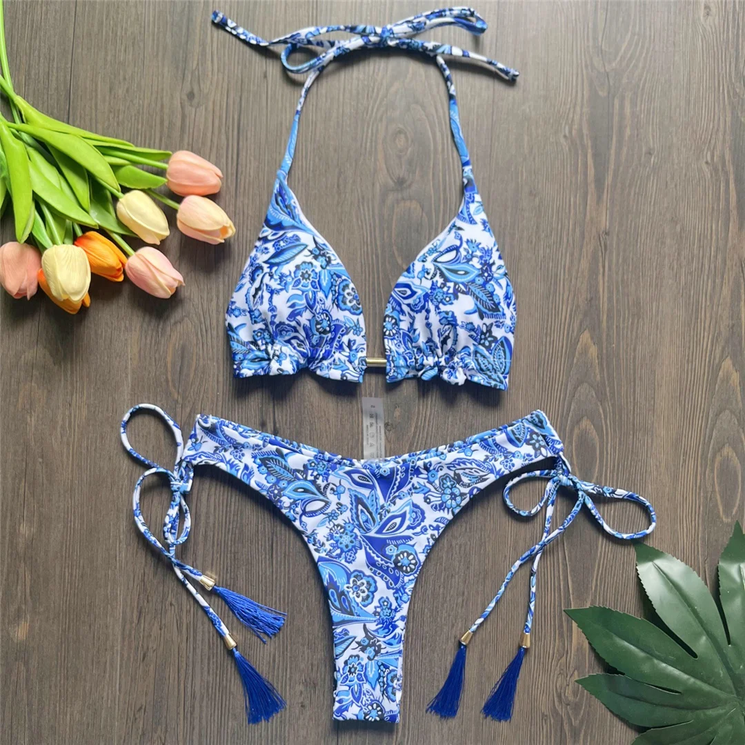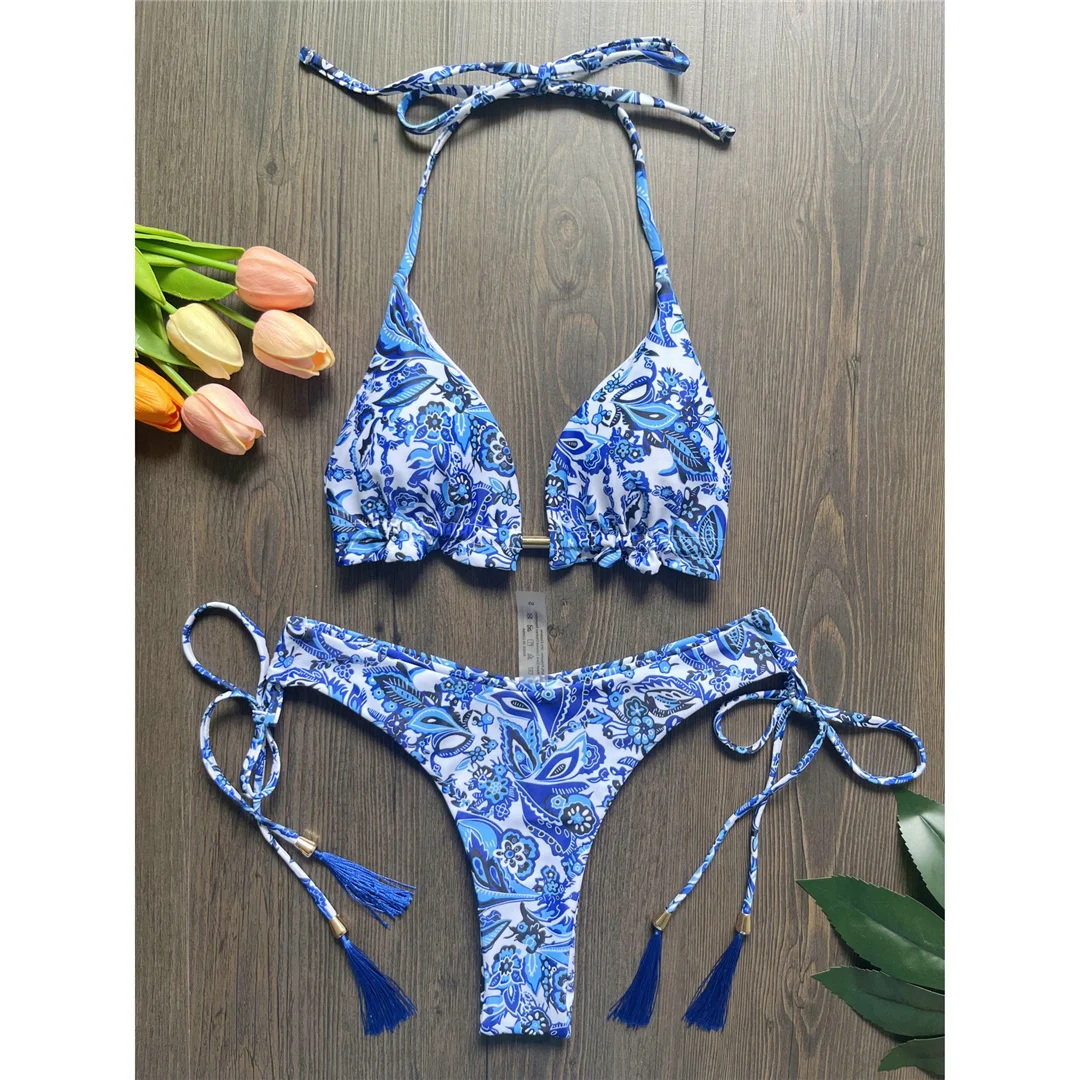 Sexy Flowers Printed Halter Brazilian Bikini Female Swimsuit Women Swimwear Two-pieces Bikini set Bather Bathing Suit Swim V6070