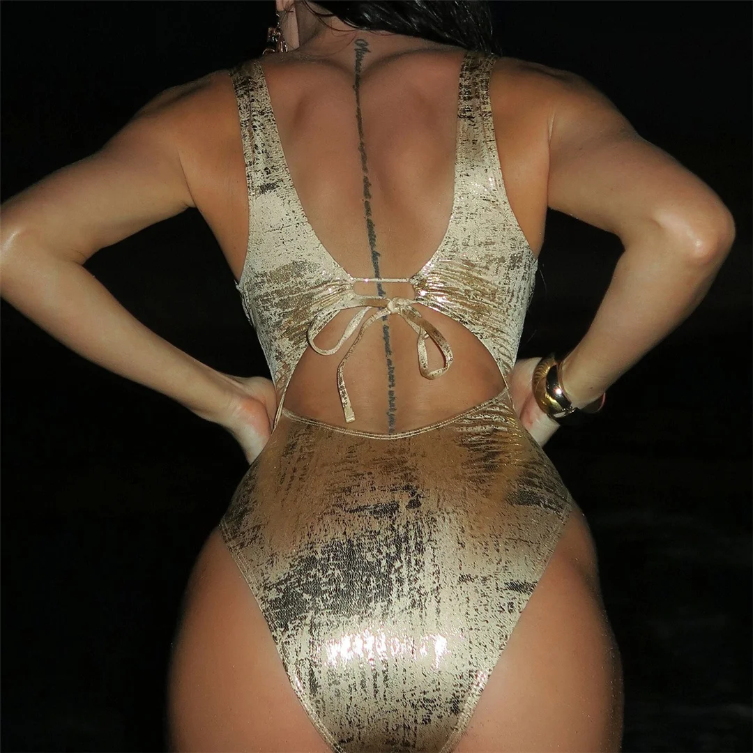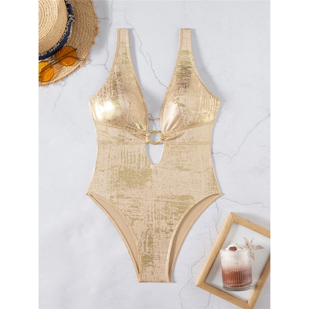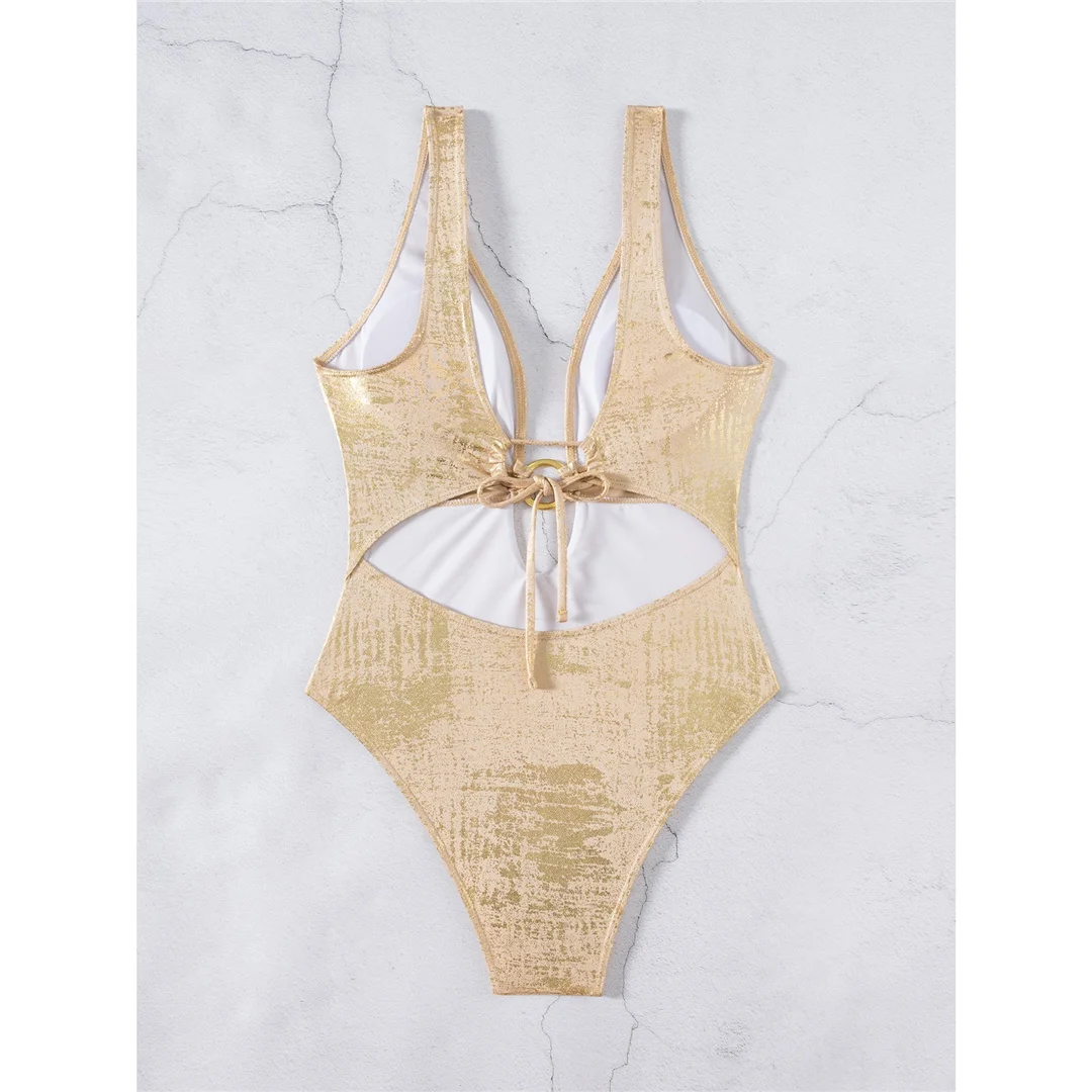 Sexy Golden Deep V Neck High Cut Leg Backless One Piece Swimsuit Women Swimwear Female Monokini Bather Bathing Suit Swim V6690