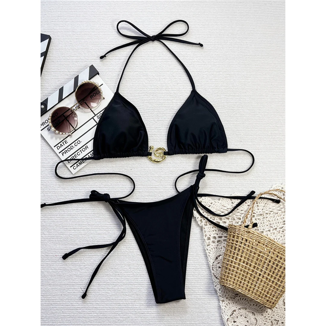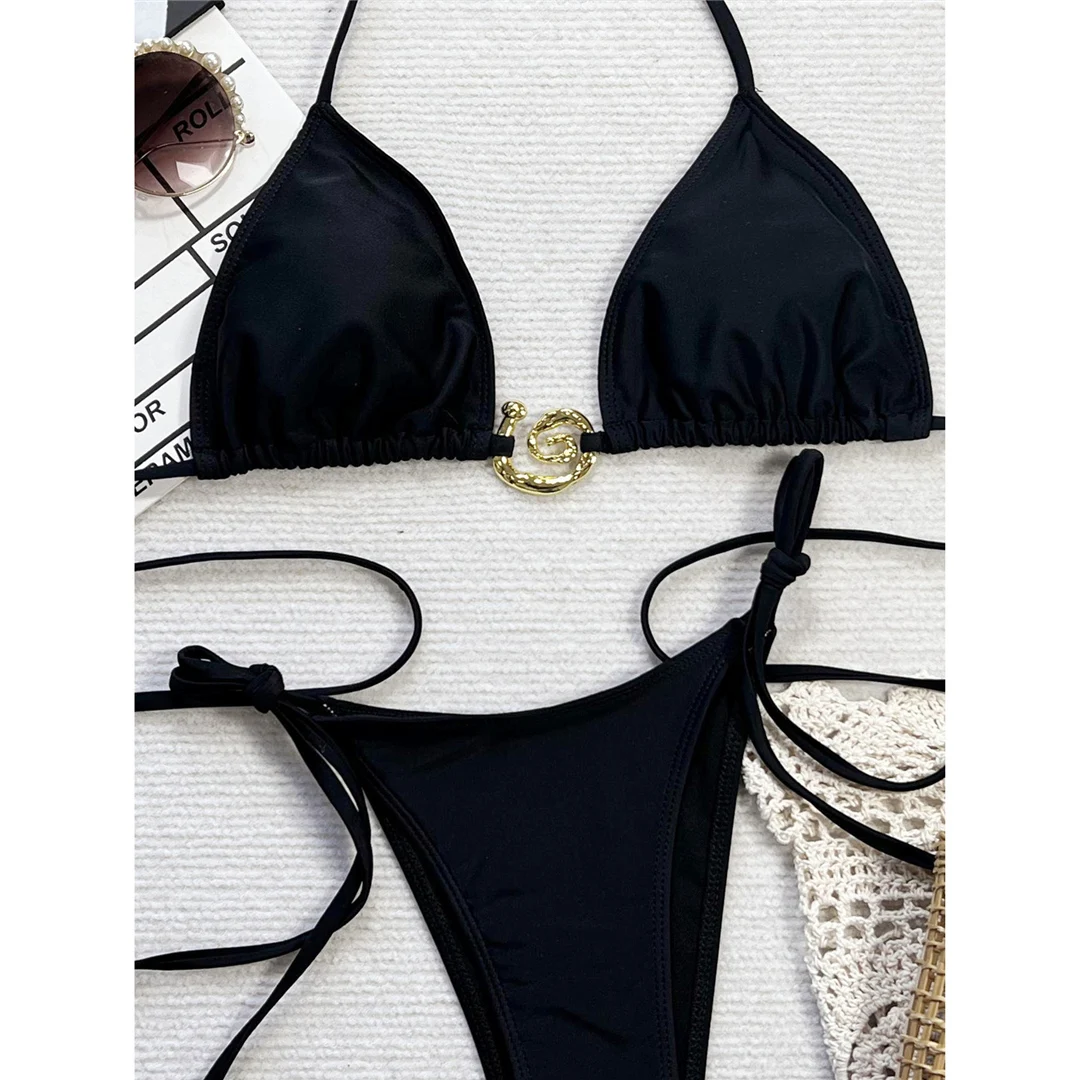 Sexy Halter Metal Ring High Leg Cut Bikini Women Swimwear Female Swimsuit Two-pieces Bikini set Bather Bathing Suit Swim V6268