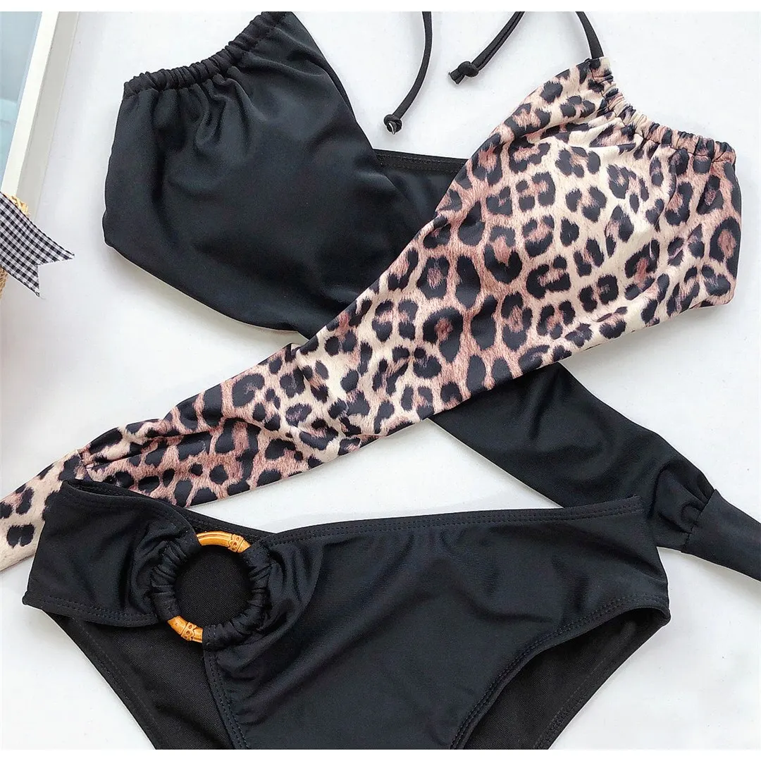 Sexy Mid Waist Splicing Leopard Bikini Female Swimsuit Women Swimwear Two-pieces Bikini set Bather Bathing Suit Swim Lady V2148