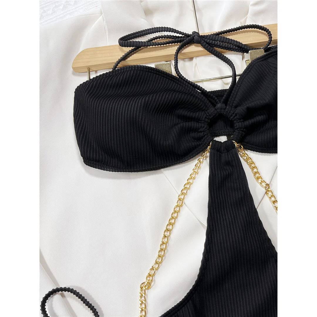 Sexy Ribbed Halter Metal Chains One Piece Swimsuit Women Swimwear Female Monokini High Leg Cut Bather Bathing Suit Swim V4572