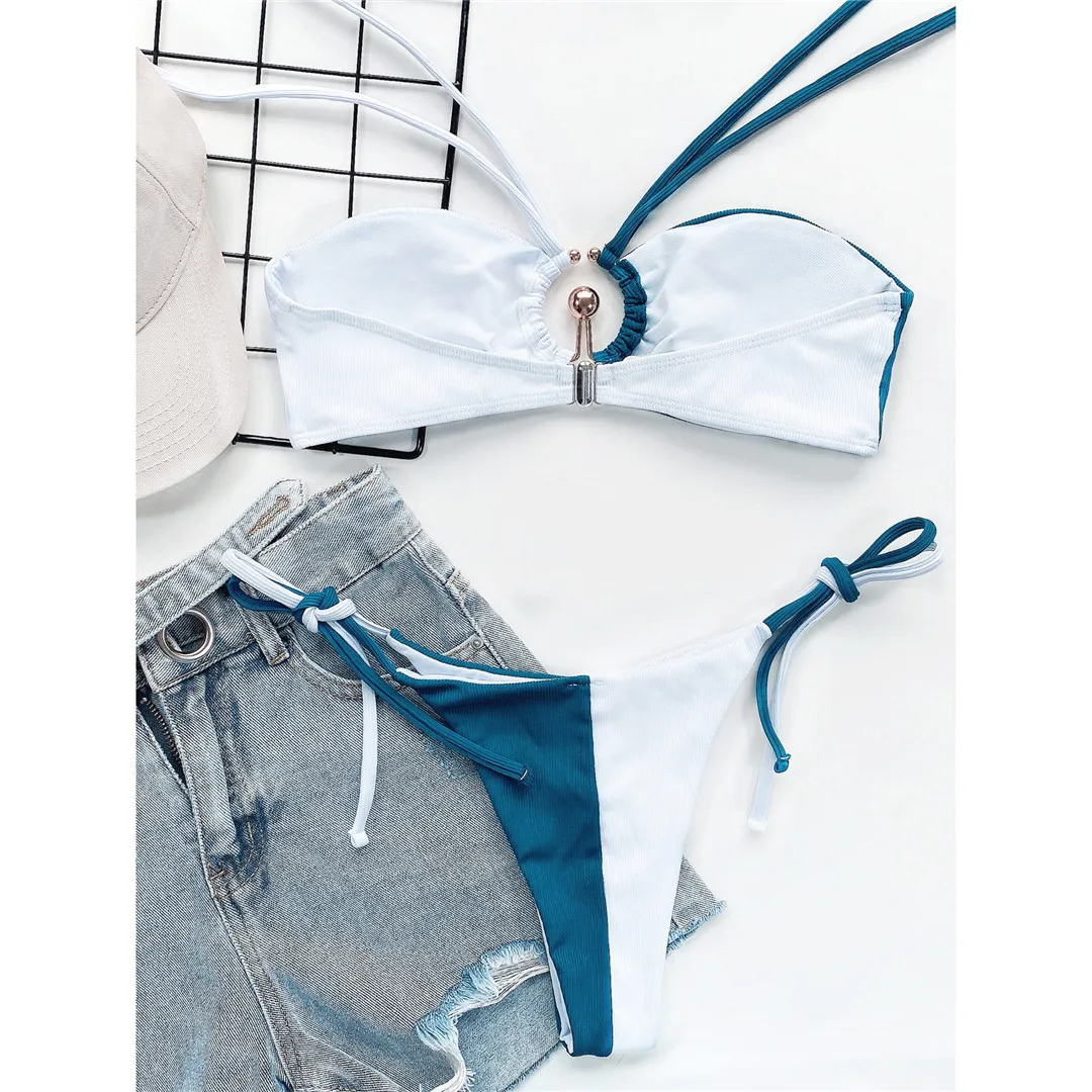 Sexy Ribbed Splicing Halter Bikini Women Swimwear Female Swimsuit Two-pieces Bikini set Bather Strappy Bathing Suit Swim V3134