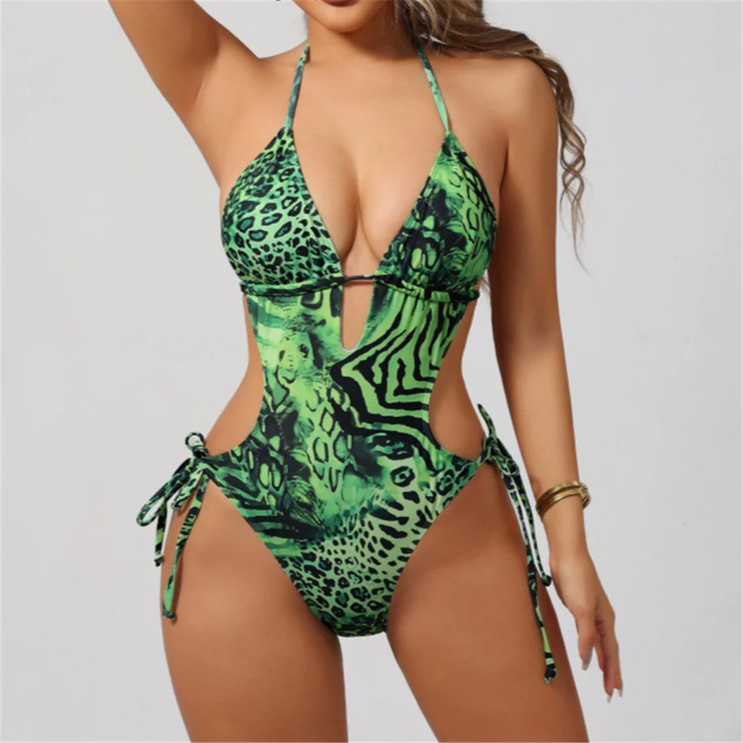 Sexy S – XL Leopard Halter Deep V Neck Cut Out Women Swimwear One Piece Swimsuit Female Backless Bather Bathing Suit Swim V7426