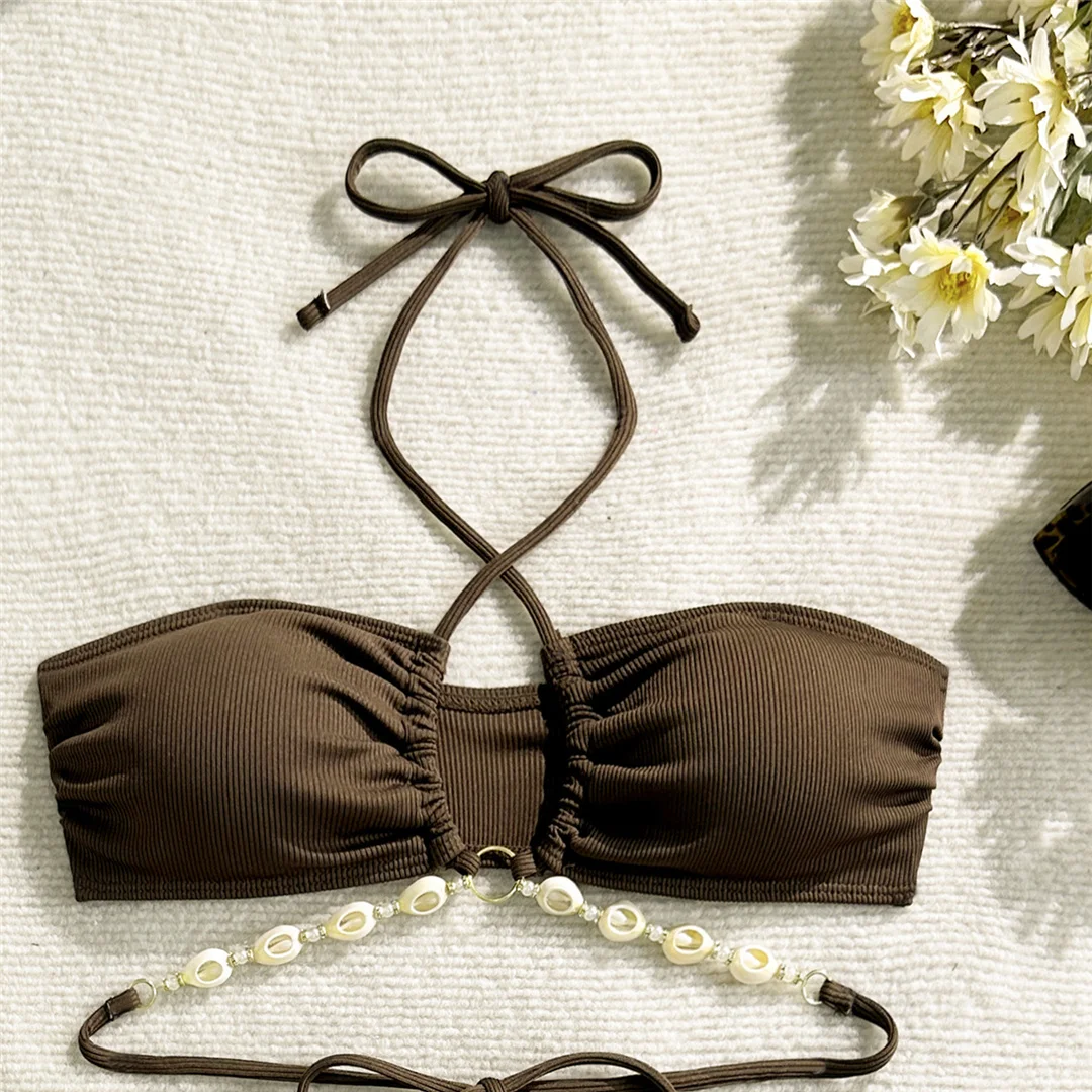 Sexy Shell Ribbed Halter High Cut Leg Bikini Women Swimwear Female Swimsuit Two-pieces Bikini set Bather Bathing Suit Swim V6968