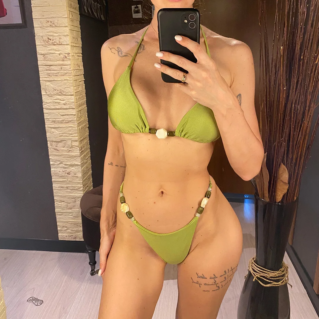 Sexy Shiny Halter High Leg Cut Bikini Women Swimwear Female Swimsuit Two-pieces Bikini set Padded Bather Bathing Suit Swim V6601