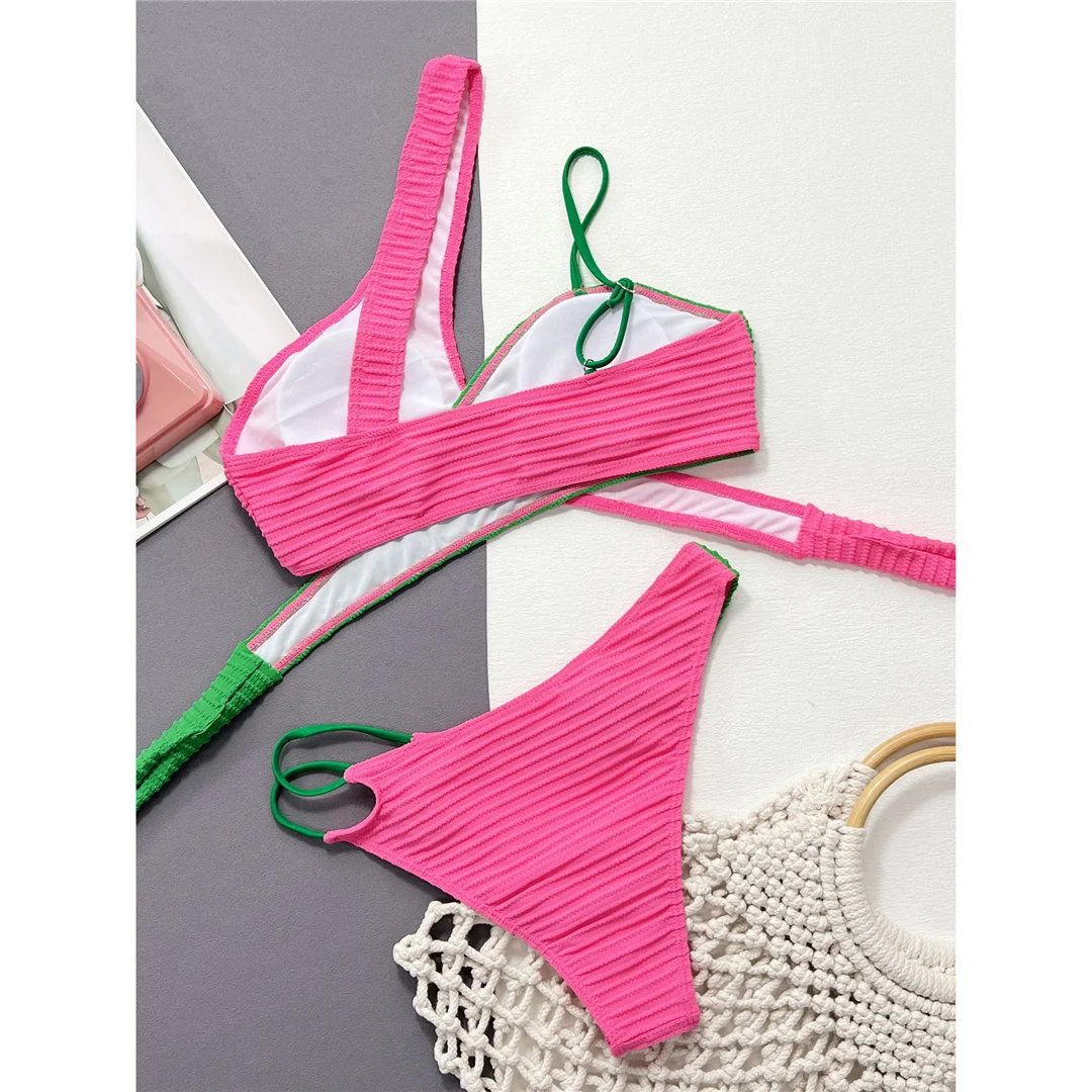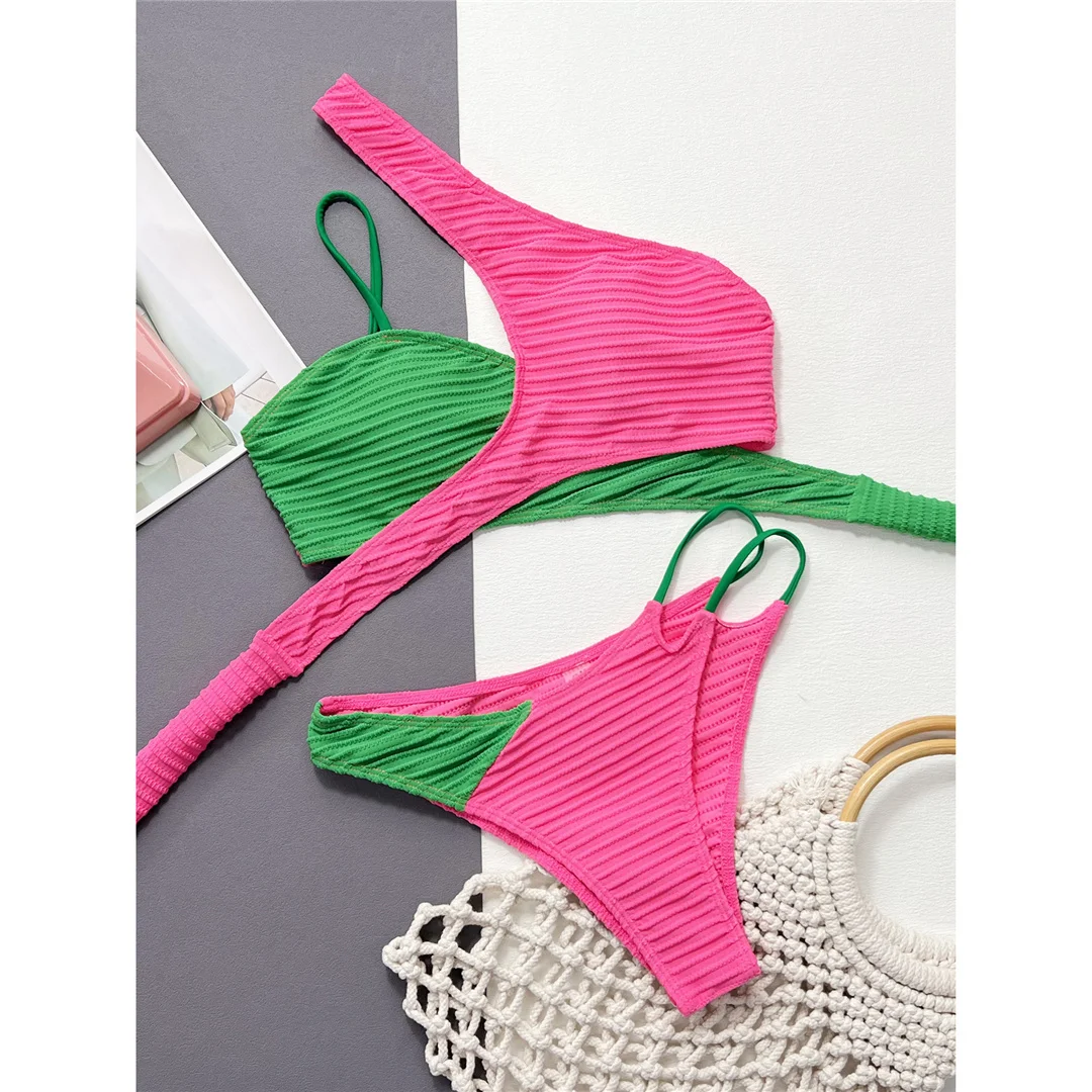 Sexy Splicing One Shoulder Mid Waist Bikini Women Swimwear Female Swimsuit Two-pieces Bikini set Bather Bathing Suit Swim V4618
