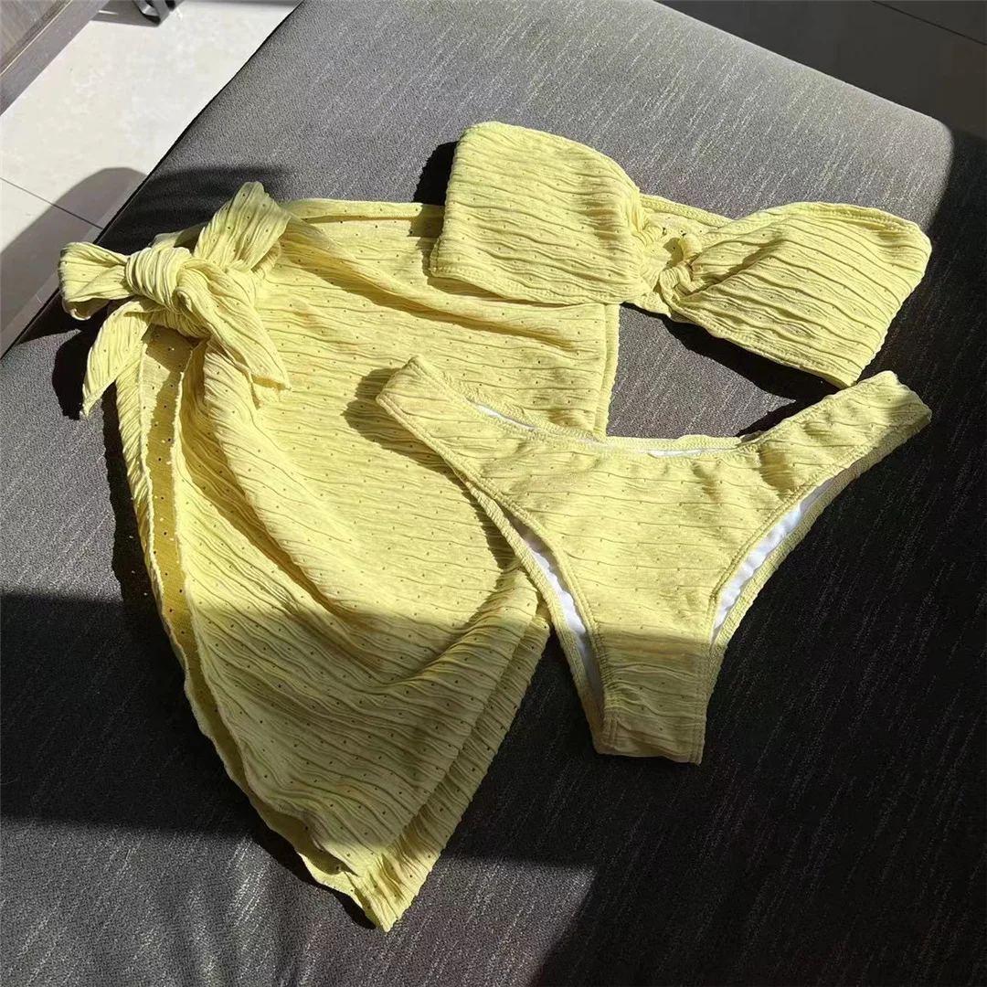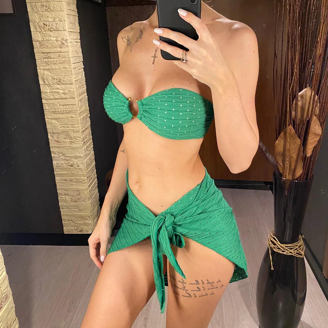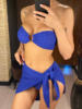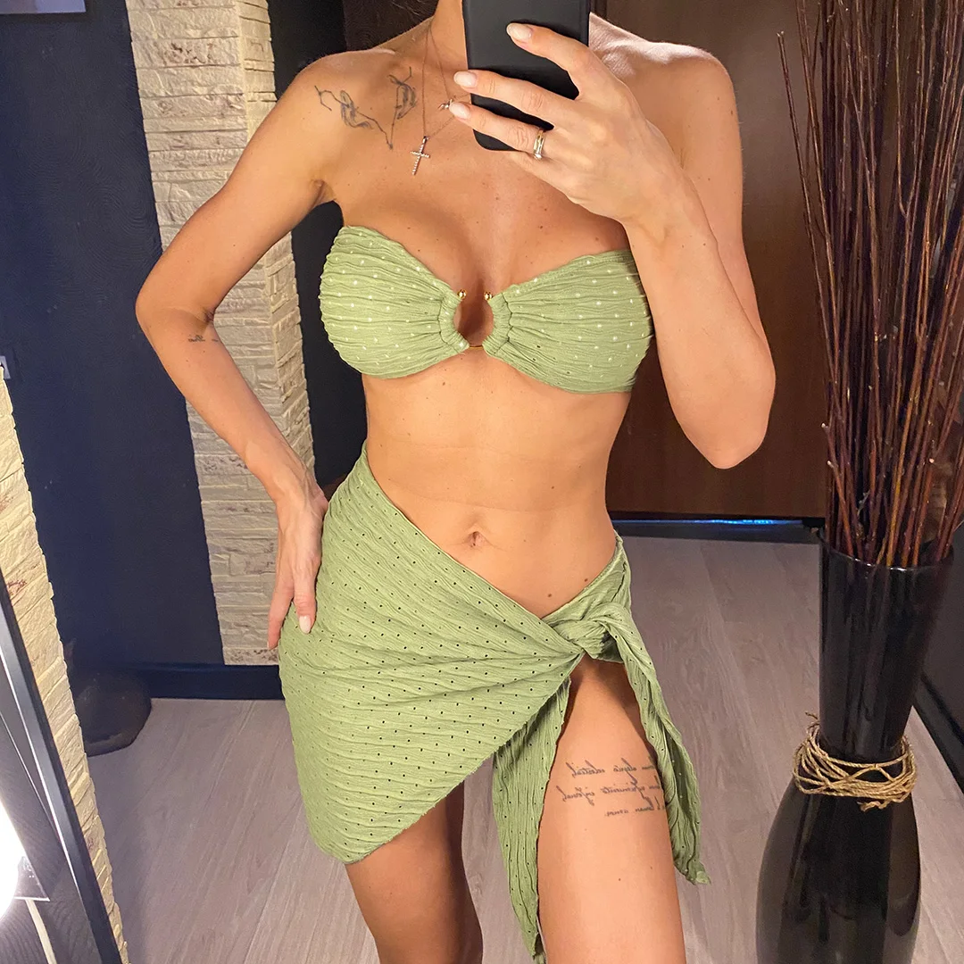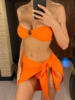 Sexy With Sarong Bandeau Mid Waist Bikini Female Swimsuit Women Swimwear Three-pieces Bikini set Bather Bathing Suit Swim V4242