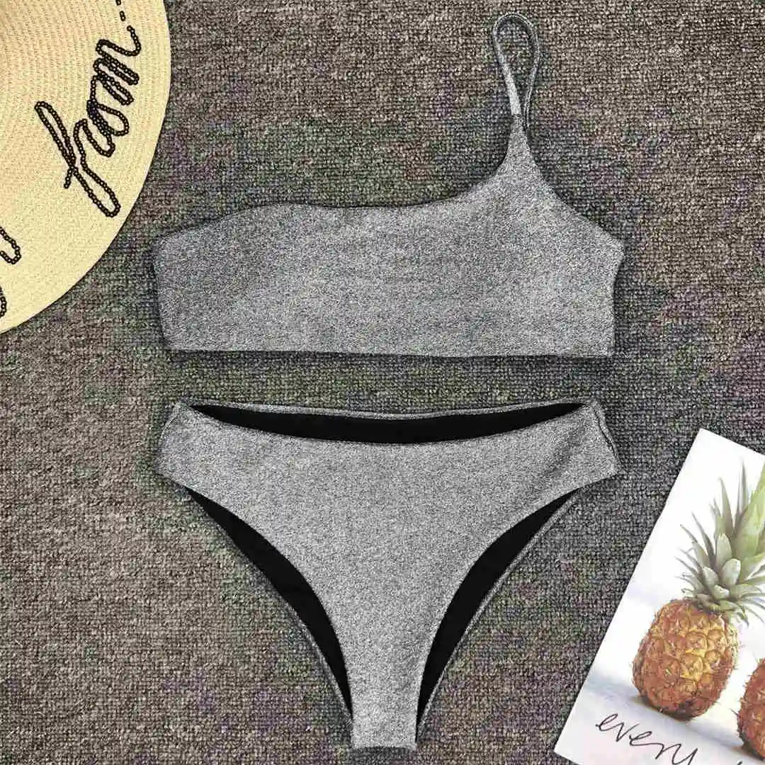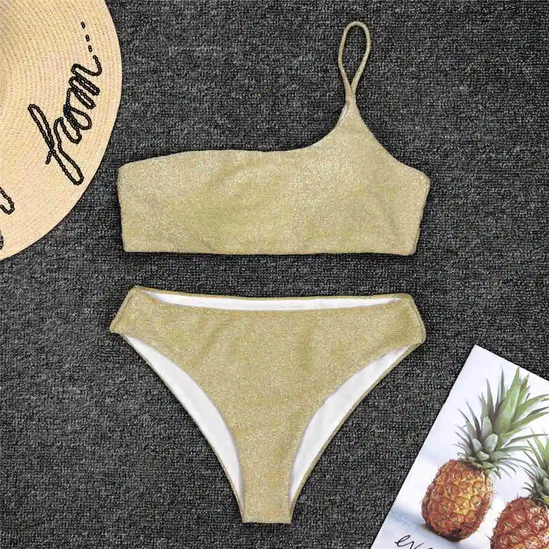Shiny Glitter Sparkling High Waist Bikini Female Swimsuit Women Swimwear Two-pieces Bikini set One Shoulder Bathing Suit V1264