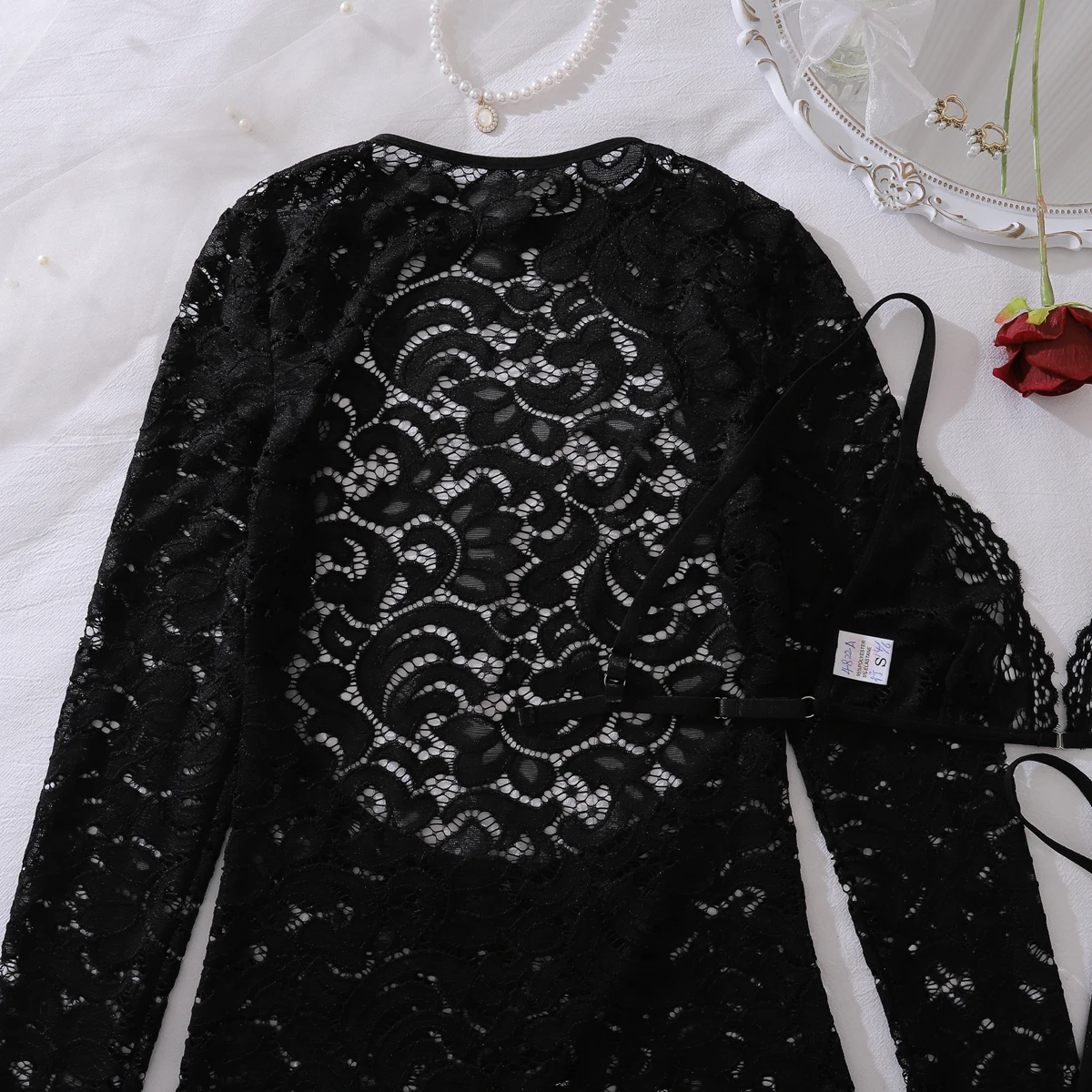Spicy Girl Perspective Lace Hollow Cover Shirt Shapes Body and Looks Thinner, Bagging Hip Skirt Paired with Sexy Underwear 3-Pie